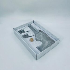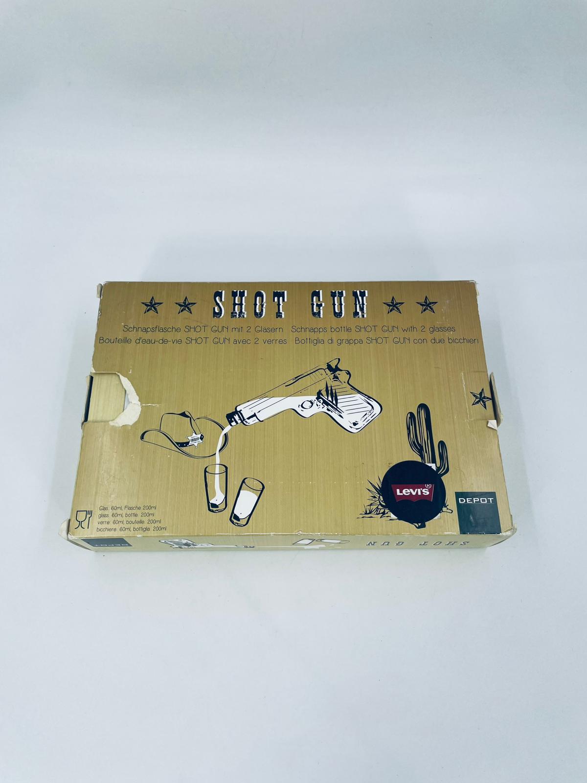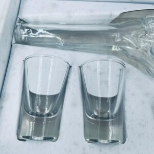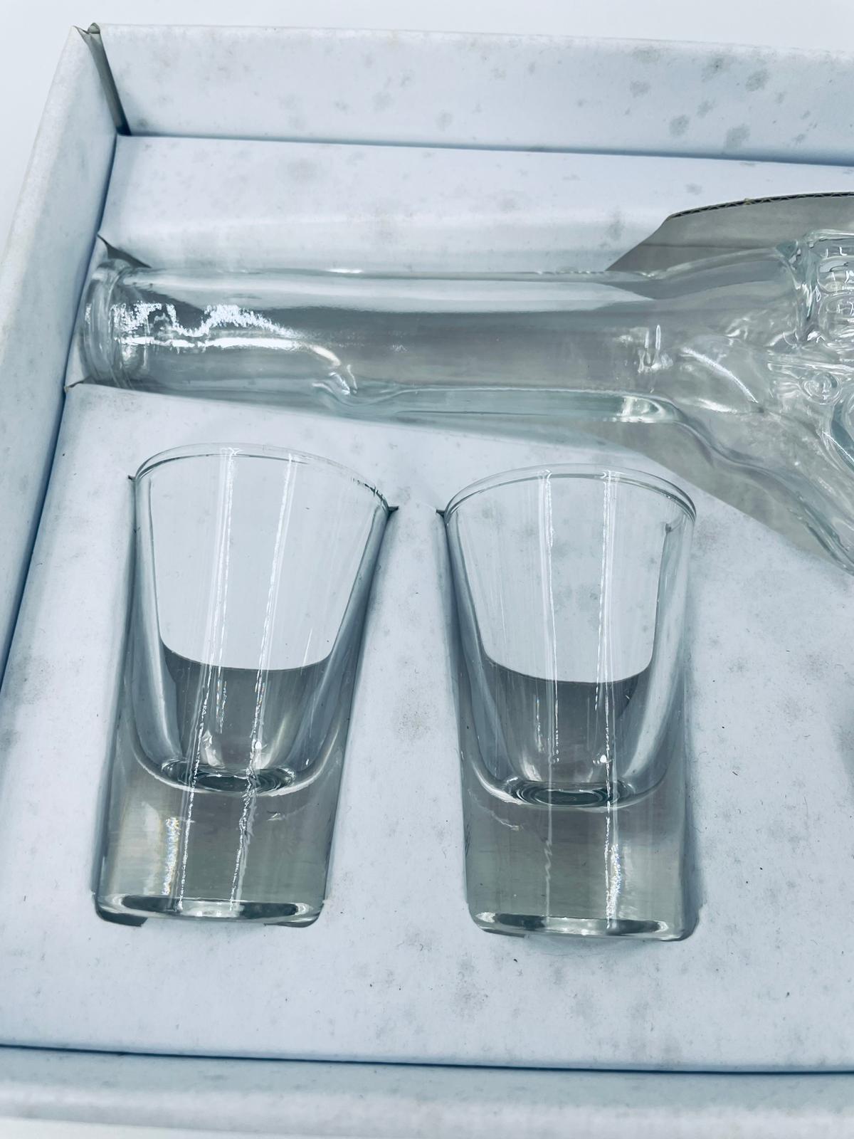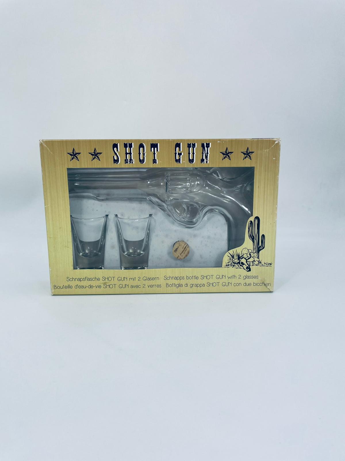 Zestaw „Schot Gun” w stylu Vintage, wykonany z wysokiej jakości przezroczystego szkła. Zestaw zawiera karafkę w kształcie leworweru, korek oraz dwa kieliszki. Idealny zestaw prezentowy.