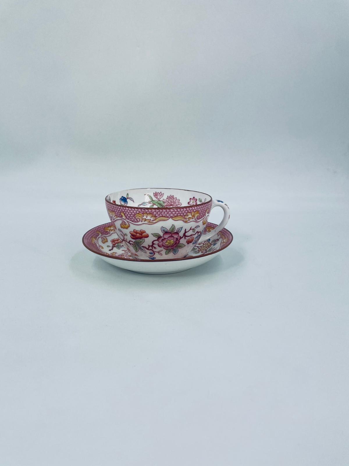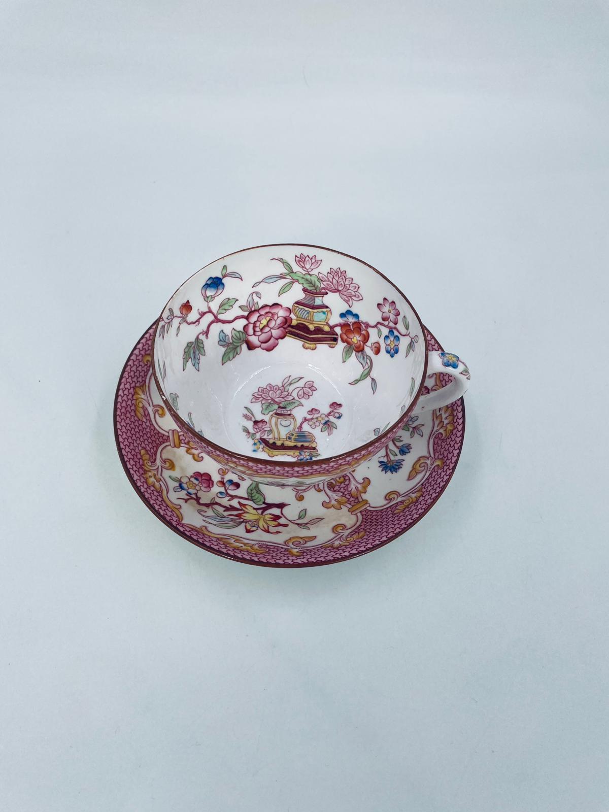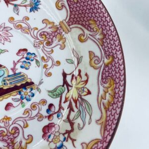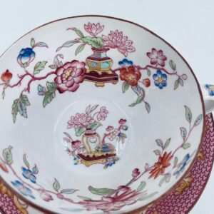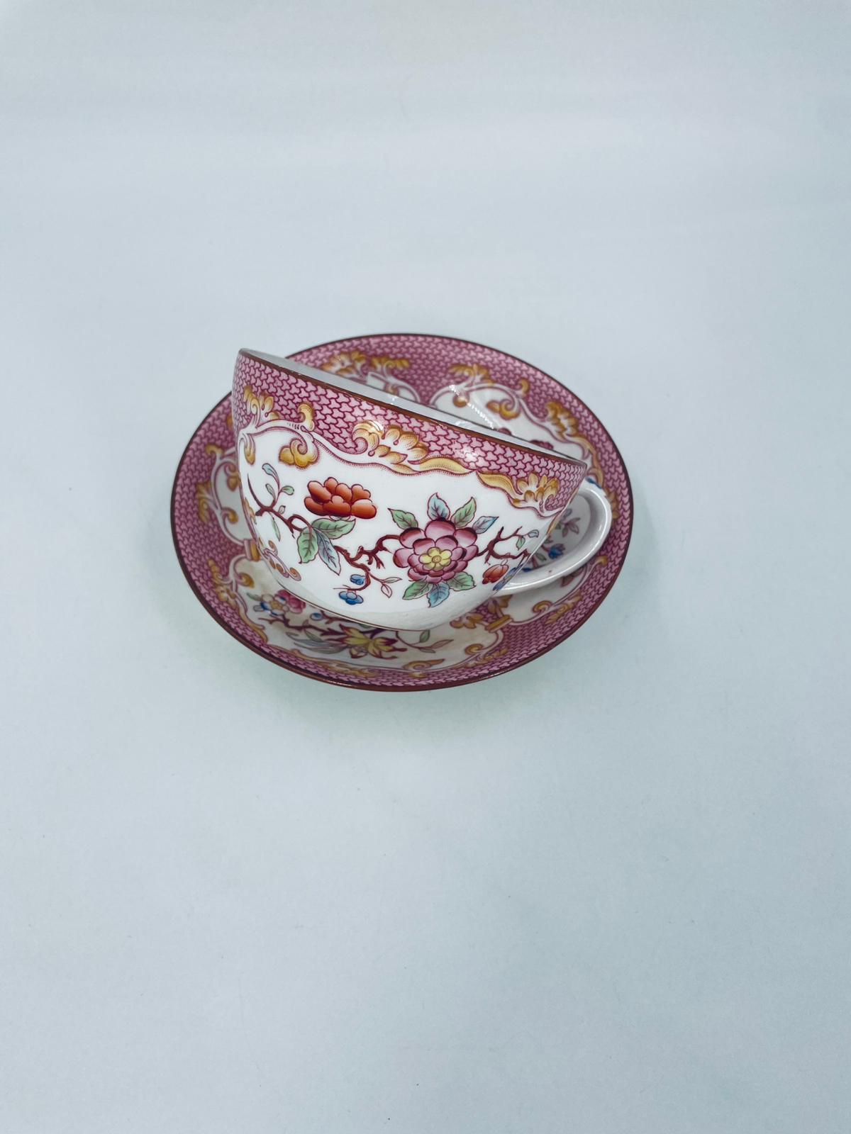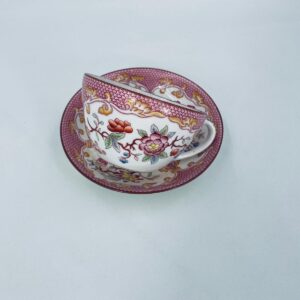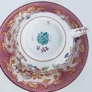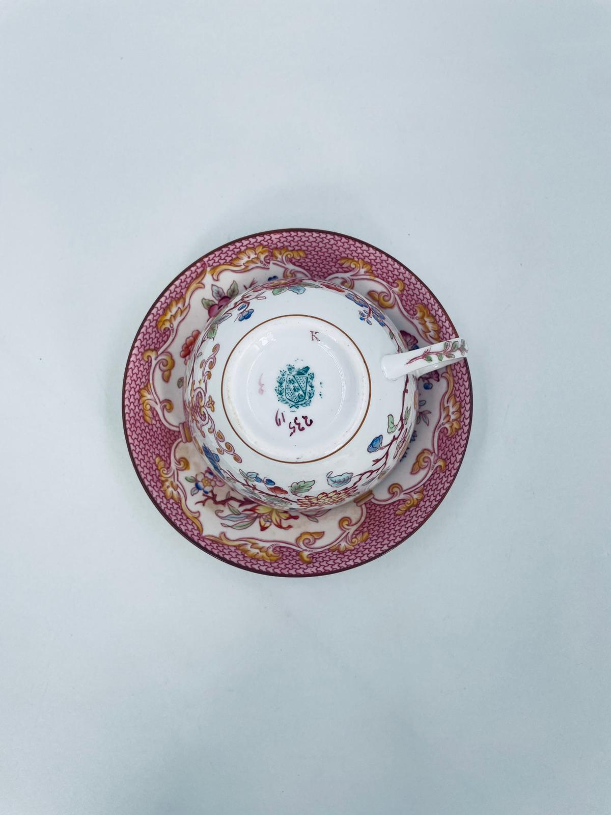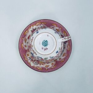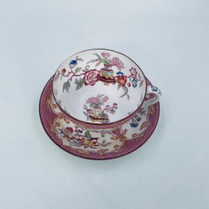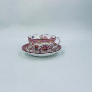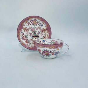Antyczna filiżanka kolekcjonerska w zestawie duo, wytwórni Sarreguemines Minton z 1860r., wykonana z najwyższej jakości białej porcelany glazurowanej. Zestaw charakteryzuje się ręcznie malowana dekoracją w odcieniu różu w stylu „japonizmu” w motywach orientalnych z dalekiego wschodu, wykończony kolorem brązowym na krawędziach. Filiżanka posiada piękny, dekoracyjny uchwyt. Posiada drobne przetarcie na rancie oraz przebarwienie na spodku.