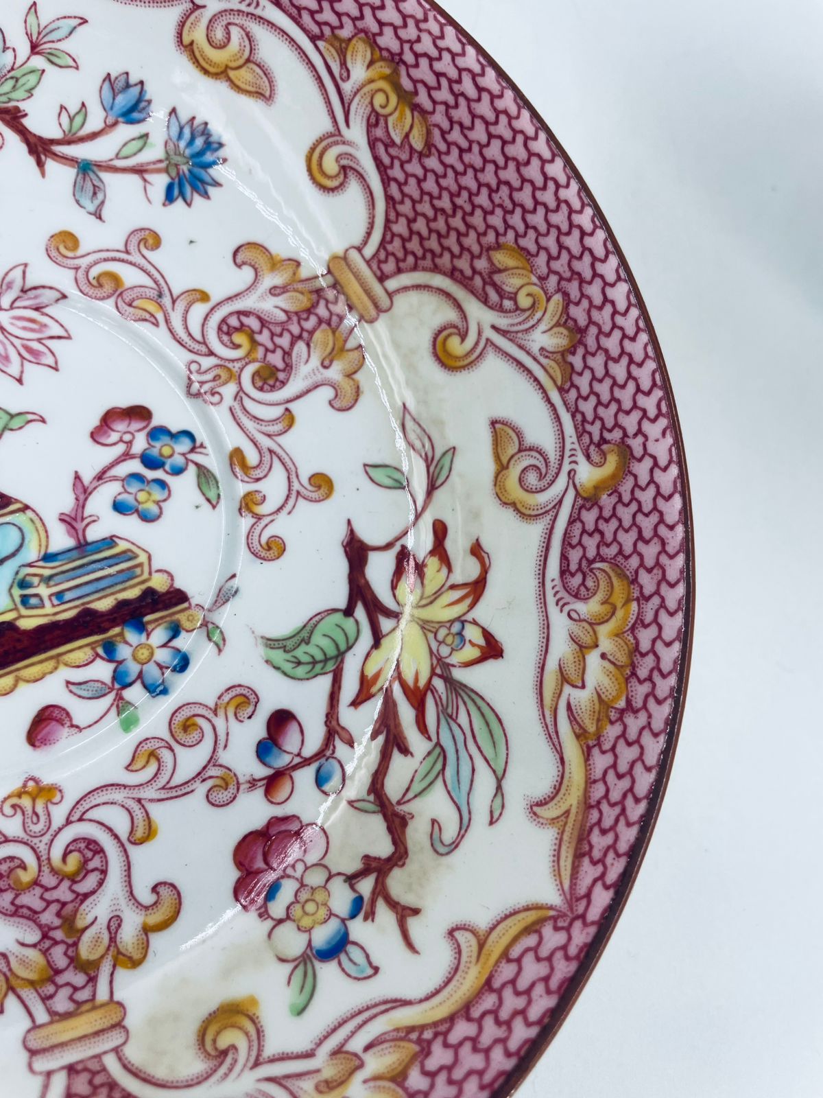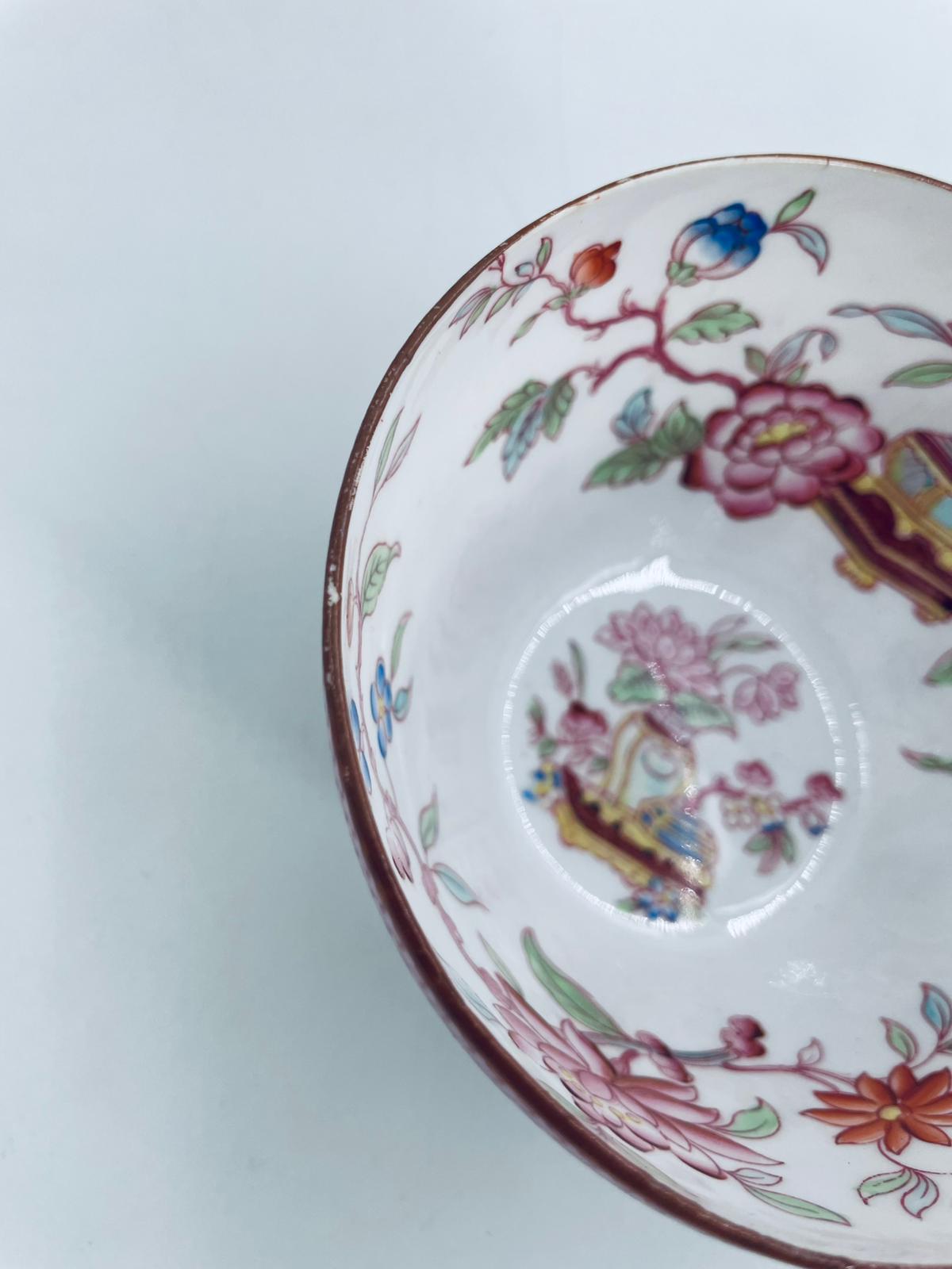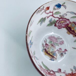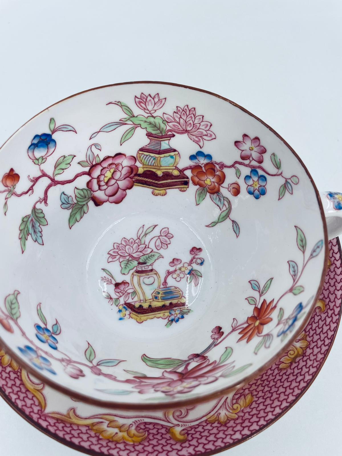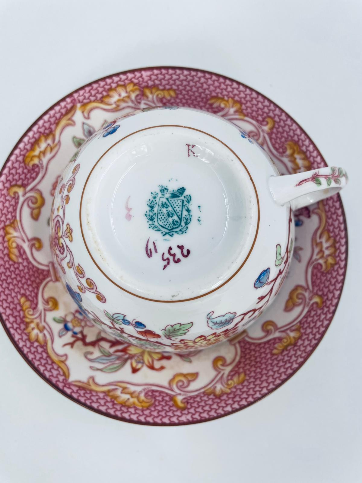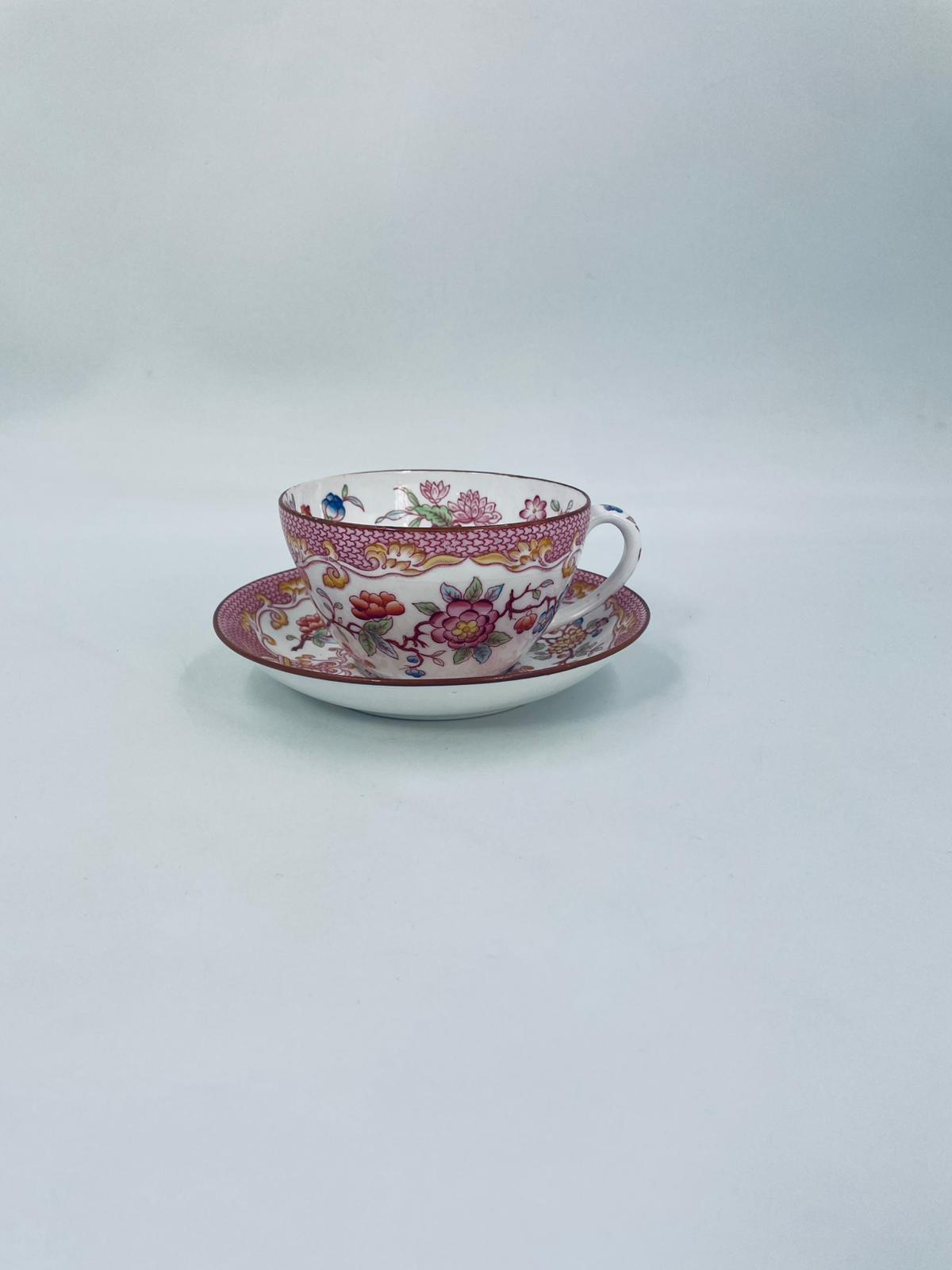 Antyczna filiżanka kolekcjonerska w zestawie duo, wytwórni Sarreguemines Minton z 1860r., wykonana z najwyższej jakości białej porcelany glazurowanej. Zestaw charakteryzuje się ręcznie malowana dekoracją w odcieniu różu w stylu „japonizmu” w motywach orientalnych z dalekiego wschodu, wykończony kolorem brązowym na krawędziach. Filiżanka posiada piękny, dekoracyjny uchwyt. Posiada drobne przetarcie na rancie oraz przebarwienie na spodku.