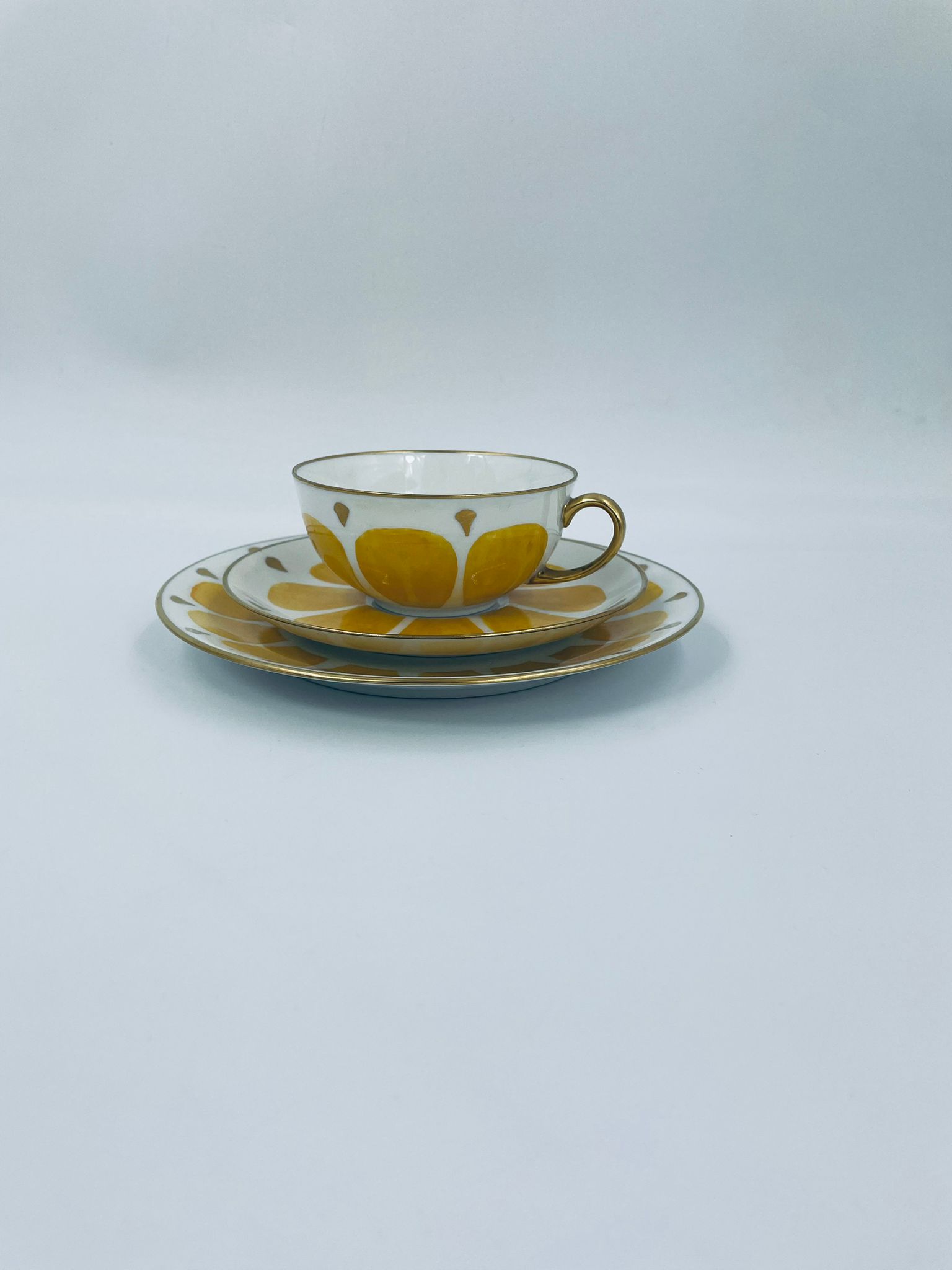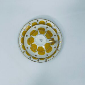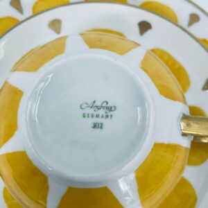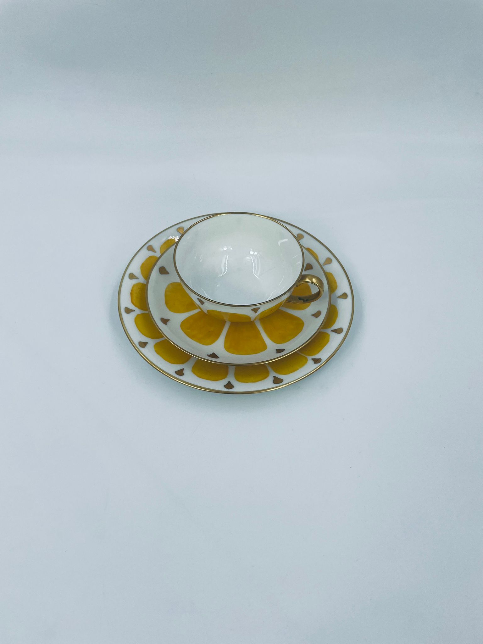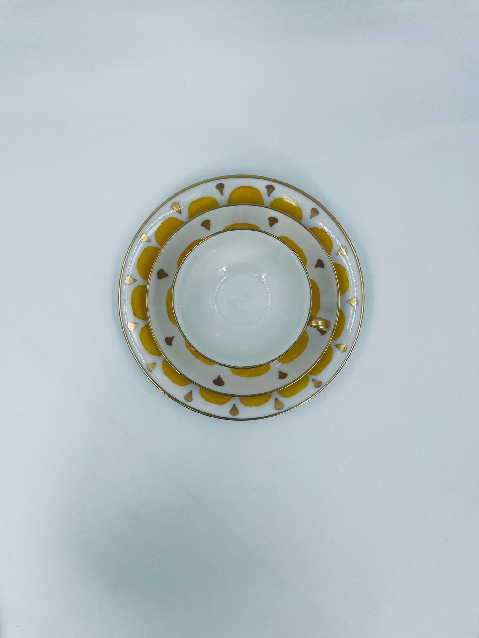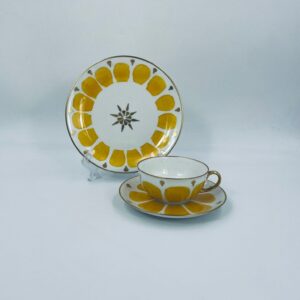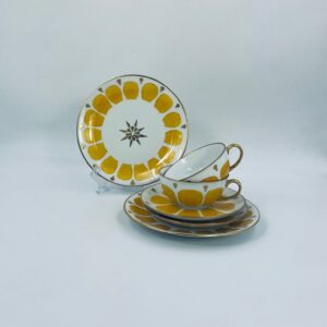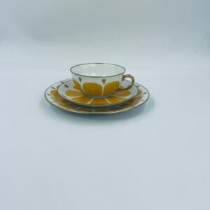 Filiżanka kolekcjonerska w zestawie trio wytwórni Arzberg, wykonana z wysokiej jakości białej porcelany. Zestaw charakteryzuje się ręcznie malowanymi złotymi wzorami w kształcie płatków, złotymi akcentami, wykończony złoceniem na rantach. Jedna filiżanka posiada delikatne pęknięcie, oraz przetarcie na zloceniu