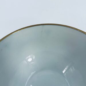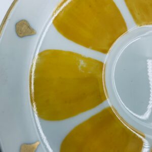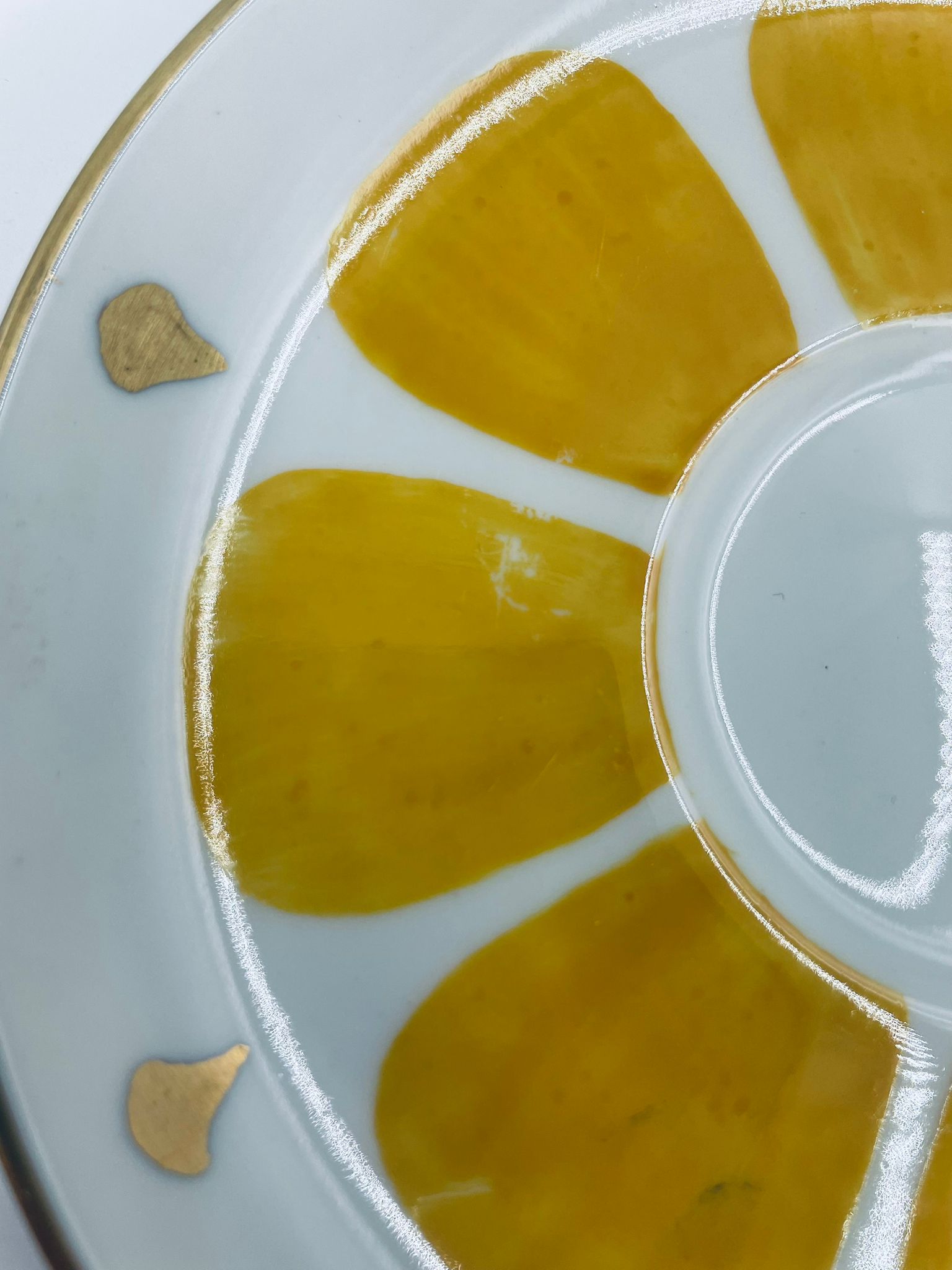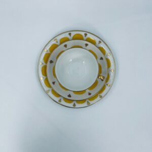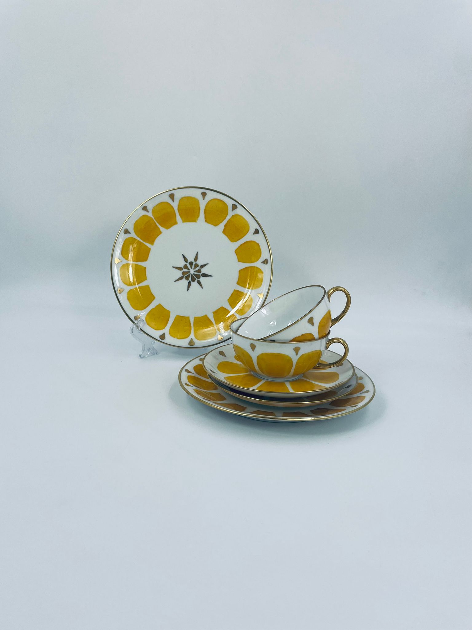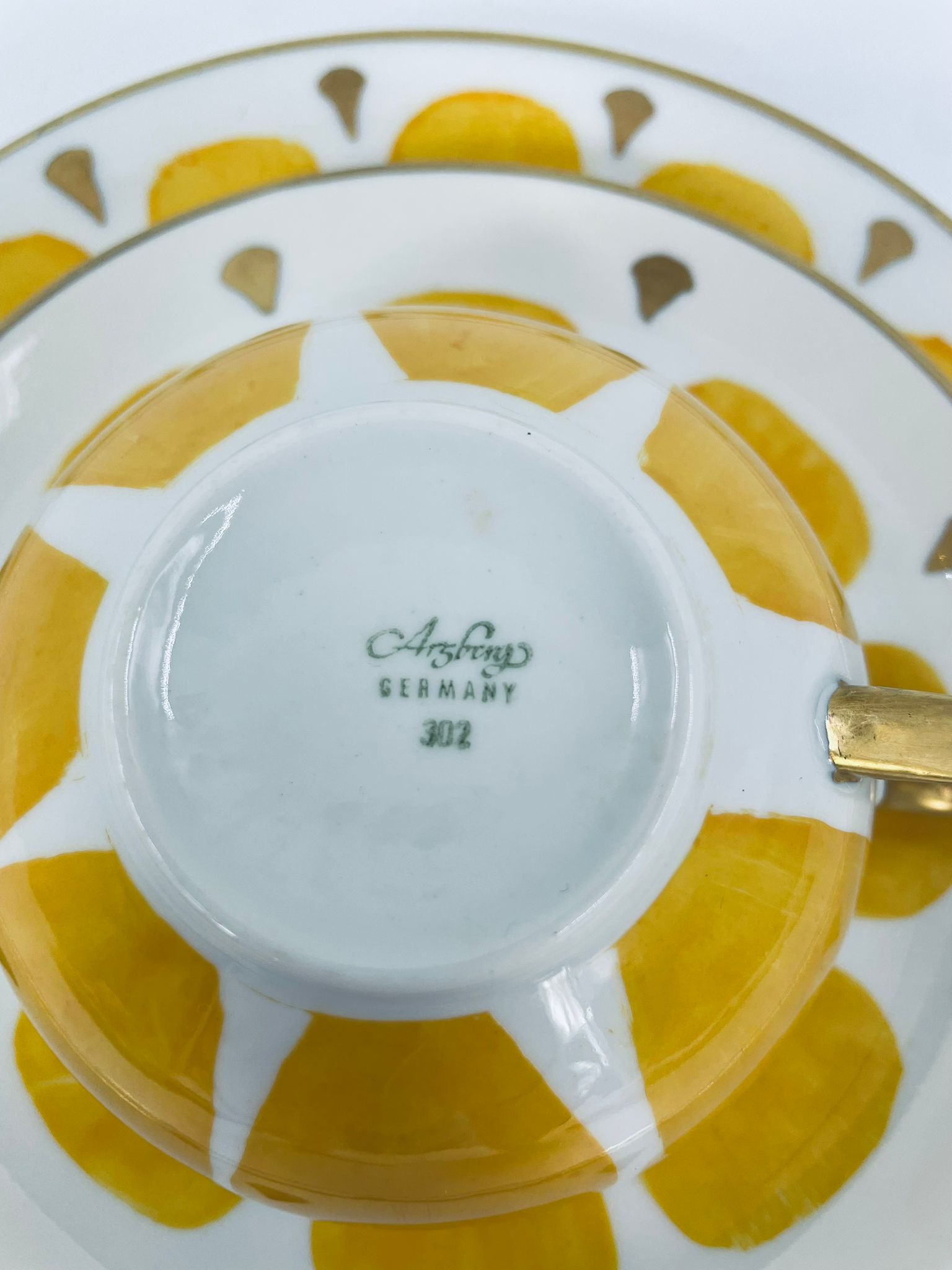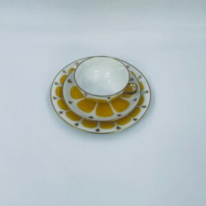 Filiżanka kolekcjonerska w zestawie trio wytwórni Arzberg, wykonana z wysokiej jakości białej porcelany. Zestaw charakteryzuje się ręcznie malowanymi złotymi wzorami w kształcie płatków, złotymi akcentami, wykończony złoceniem na rantach. Jedna filiżanka posiada delikatne pęknięcie, oraz przetarcie na zloceniu