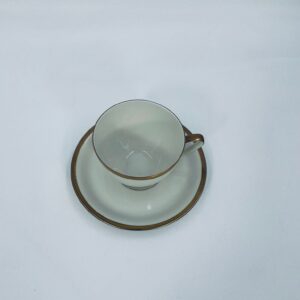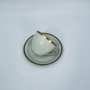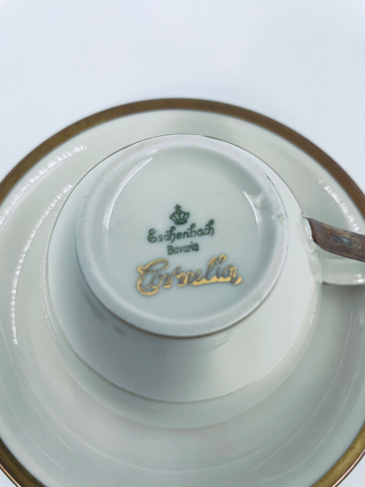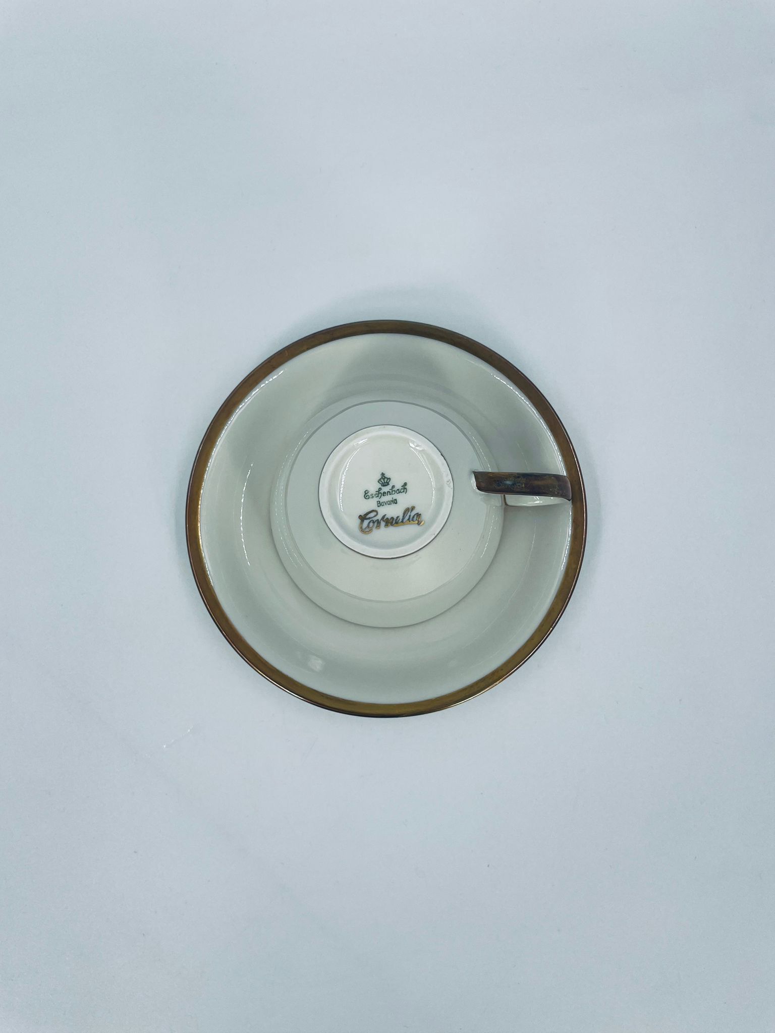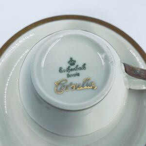 Filiżanka kolekcjonerska w zestawie duo wytwórni Eschenbach, kolekcji Cornelia, wykonana z wysokiej jakości porcelany w kolorze Ecru. Klasyczny, elegancki zestaw, wykończony złoceniem na rantach. Posiada przetarcia na złoceniu.