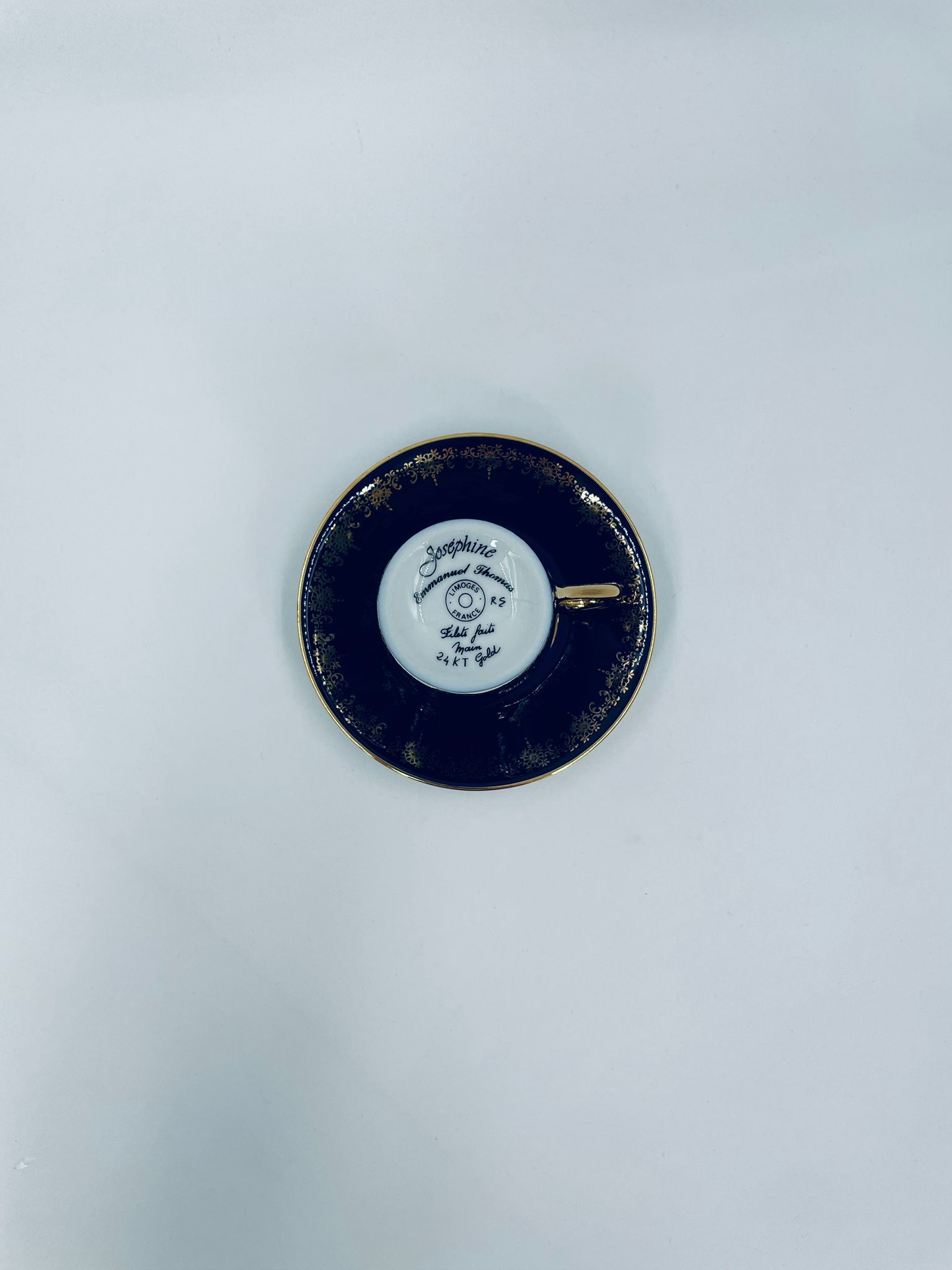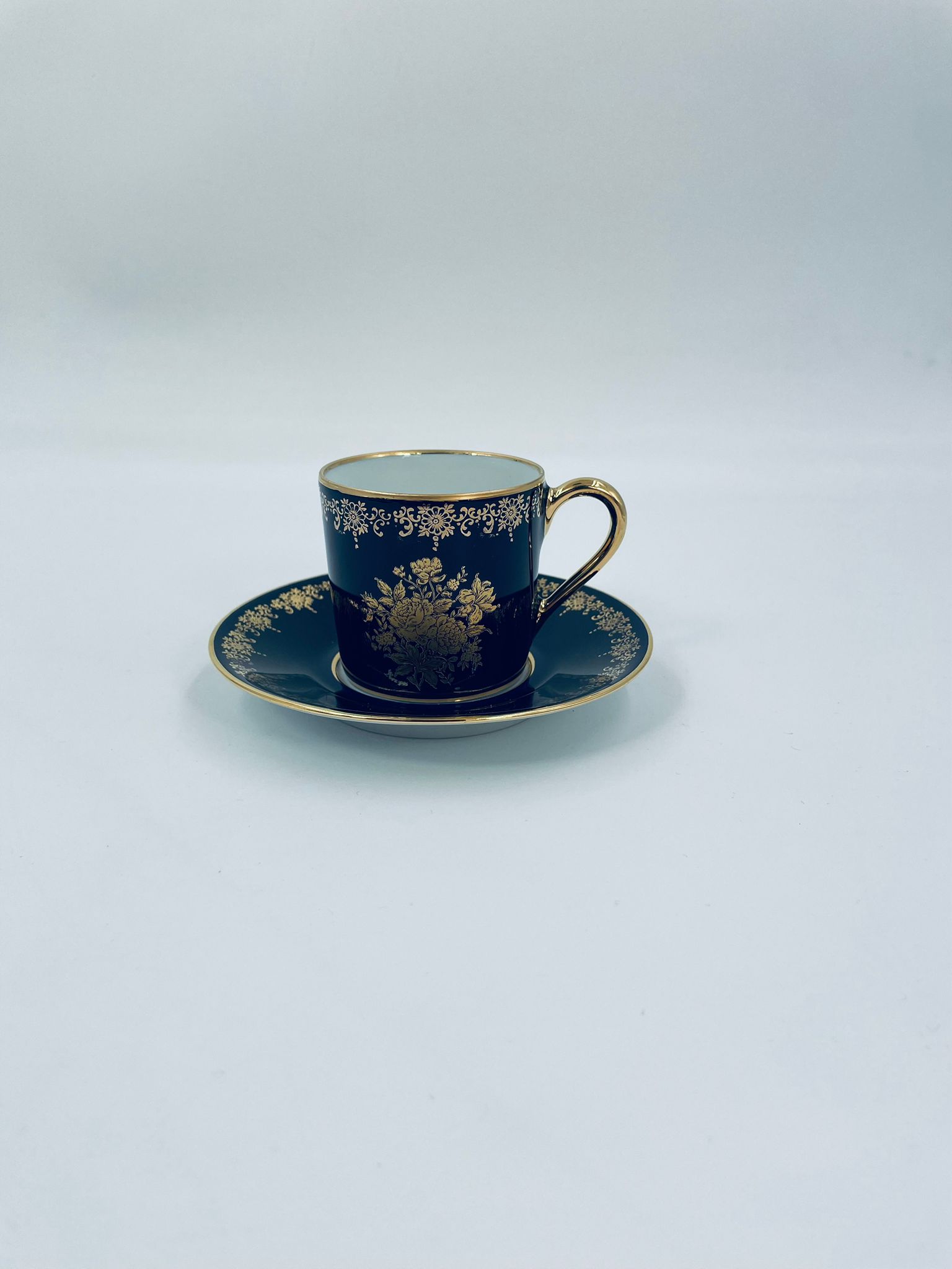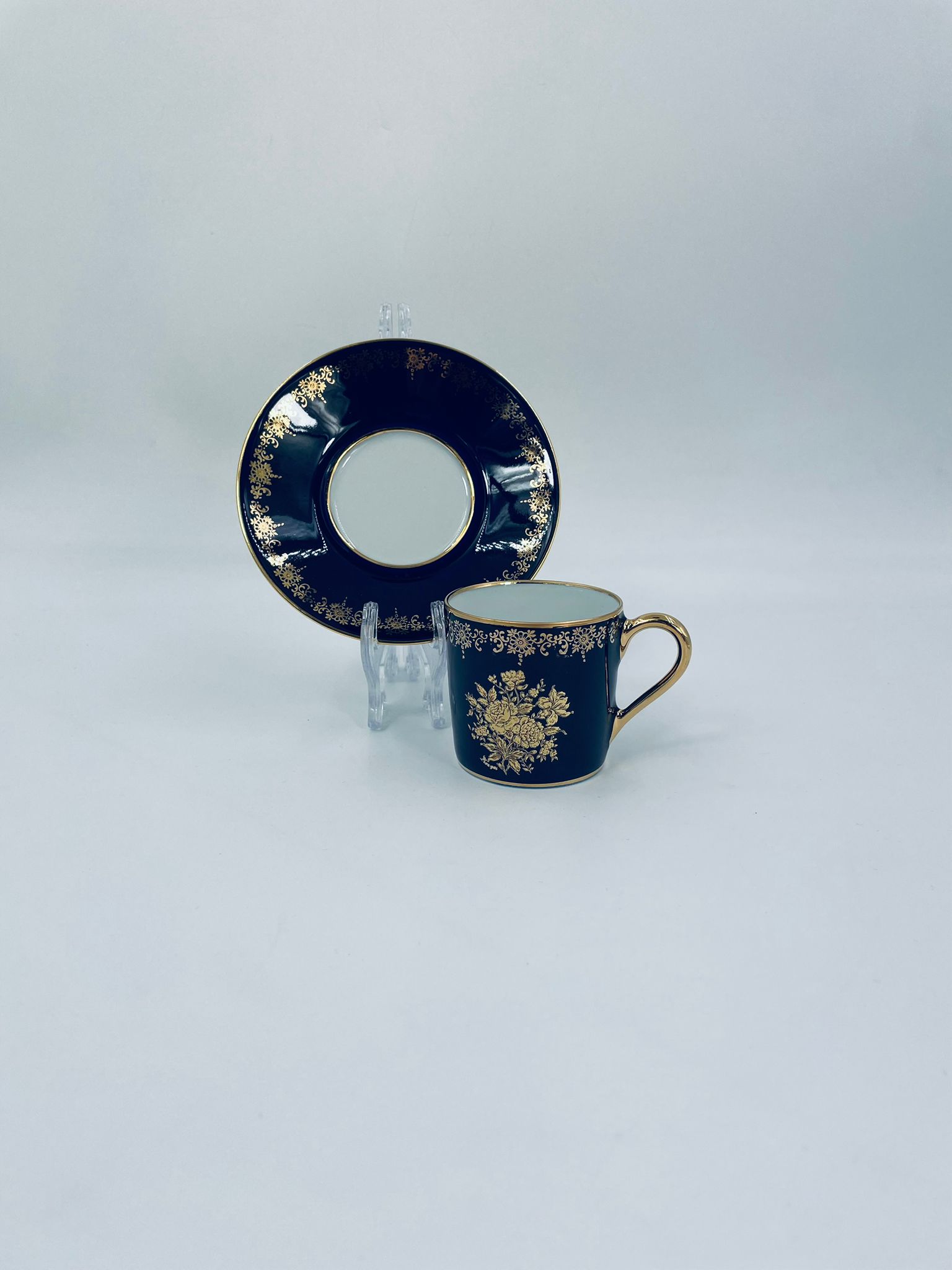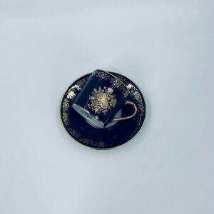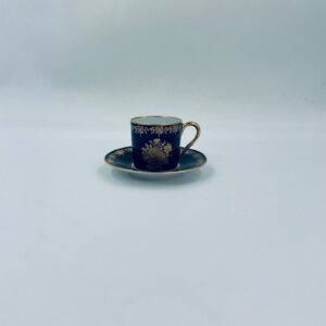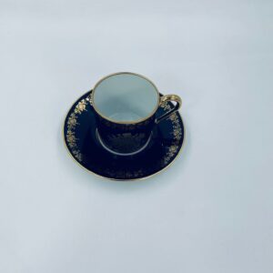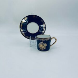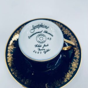 Filiżanka kolekcjonerska w zestawie duo wytwórni Josephine Emmanuel Thomas Limoges France, wykonana z najwyższej jakości porcelany. Zestaw charakteryzuje się pięknym kobaltowym kolorem oraz 24karatowym złotym zdobieniem z motywem kwiatowym.