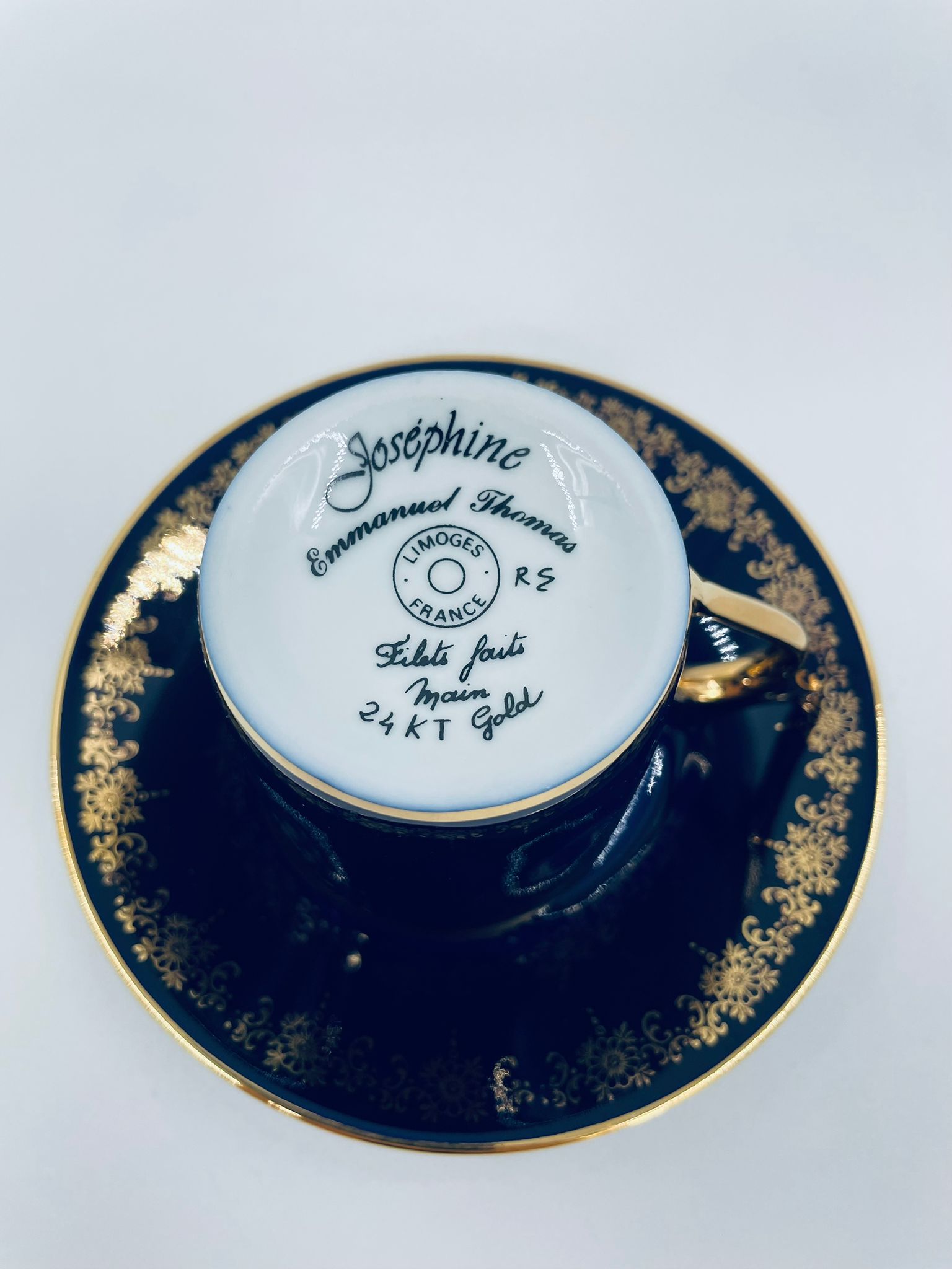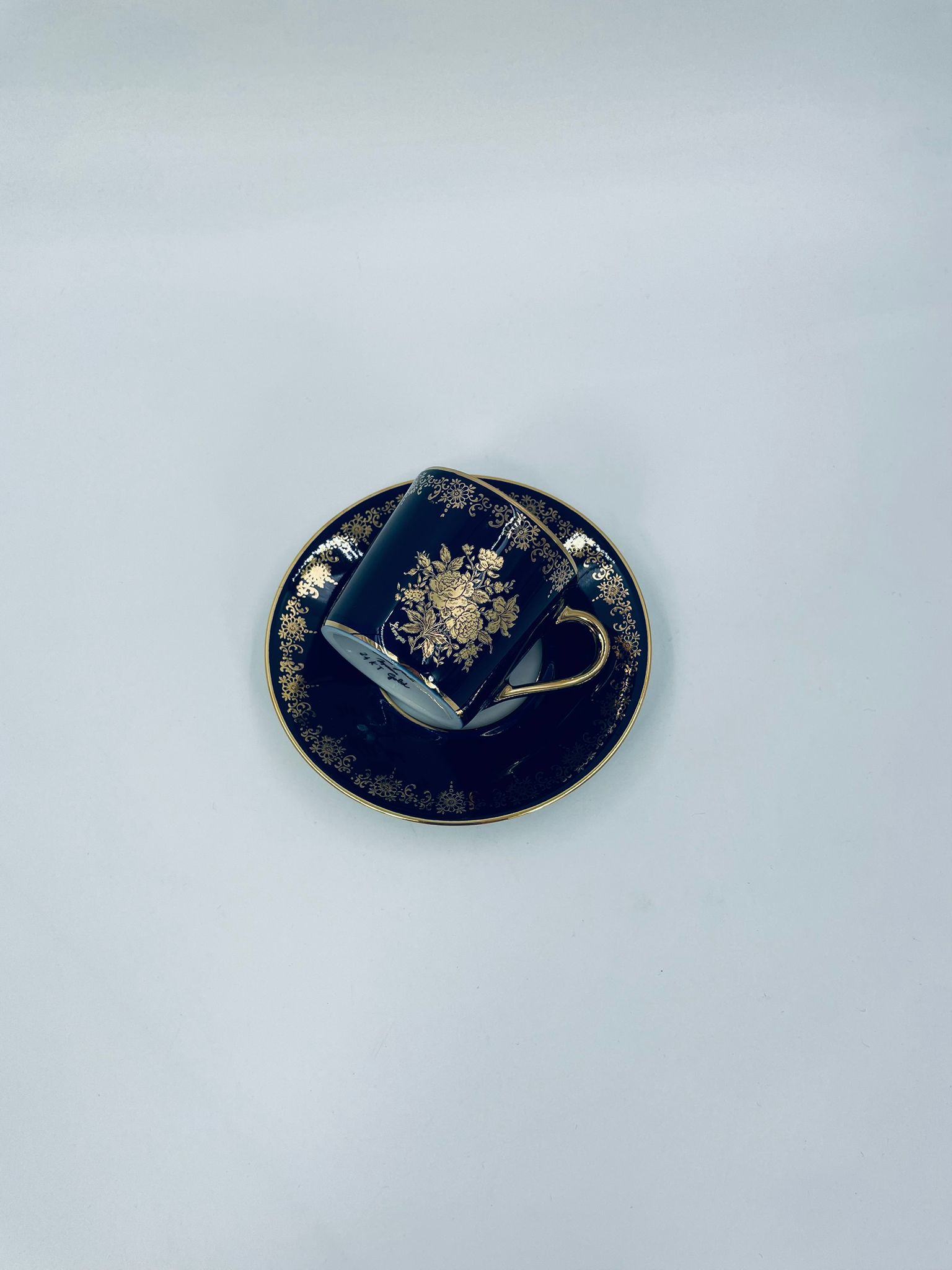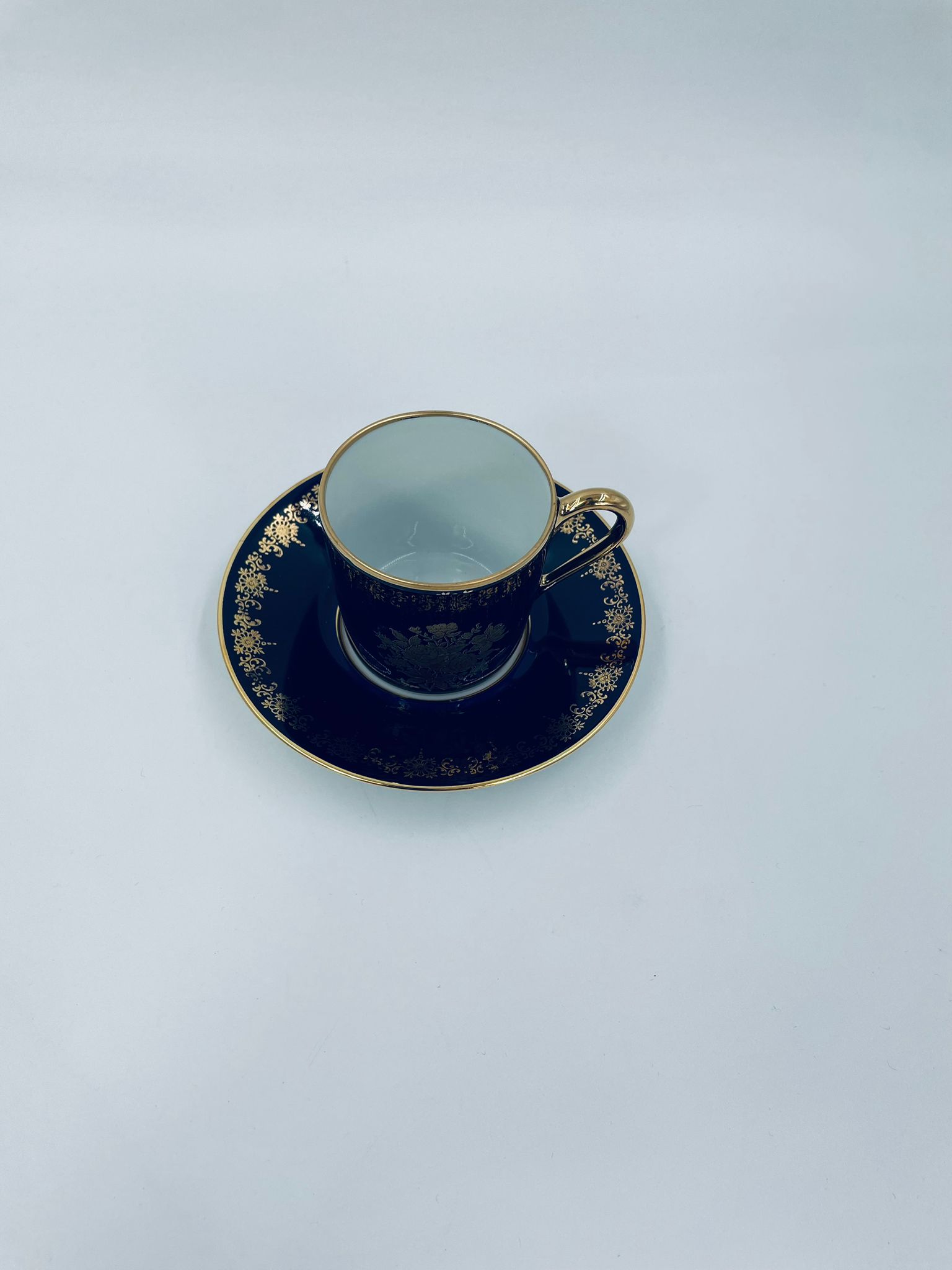 Filiżanka kolekcjonerska w zestawie duo wytwórni Josephine Emmanuel Thomas Limoges France, wykonana z najwyższej jakości porcelany. Zestaw charakteryzuje się pięknym kobaltowym kolorem oraz 24karatowym złotym zdobieniem z motywem kwiatowym.