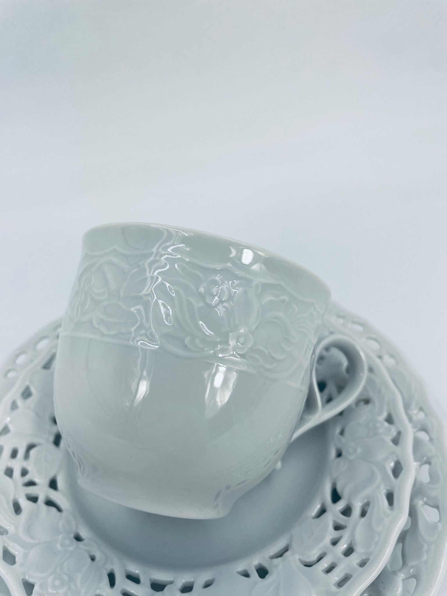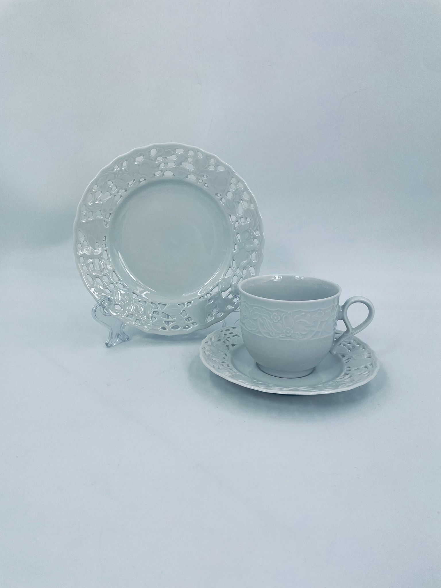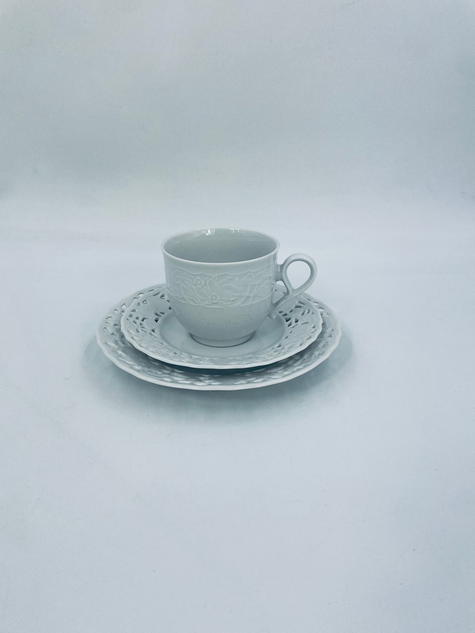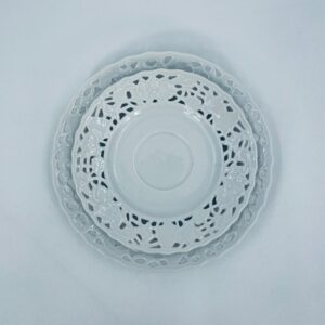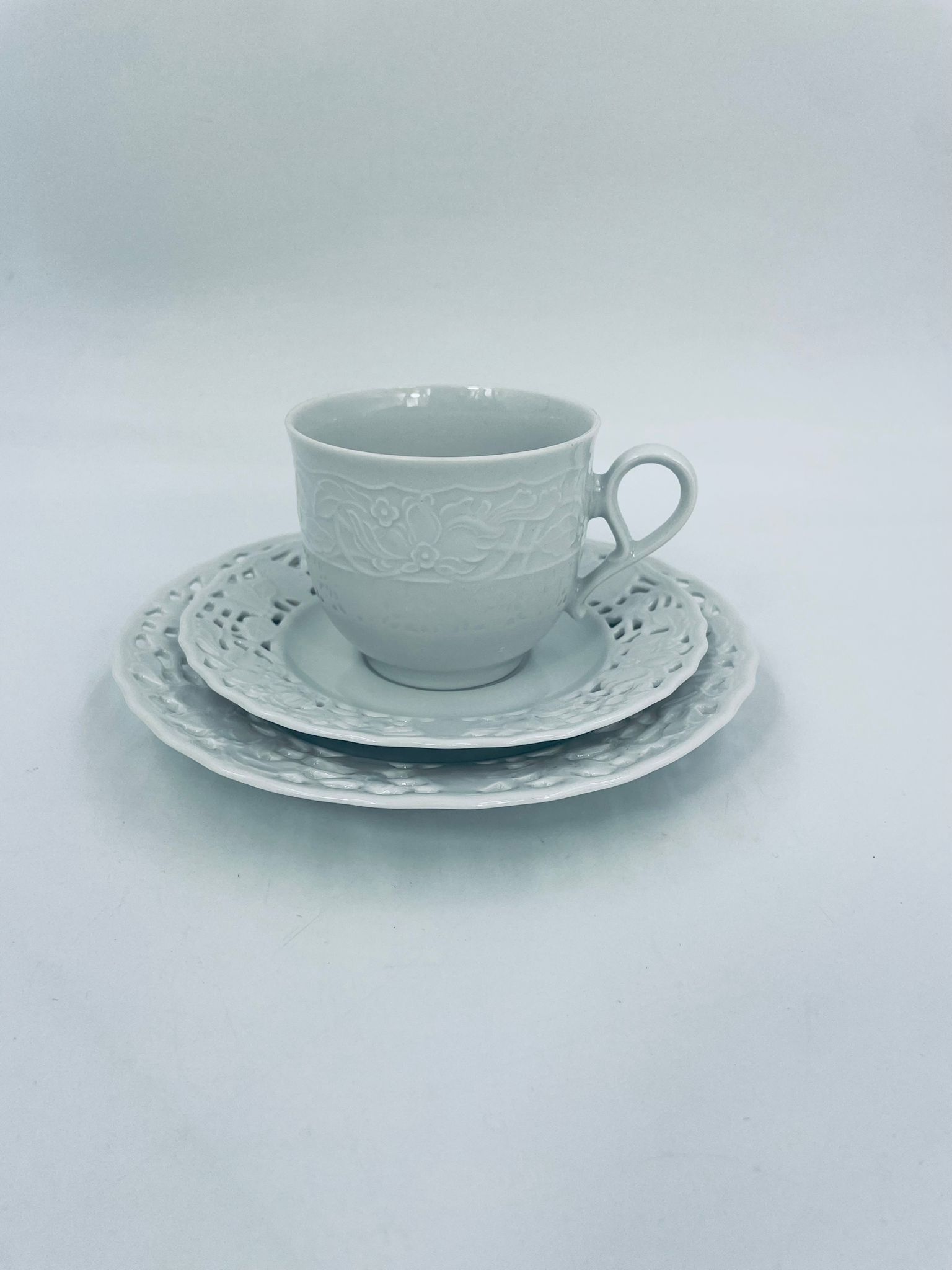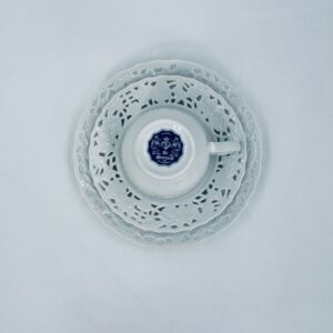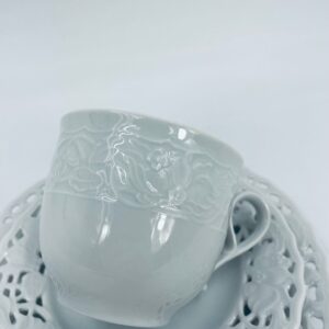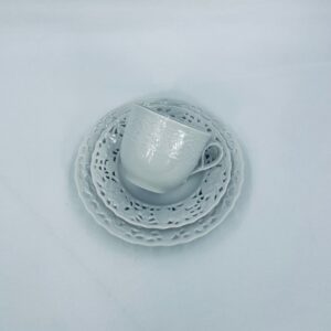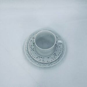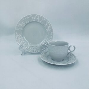 Filiżanka kolekcjonerska w zestawie trio wytwórni Mitterteich Bavaria, wykonana z najwyższej jakości białej porcelany. Zestaw klasyczny, ozdobiony kwiatowymi reliefami. Filiżanka z ozdobnym uchwytem, Talerzyki zdobione ażurowym brzegiem.