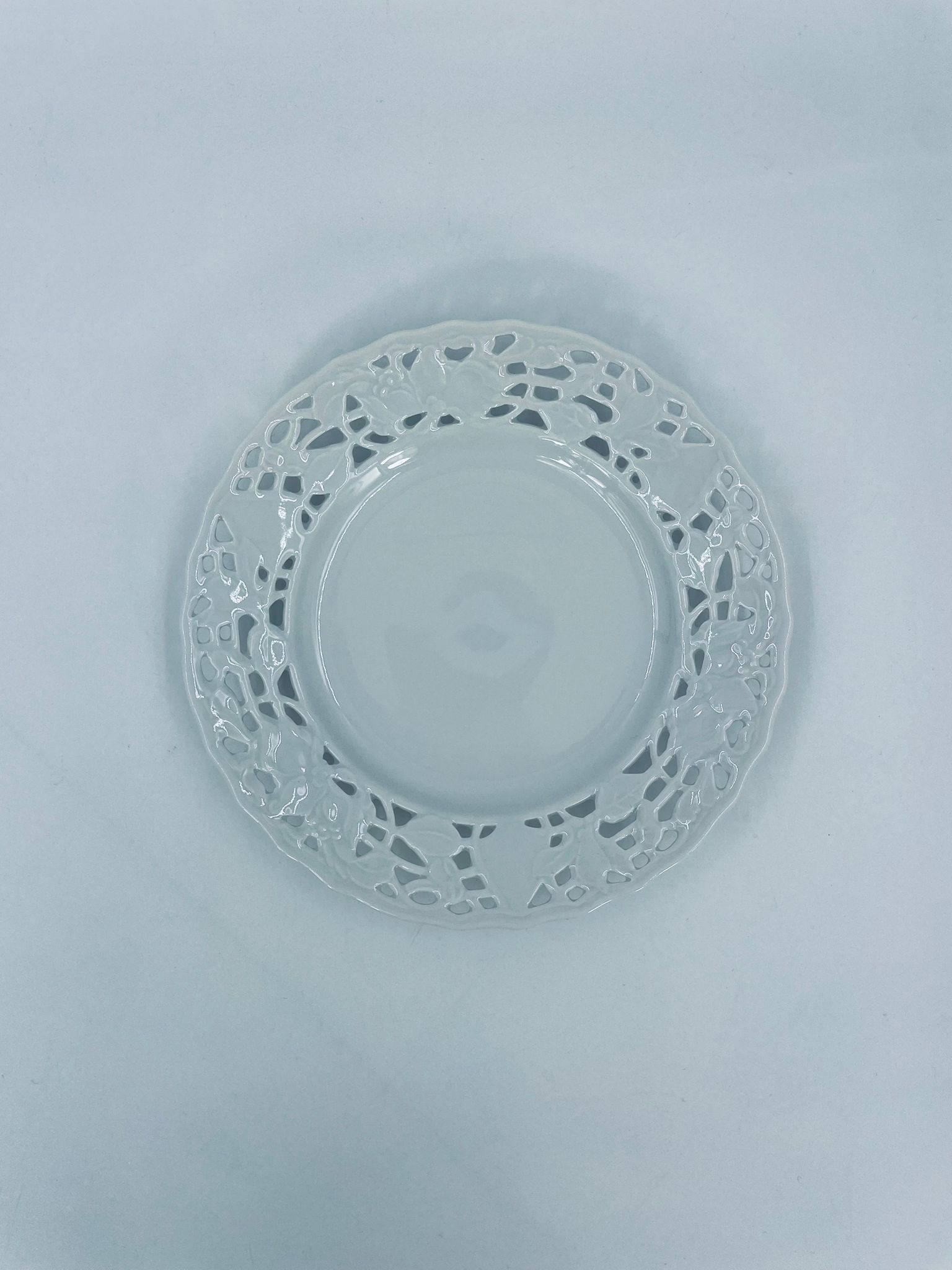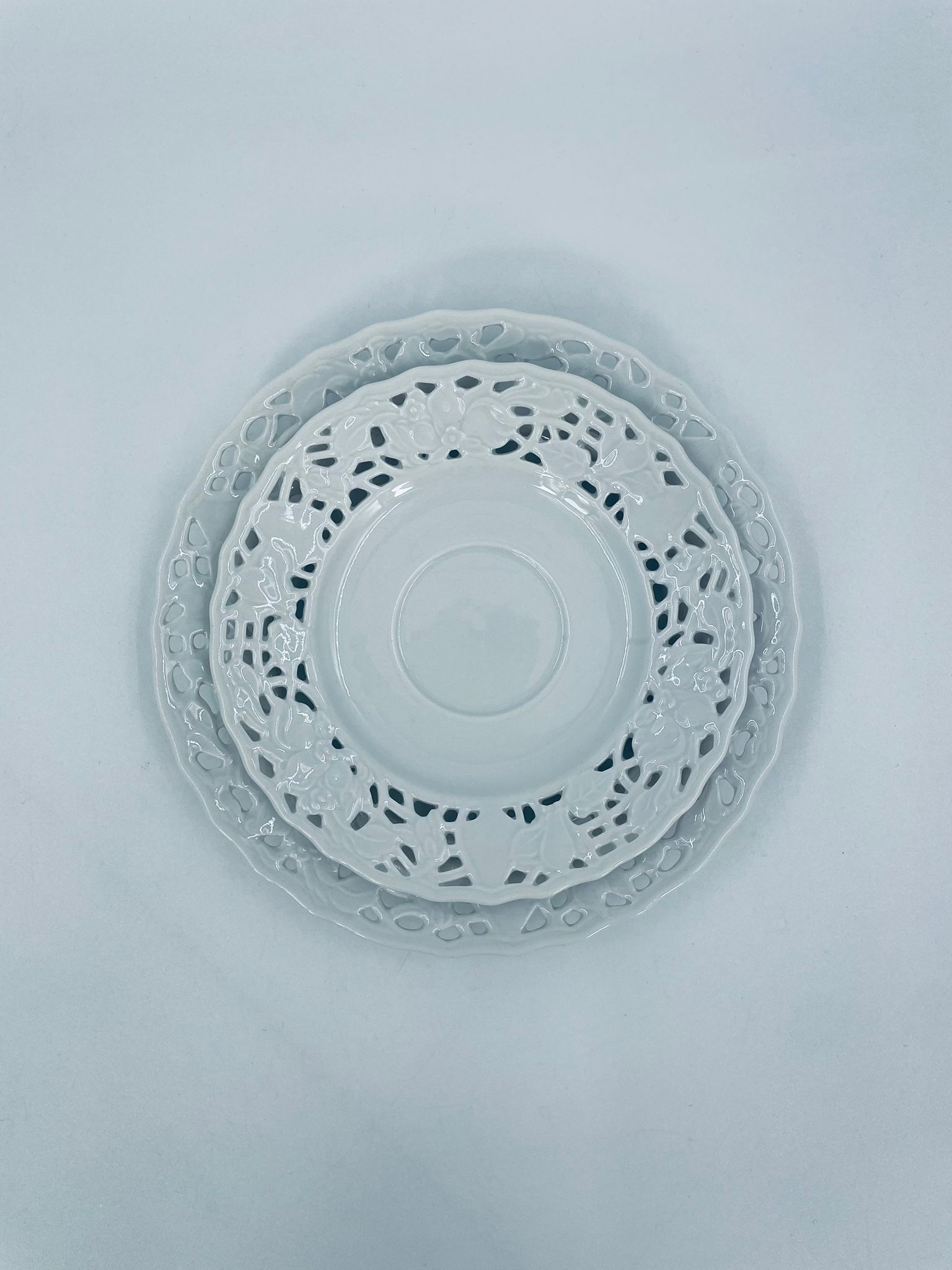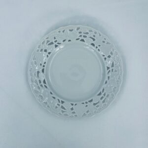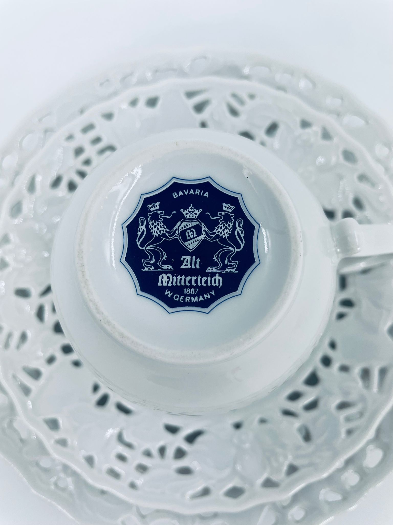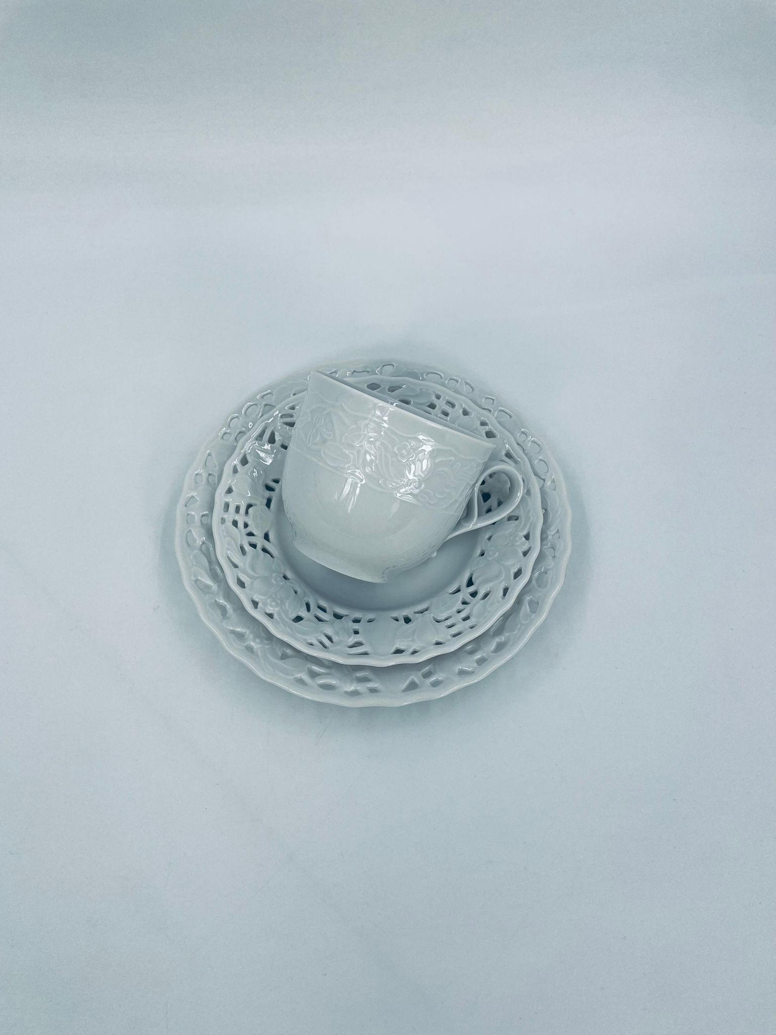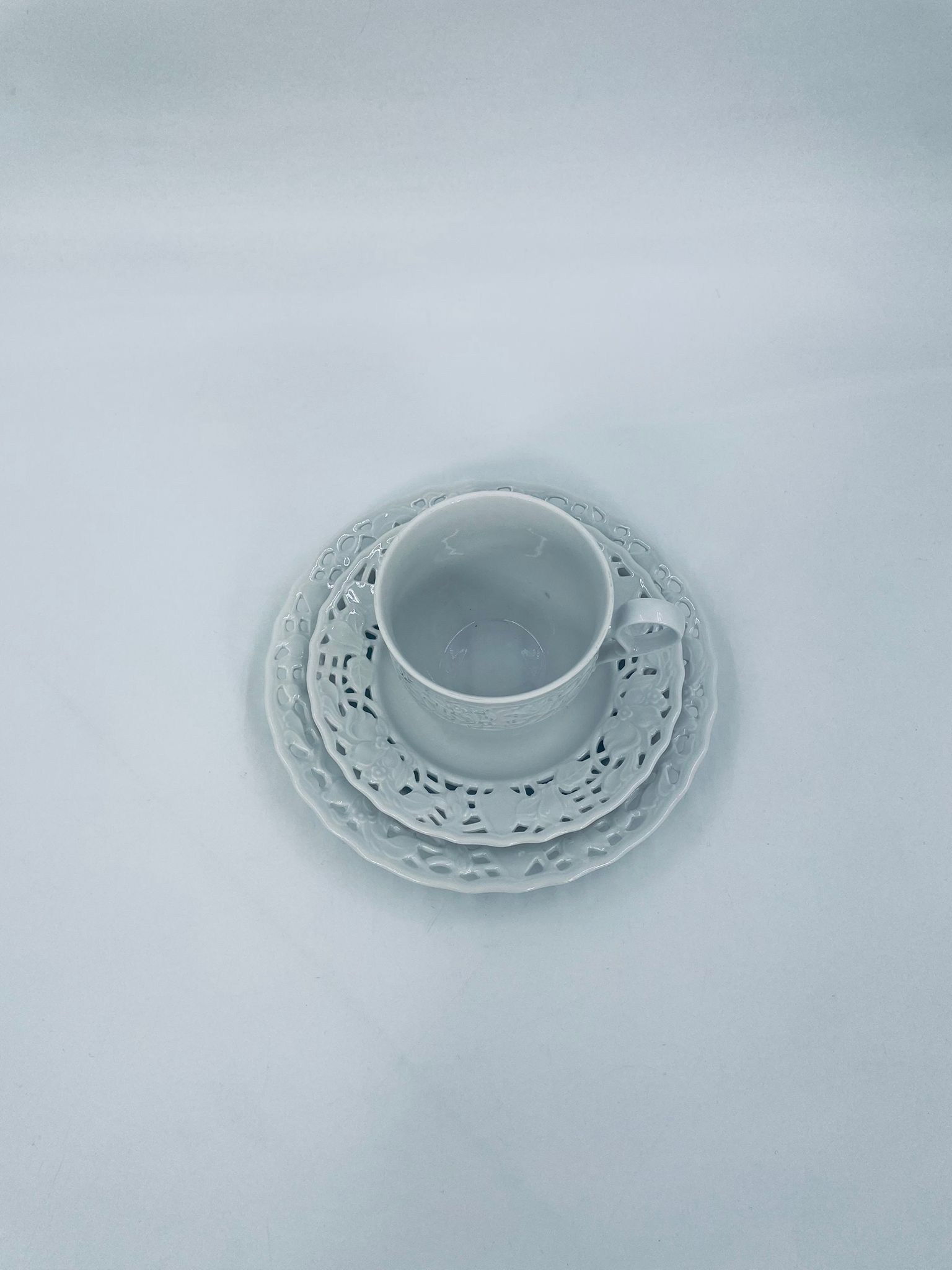 Filiżanka kolekcjonerska w zestawie trio wytwórni Mitterteich Bavaria, wykonana z najwyższej jakości białej porcelany. Zestaw klasyczny, ozdobiony kwiatowymi reliefami. Filiżanka z ozdobnym uchwytem, Talerzyki zdobione ażurowym brzegiem.