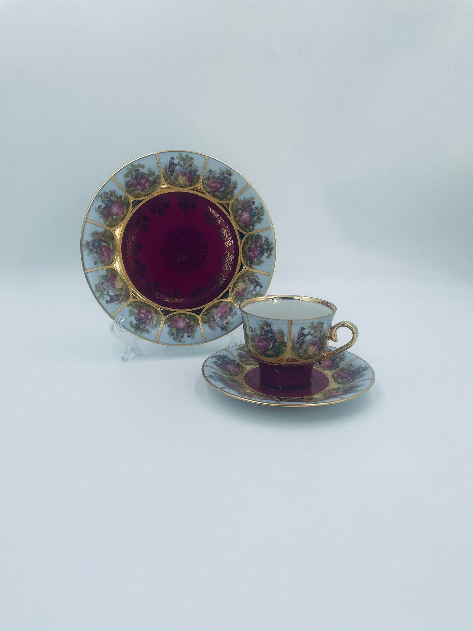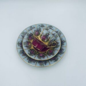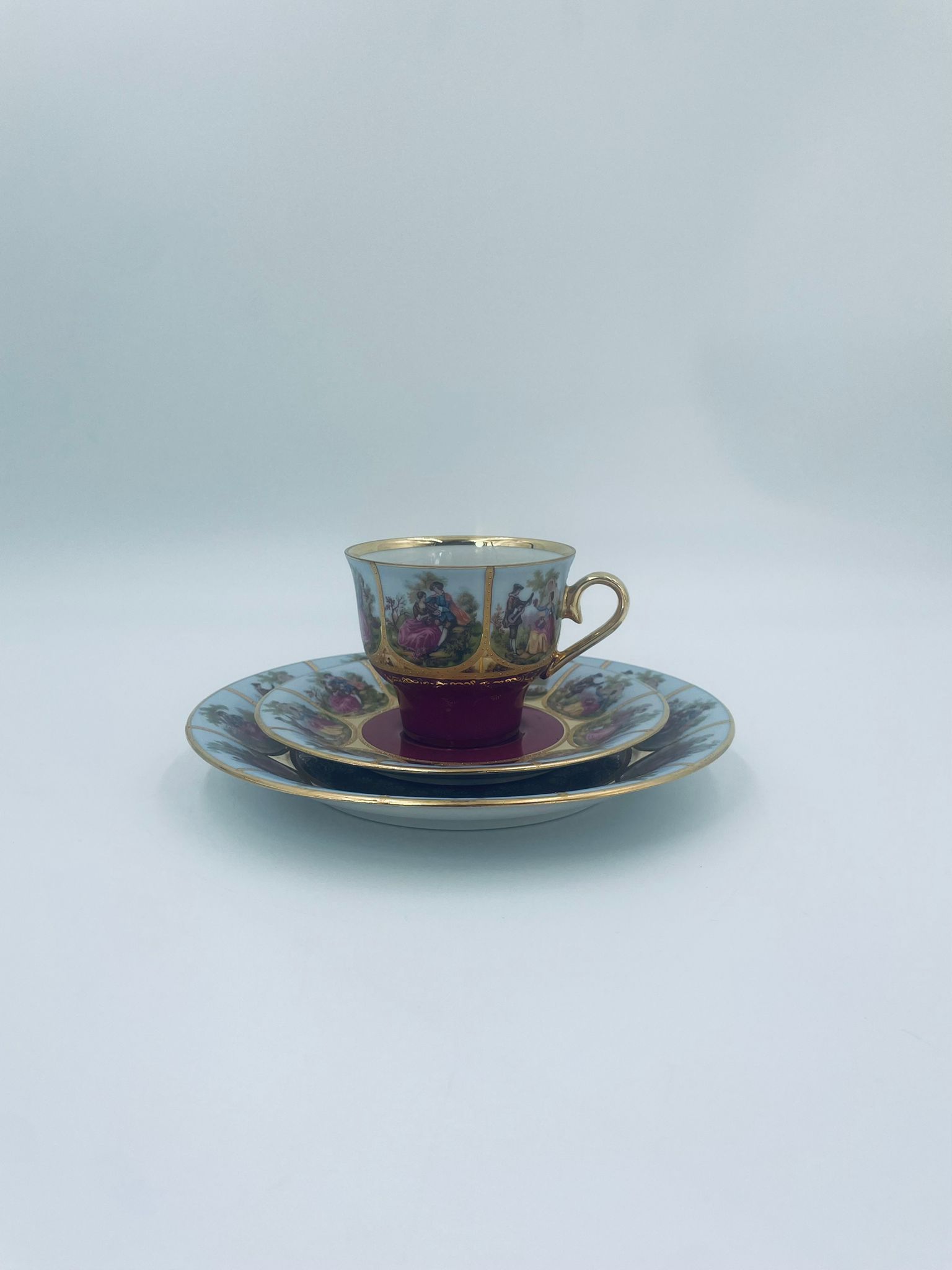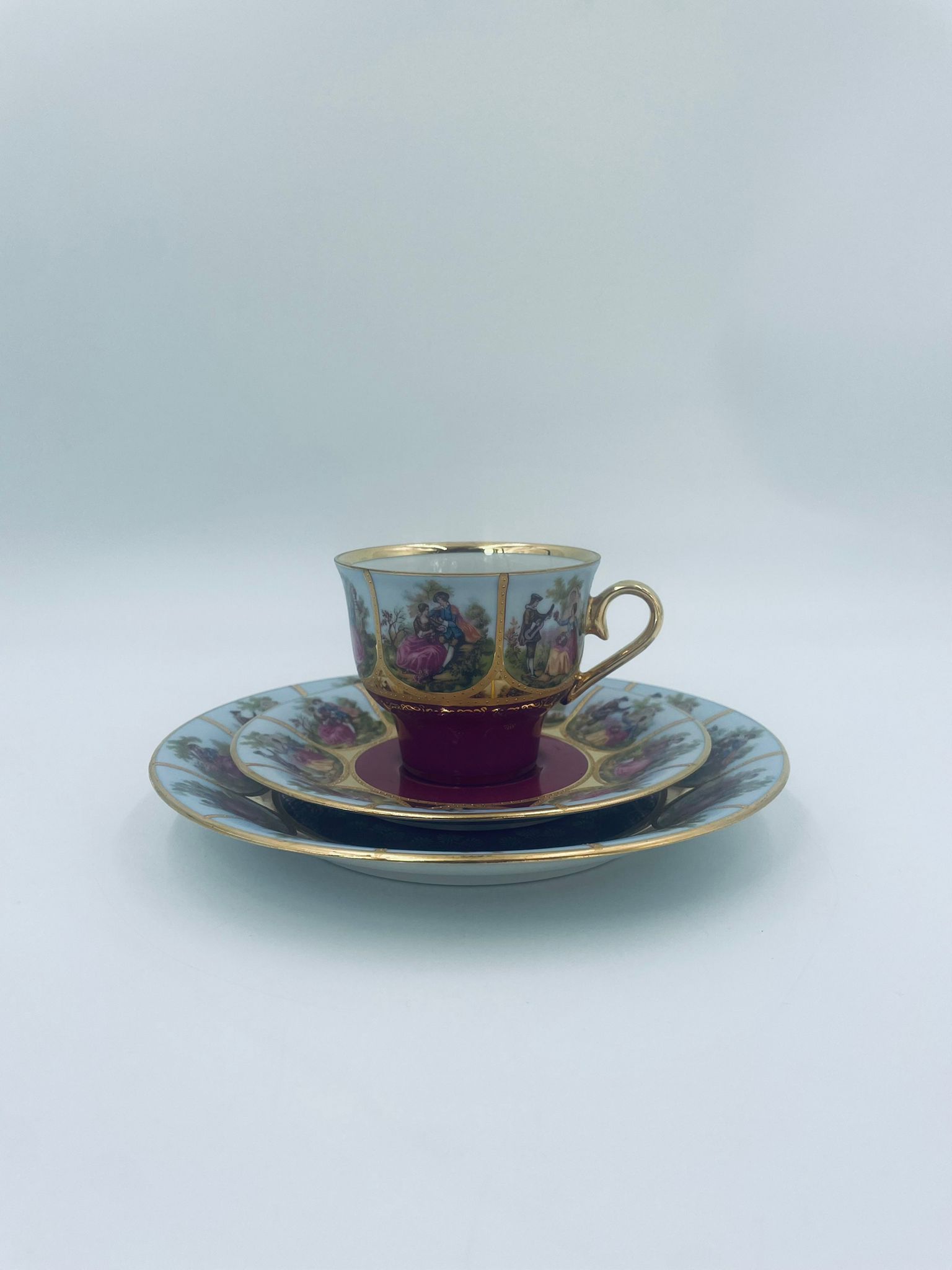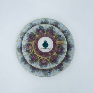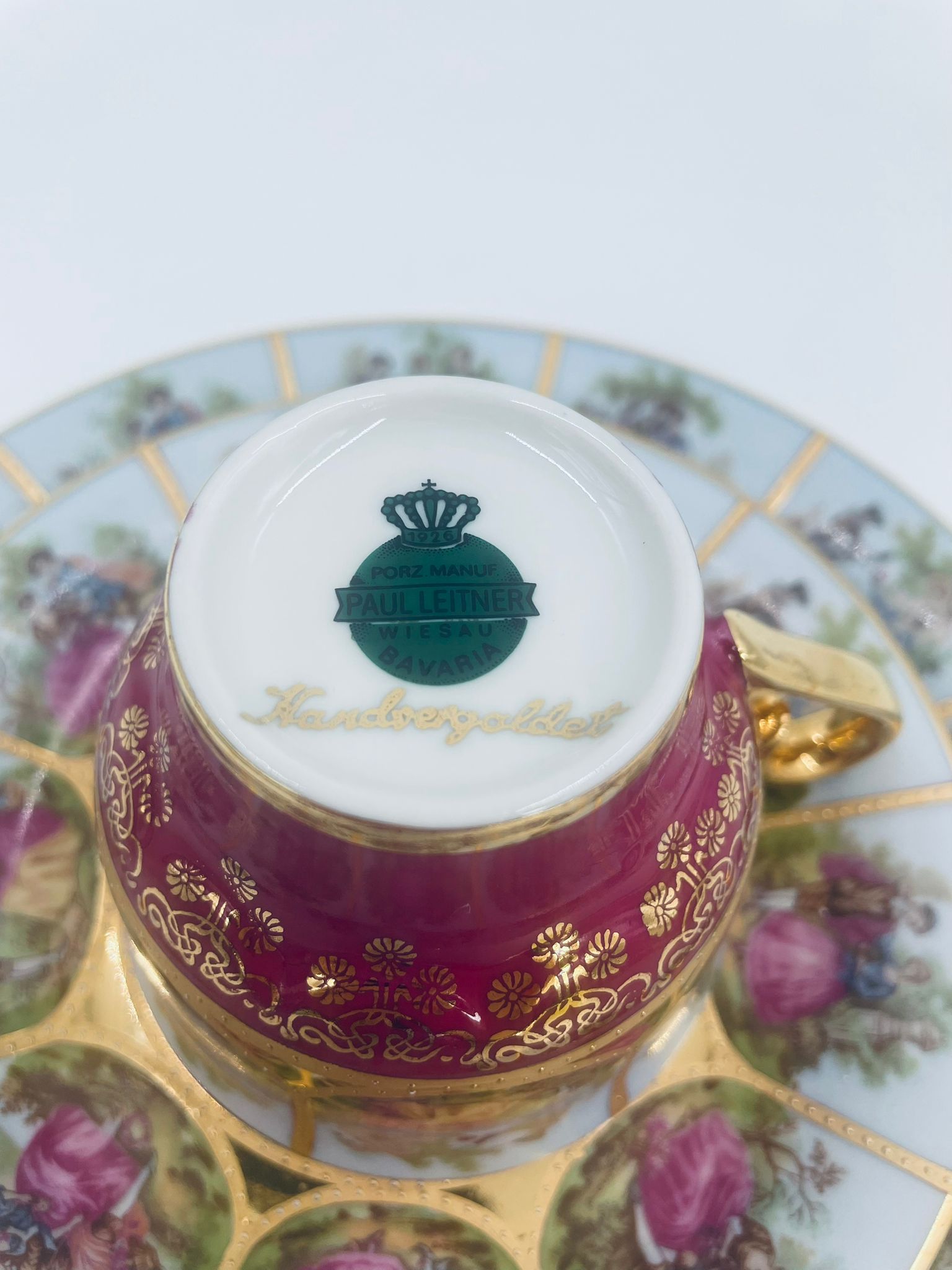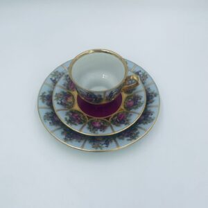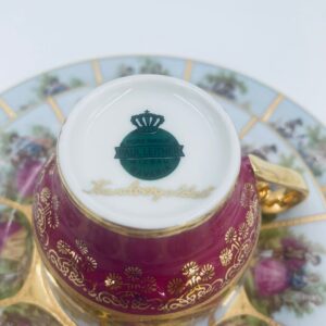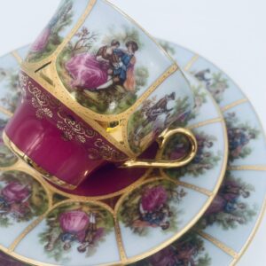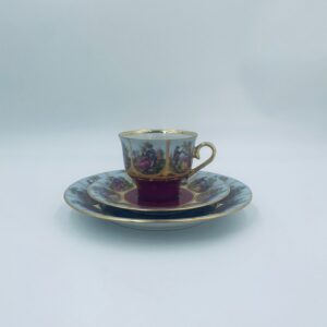 Filiżanka kolekcjonerska w zestawie trio wytwórni Paul Leitner Wiesau, datowana na 1926r., wykonana z wysokiej jakości porcelany. Zestaw charakteryzuje się ręcznym, bogatym złoceniem, medalionami przedstawiającymi barokowe scenki rodzajowe oraz złotymi ornamentami na bordowym tle, wykończony złoceniem na krawędzi. Posiada przetarcie na złoceniu.