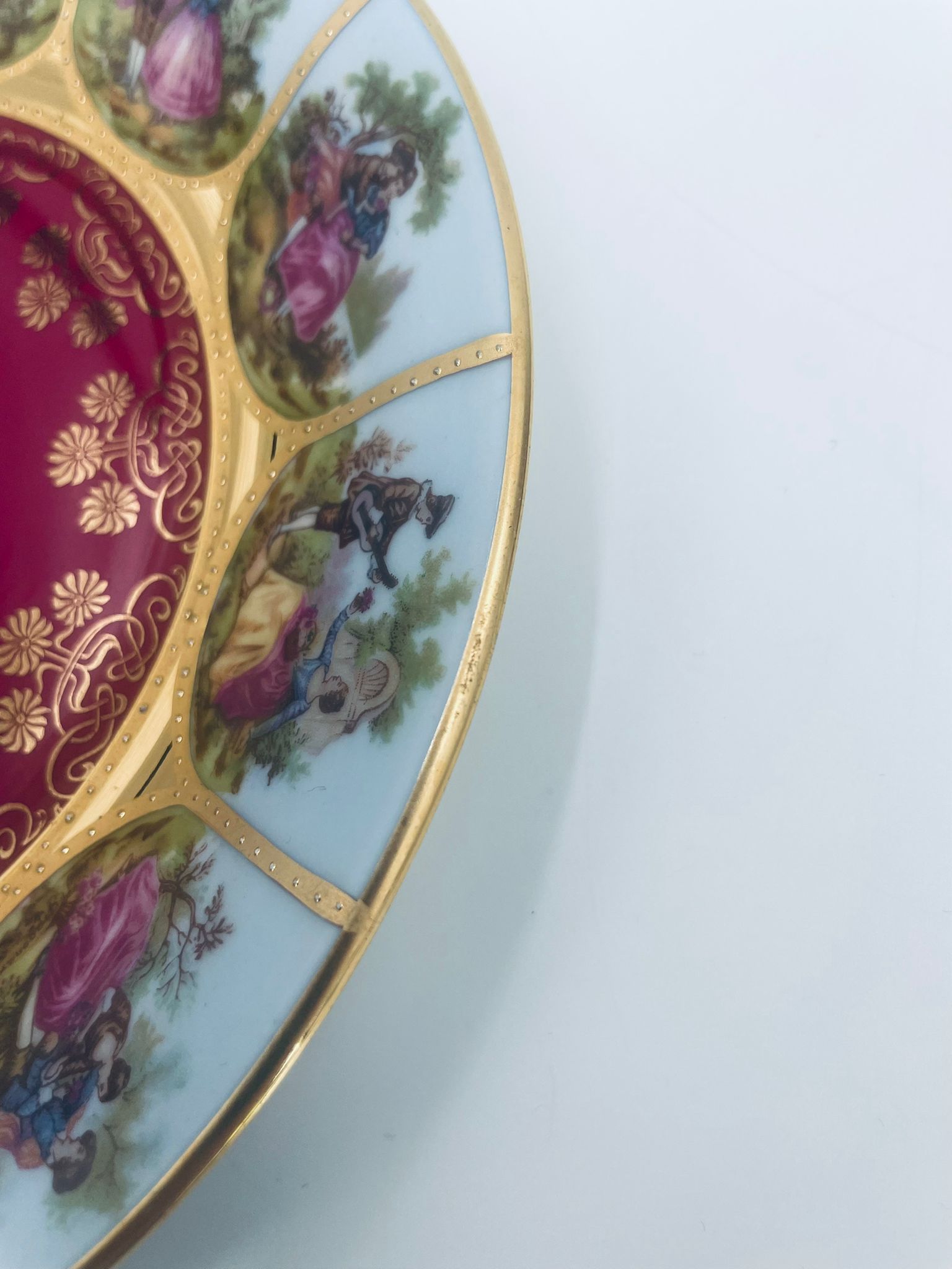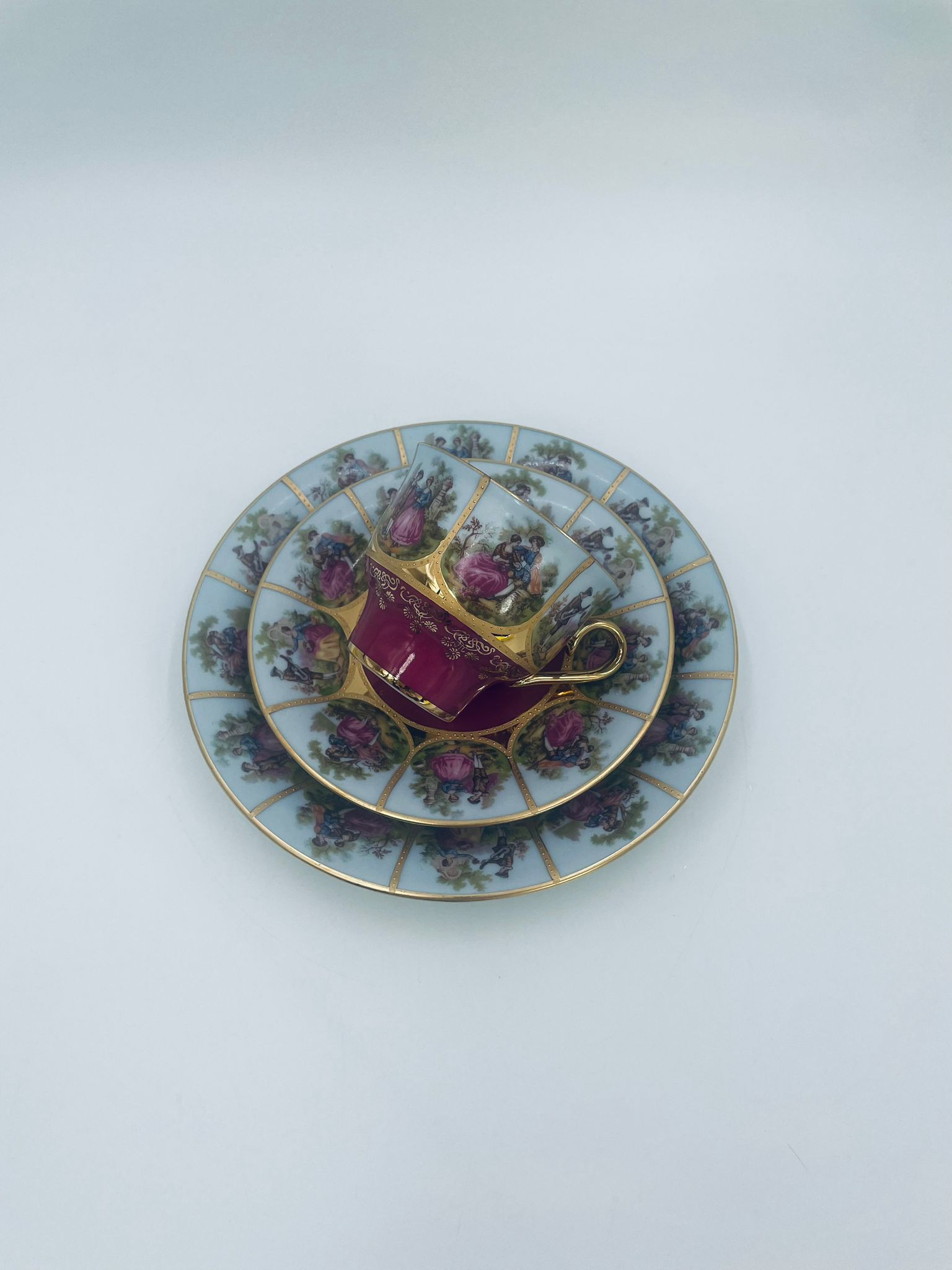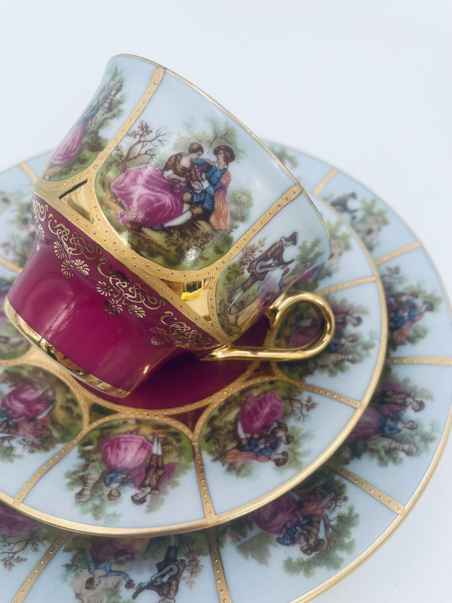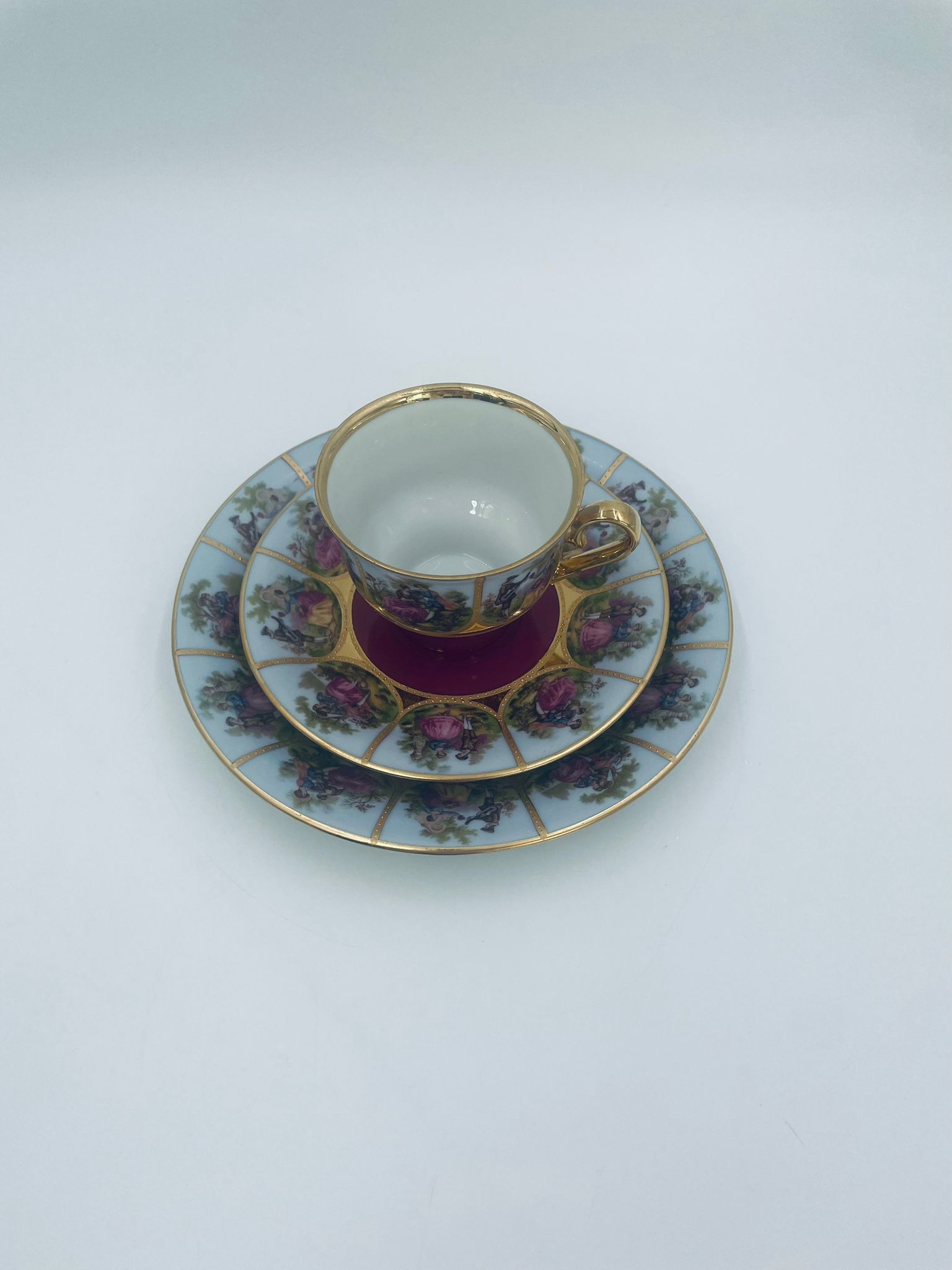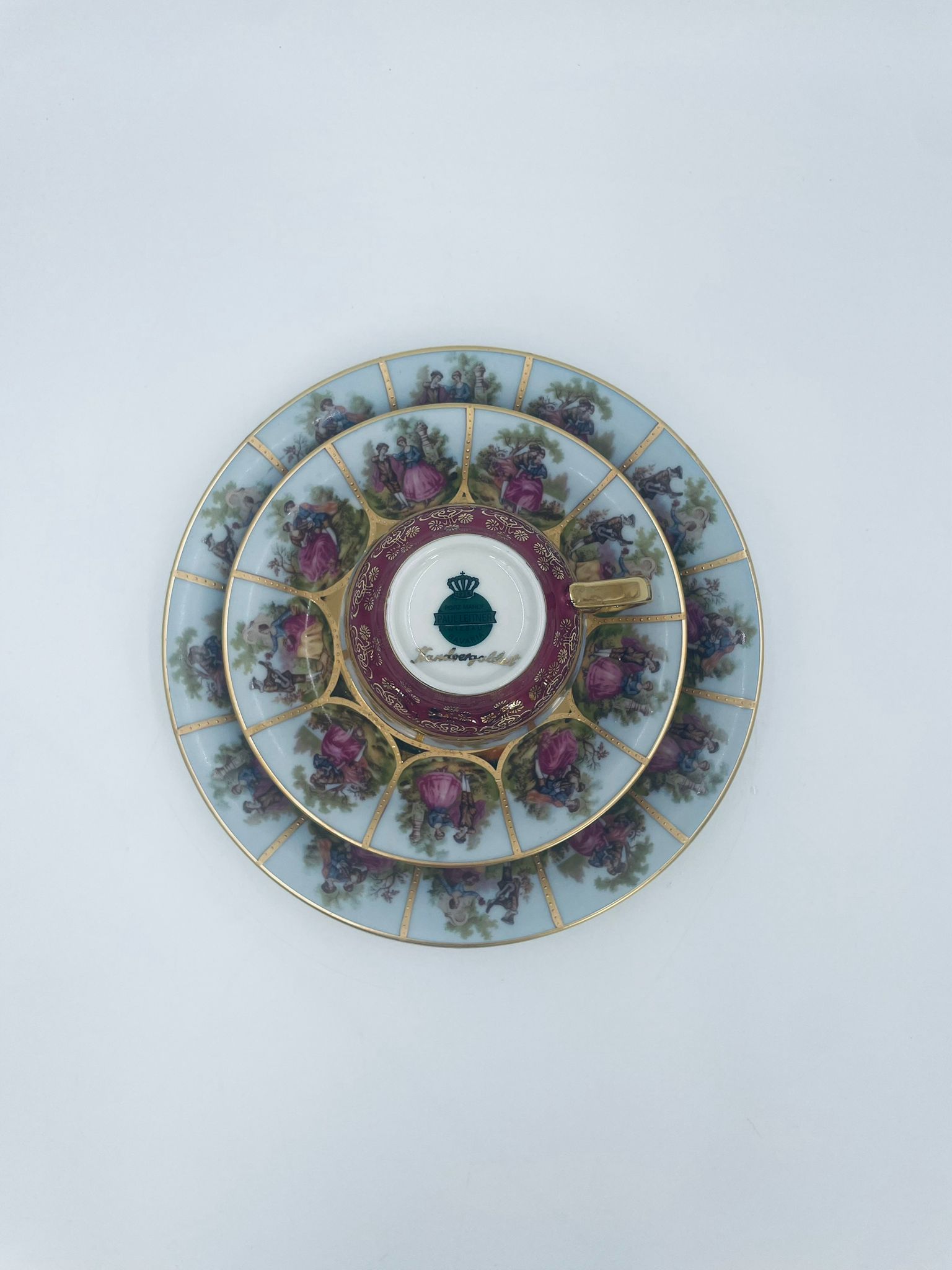 Filiżanka kolekcjonerska w zestawie trio wytwórni Paul Leitner Wiesau, datowana na 1926r., wykonana z wysokiej jakości porcelany. Zestaw charakteryzuje się ręcznym, bogatym złoceniem, medalionami przedstawiającymi barokowe scenki rodzajowe oraz złotymi ornamentami na bordowym tle, wykończony złoceniem na krawędzi. Posiada przetarcie na złoceniu.