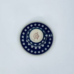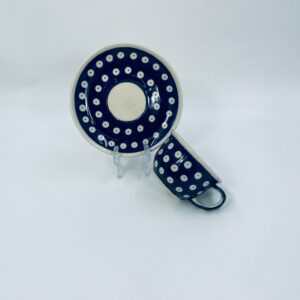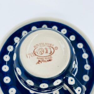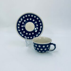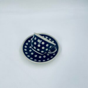 Filiżanka kolekcjonerska w zestawie duo Polskiej wytwórni Bolesławiec, wykonana z najwyższej jakości ceramiki. Zestaw ręcznie robiony w kolorze granatowym, ozdobiony jest ręcznie malowanym, tradycyjnym wzorem stempelkowym w kropki. Wzory na Bolesławieckiej ceramice naniesione są metodą stempelkową oraz pędzlem.