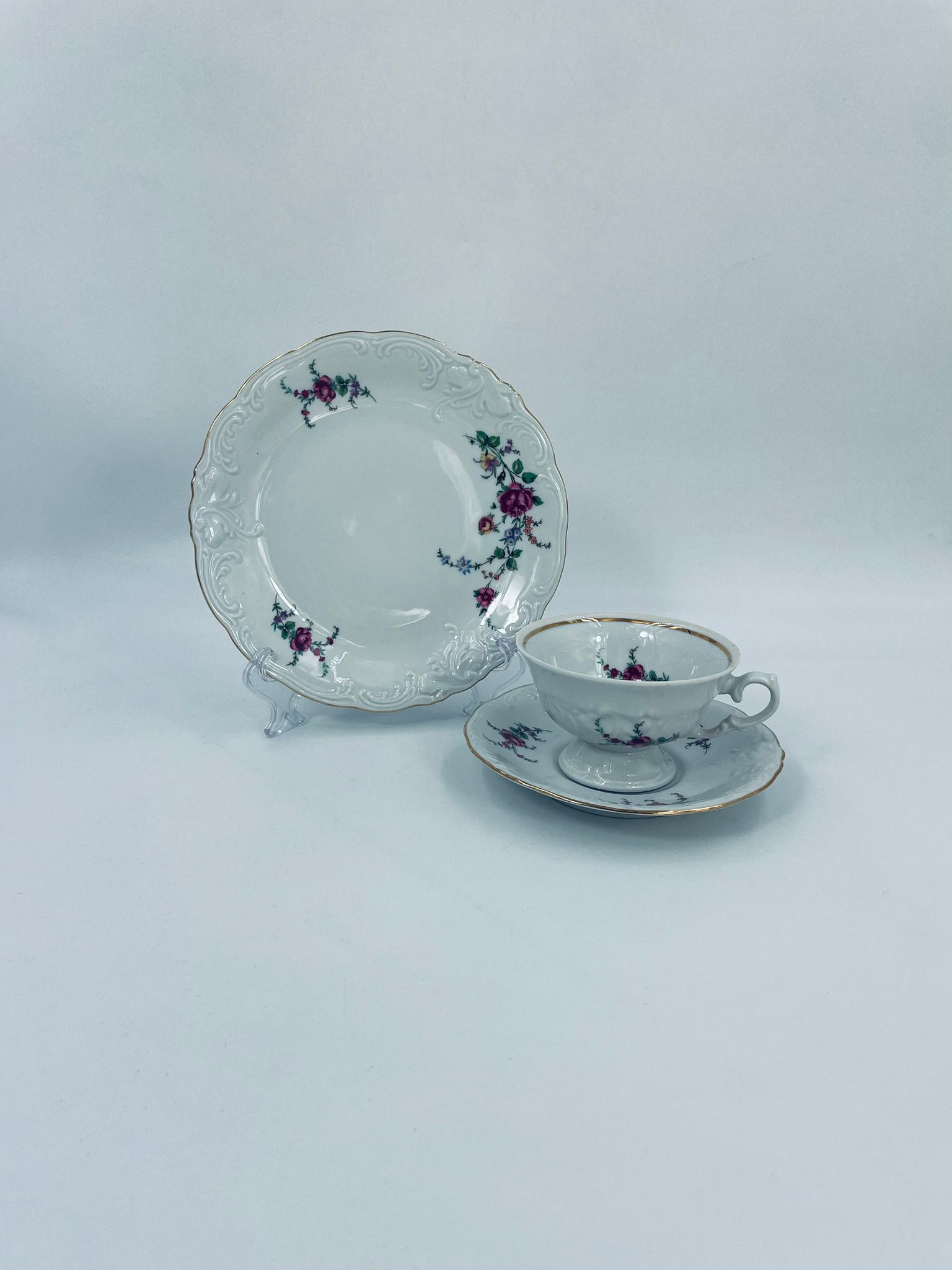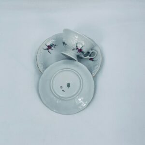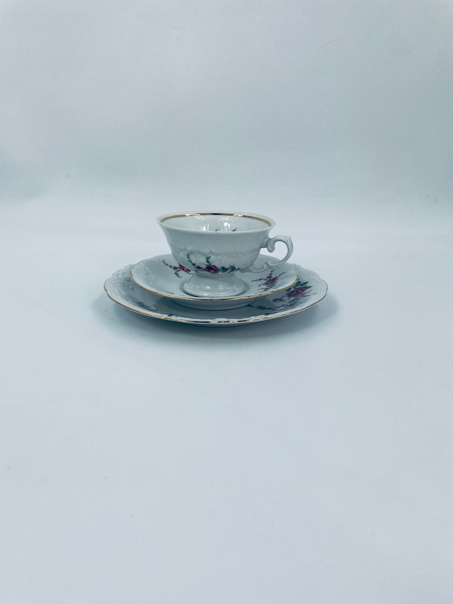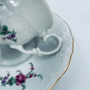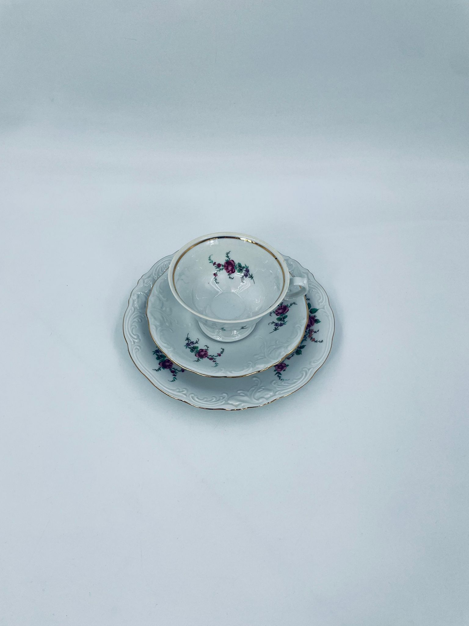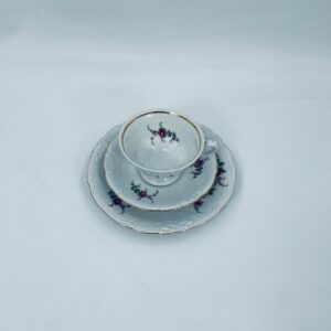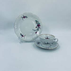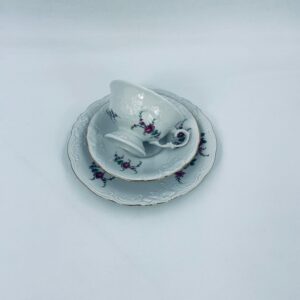 Filiżanka kolekcjonerska w zestawie trio Polskiej wytwórni Wawel, wykonana z wysokiej jakości białej porcelany. Zestaw charakteryzuje się pięknym motywem kwiatowym, ozdobnymi reliefami oraz złoceniem na falowanym rancie talerzyków.