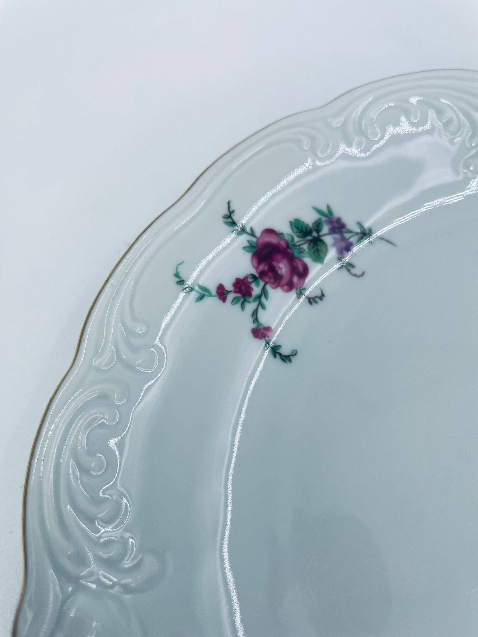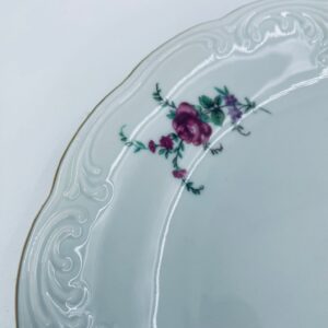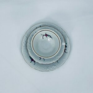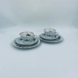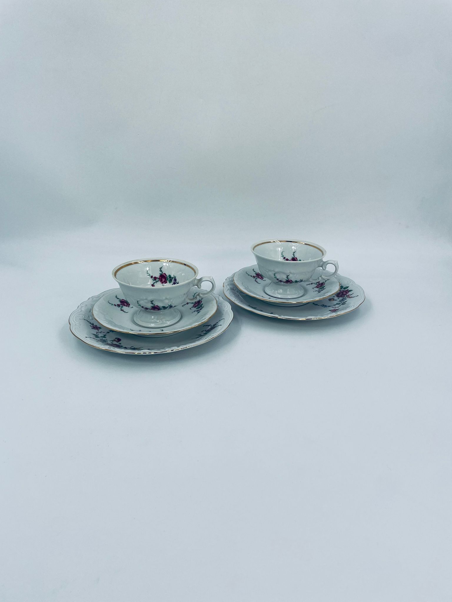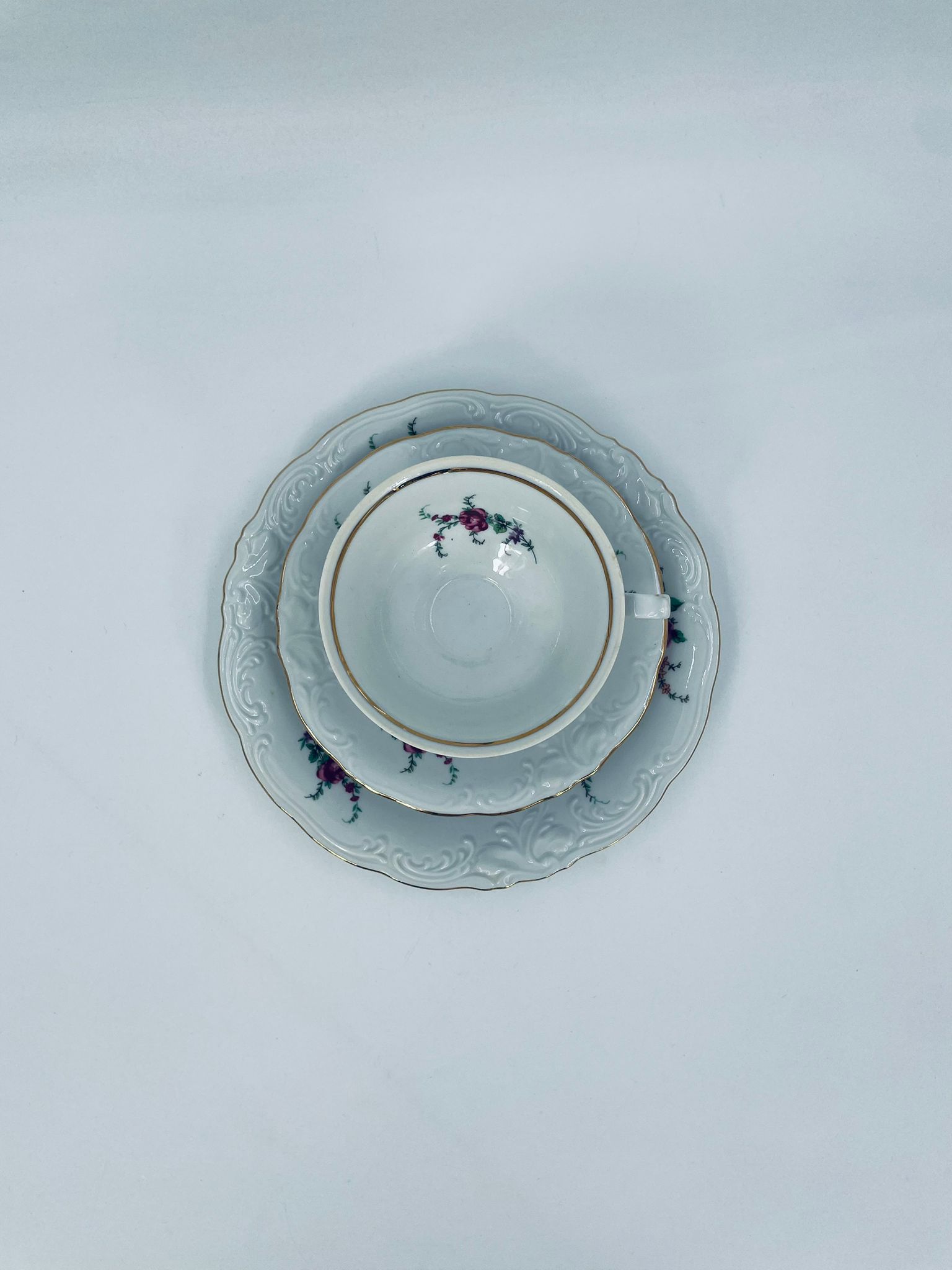 Filiżanka kolekcjonerska w zestawie trio Polskiej wytwórni Wawel, wykonana z wysokiej jakości białej porcelany. Zestaw charakteryzuje się pięknym motywem kwiatowym, ozdobnymi reliefami oraz złoceniem na falowanym rancie talerzyków.