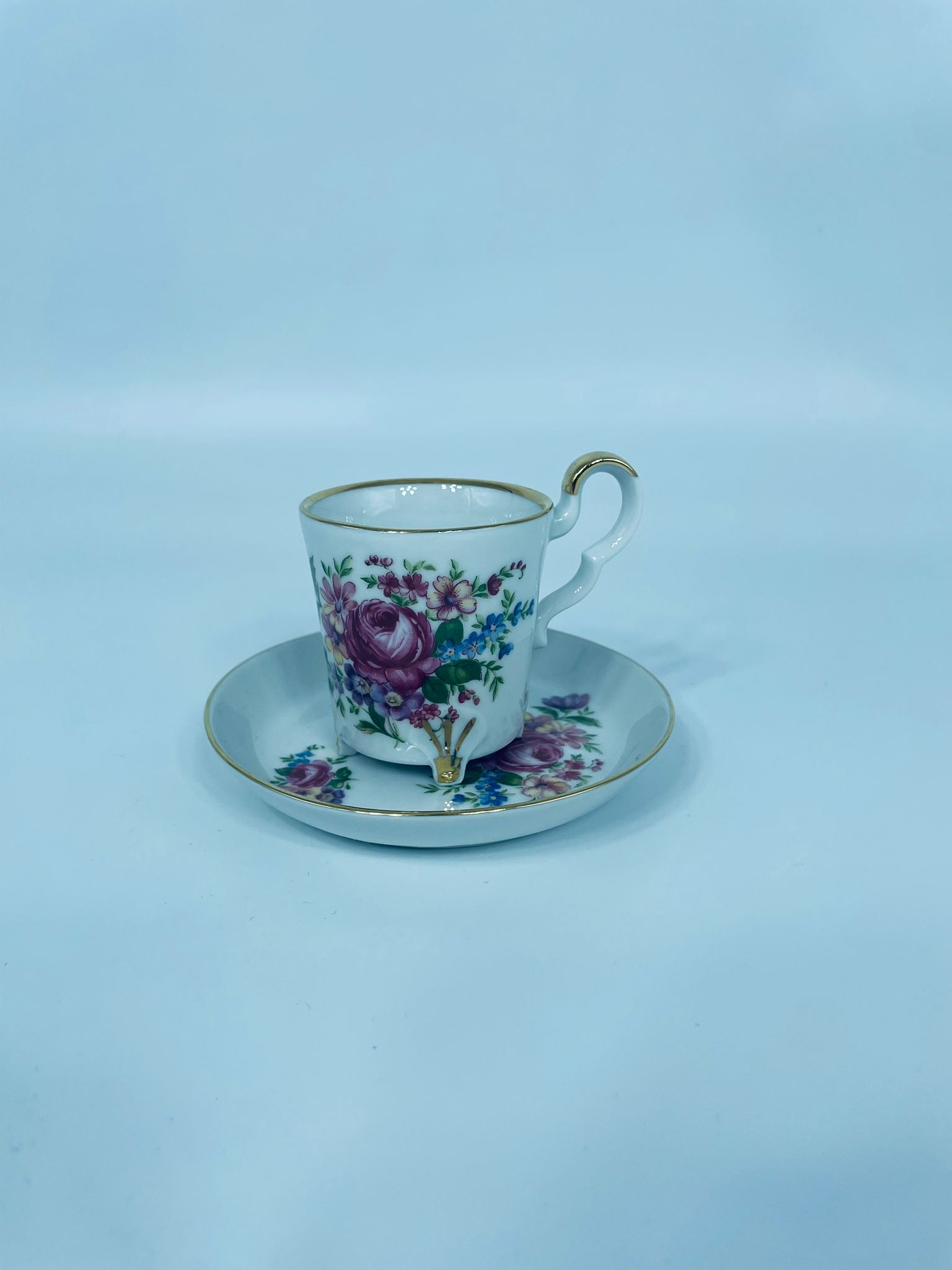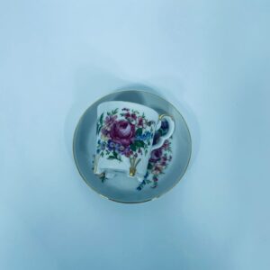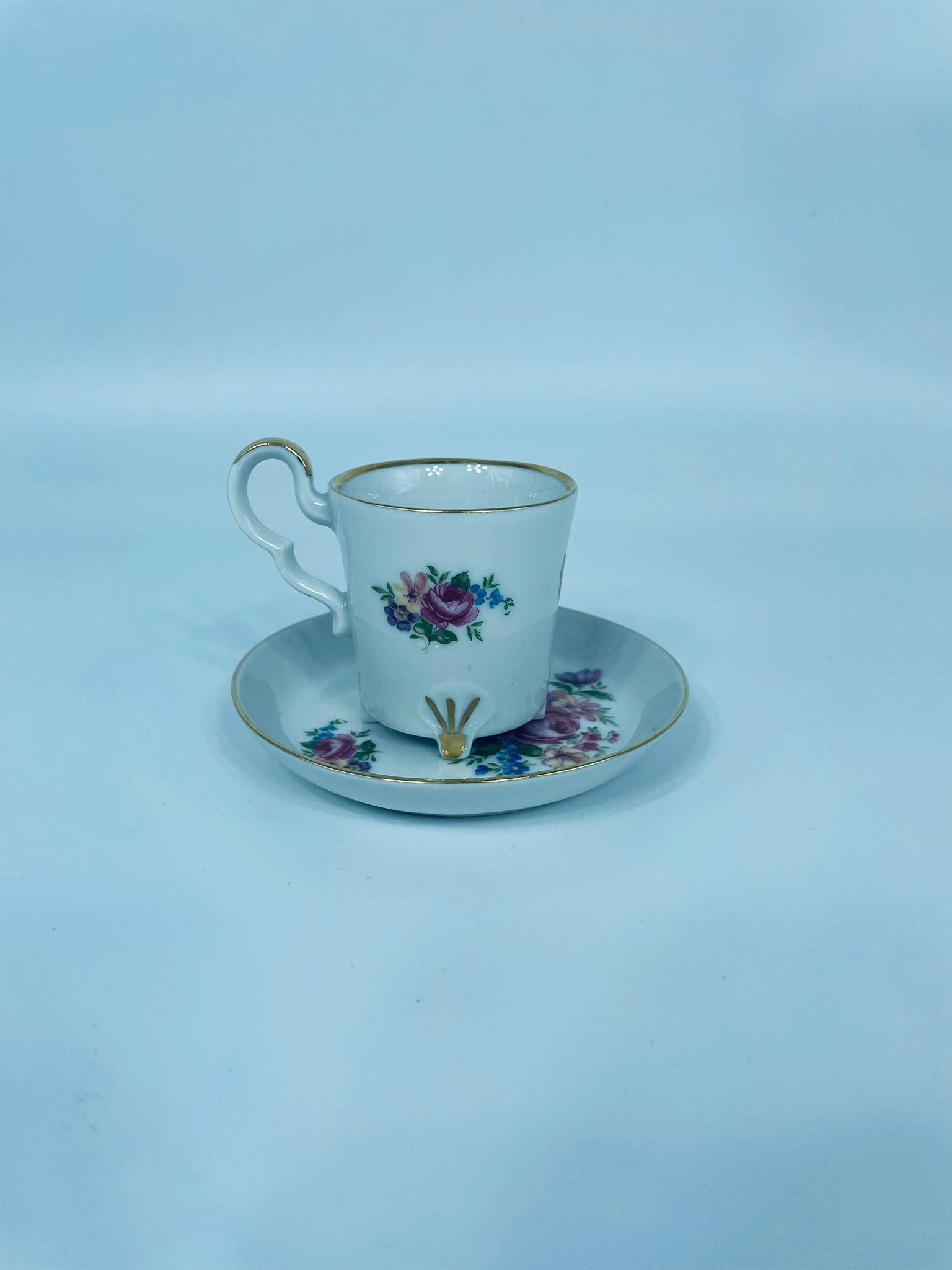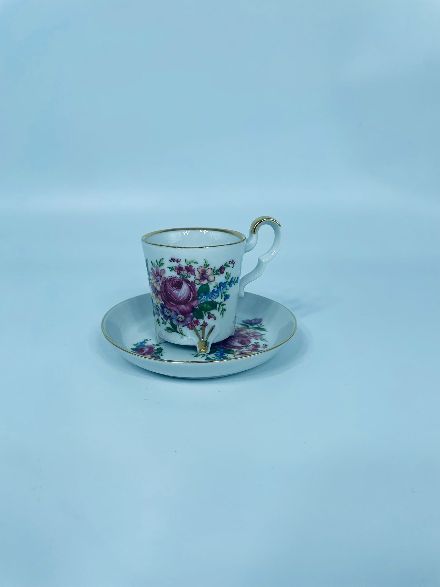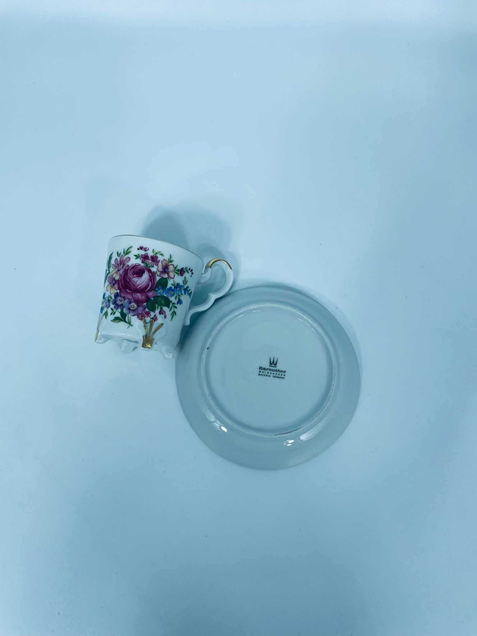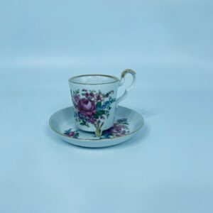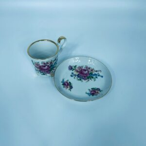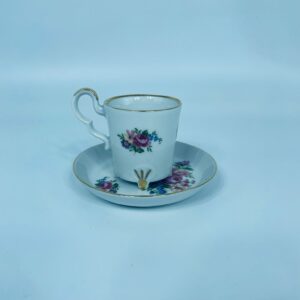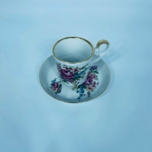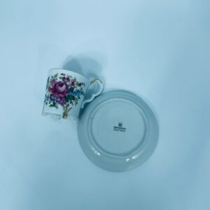Filiżanka kolekcjonerska w zestawie duo, wytwórni Bareuther Waldsassen, wykonana z wysokiej jakości białej porcelany. Zestaw charakteryzuje się bogatym, wielokolorowym wzorem kwiatowym oraz pozlacanymi krawędziami. Filiżanka osadzona jest na czterech ozdobnych nóżkach ze złotymi akcentami.