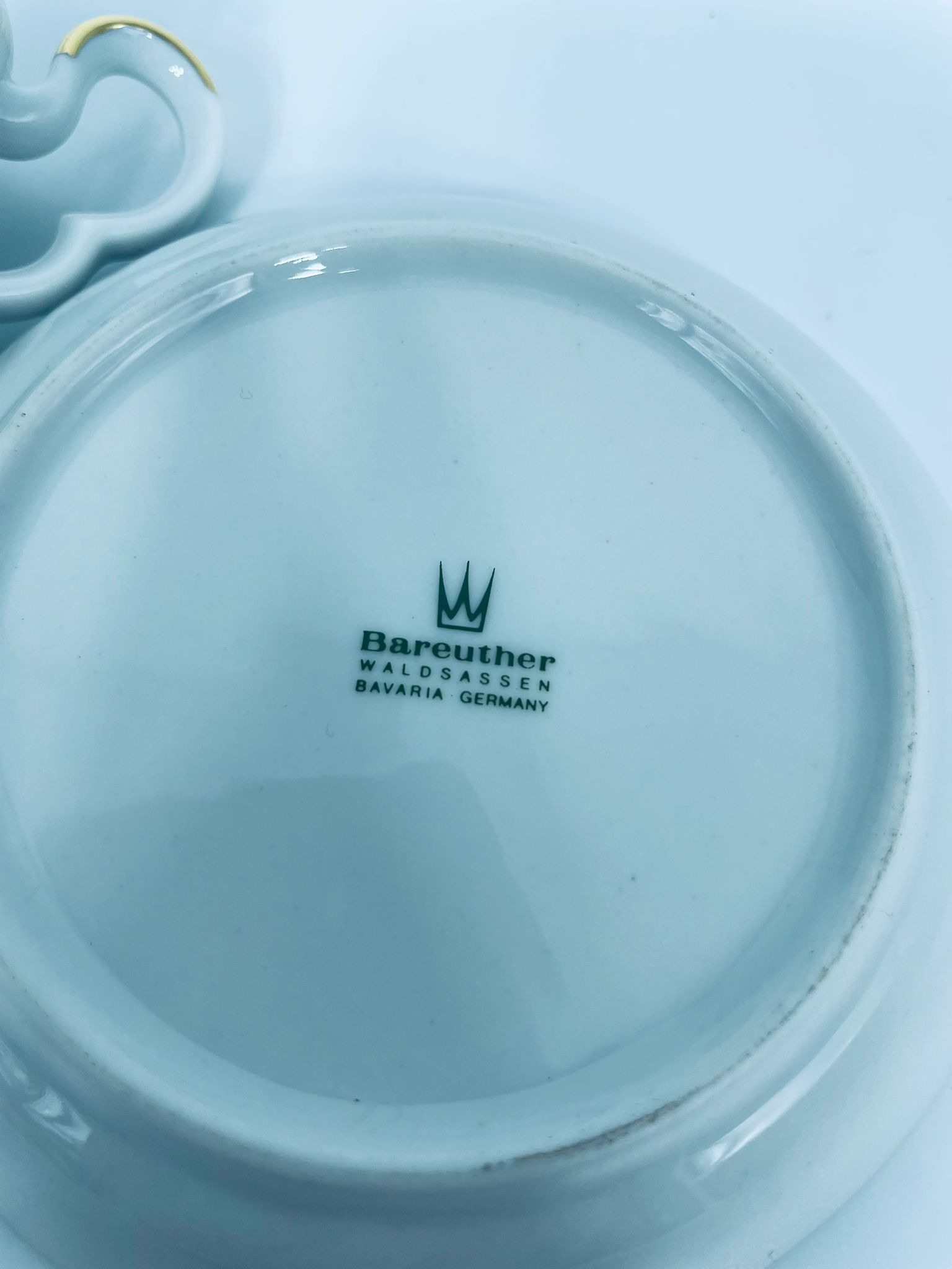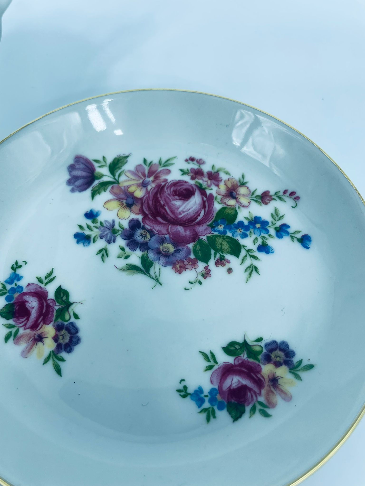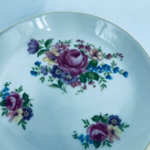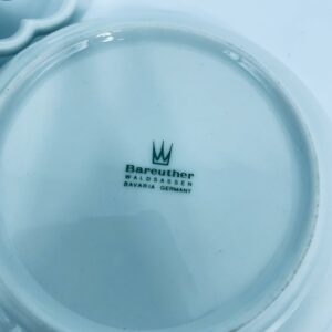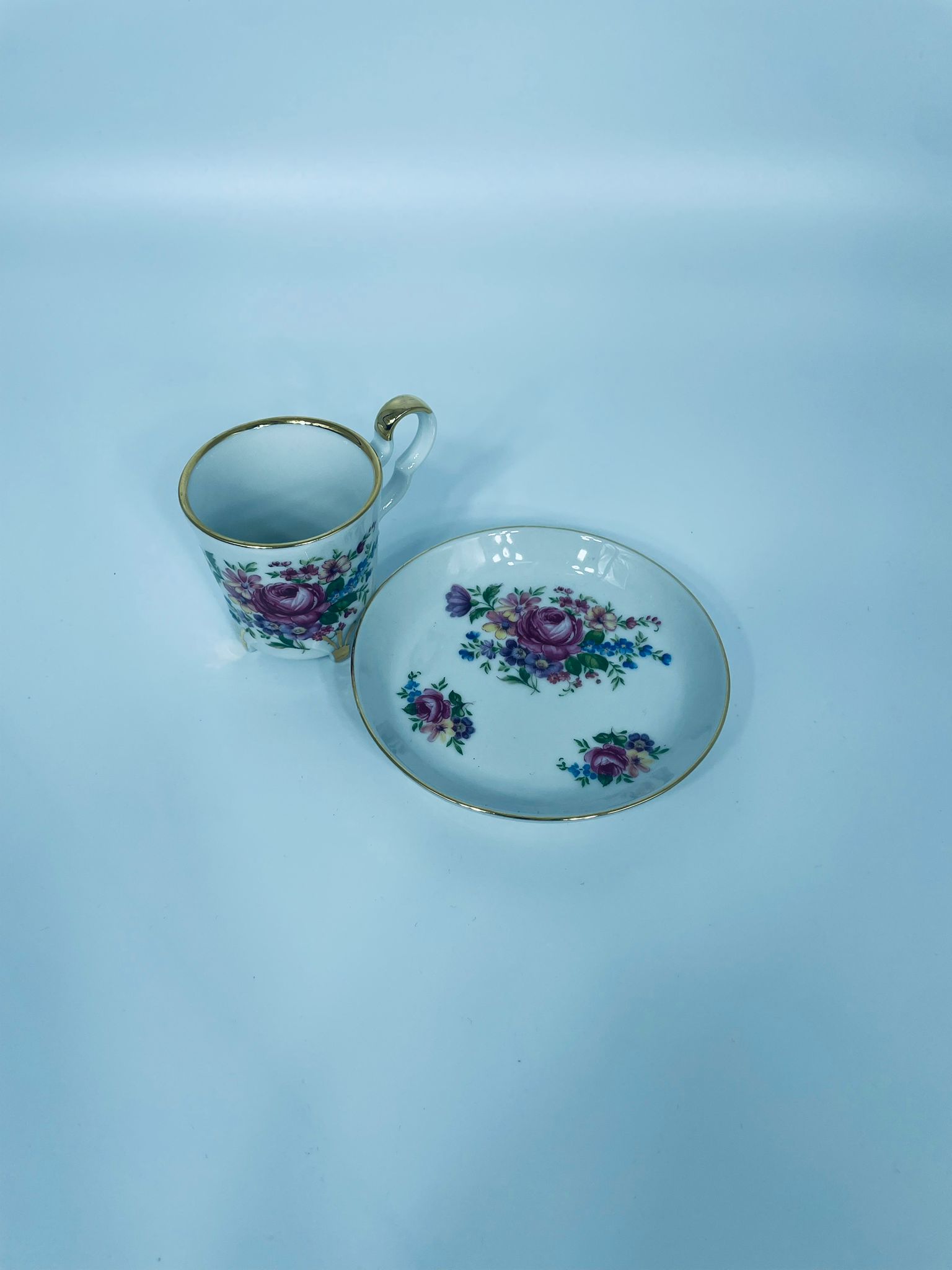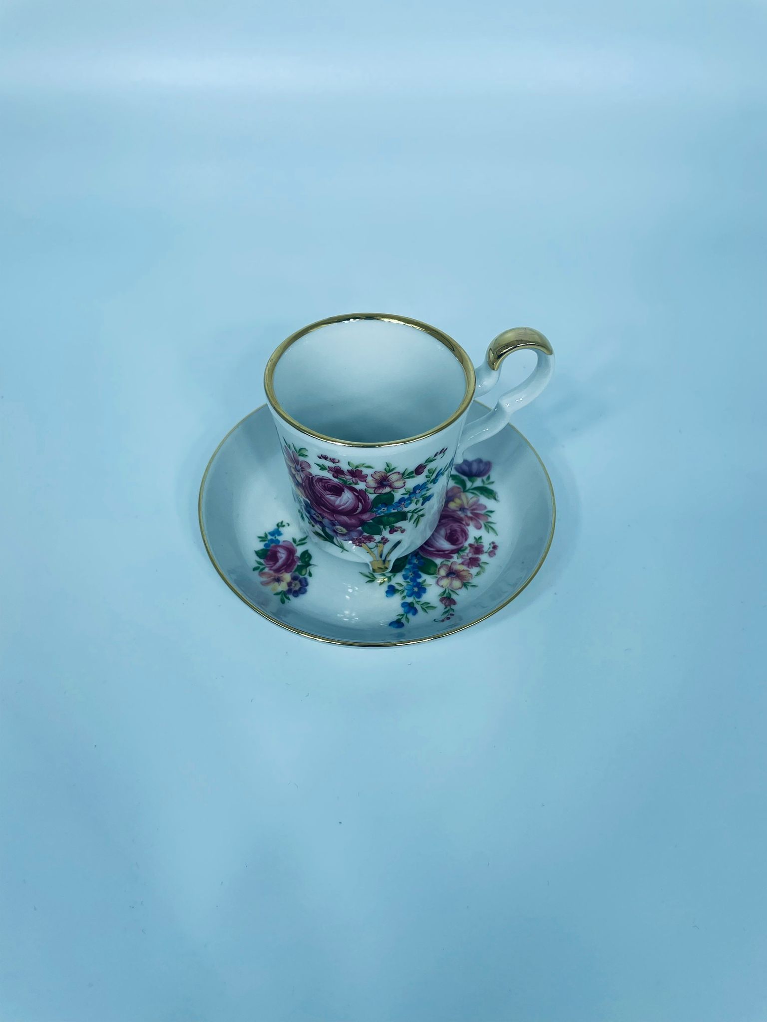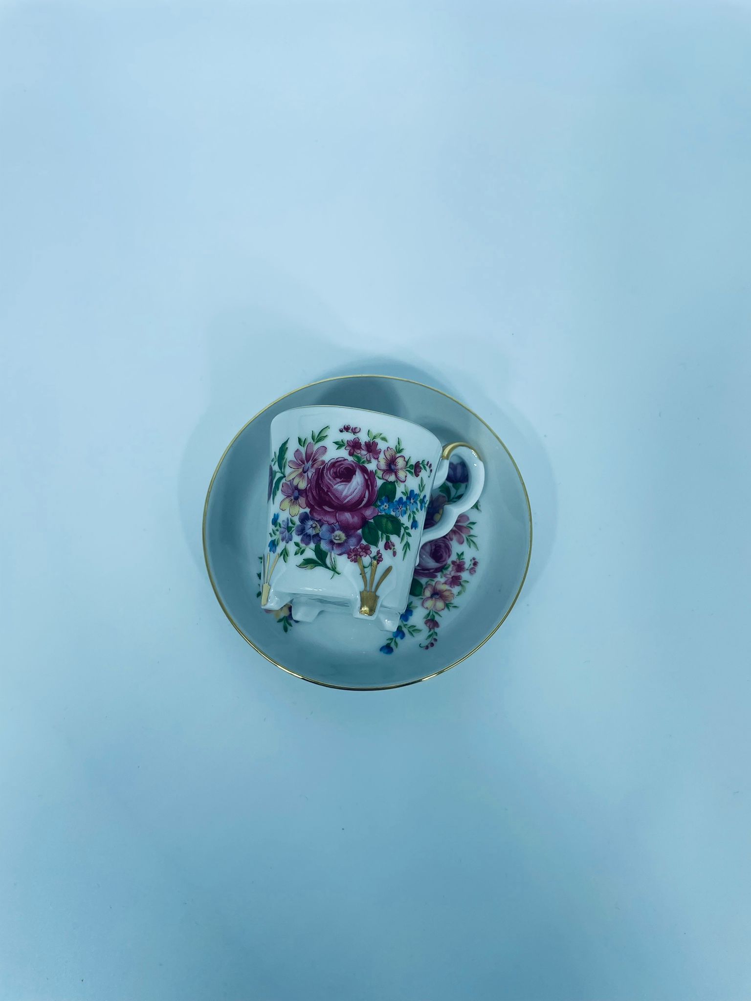 Filiżanka kolekcjonerska w zestawie duo, wytwórni Bareuther Waldsassen, wykonana z wysokiej jakości białej porcelany. Zestaw charakteryzuje się bogatym, wielokolorowym wzorem kwiatowym oraz pozlacanymi krawędziami. Filiżanka osadzona jest na czterech ozdobnych nóżkach ze złotymi akcentami.