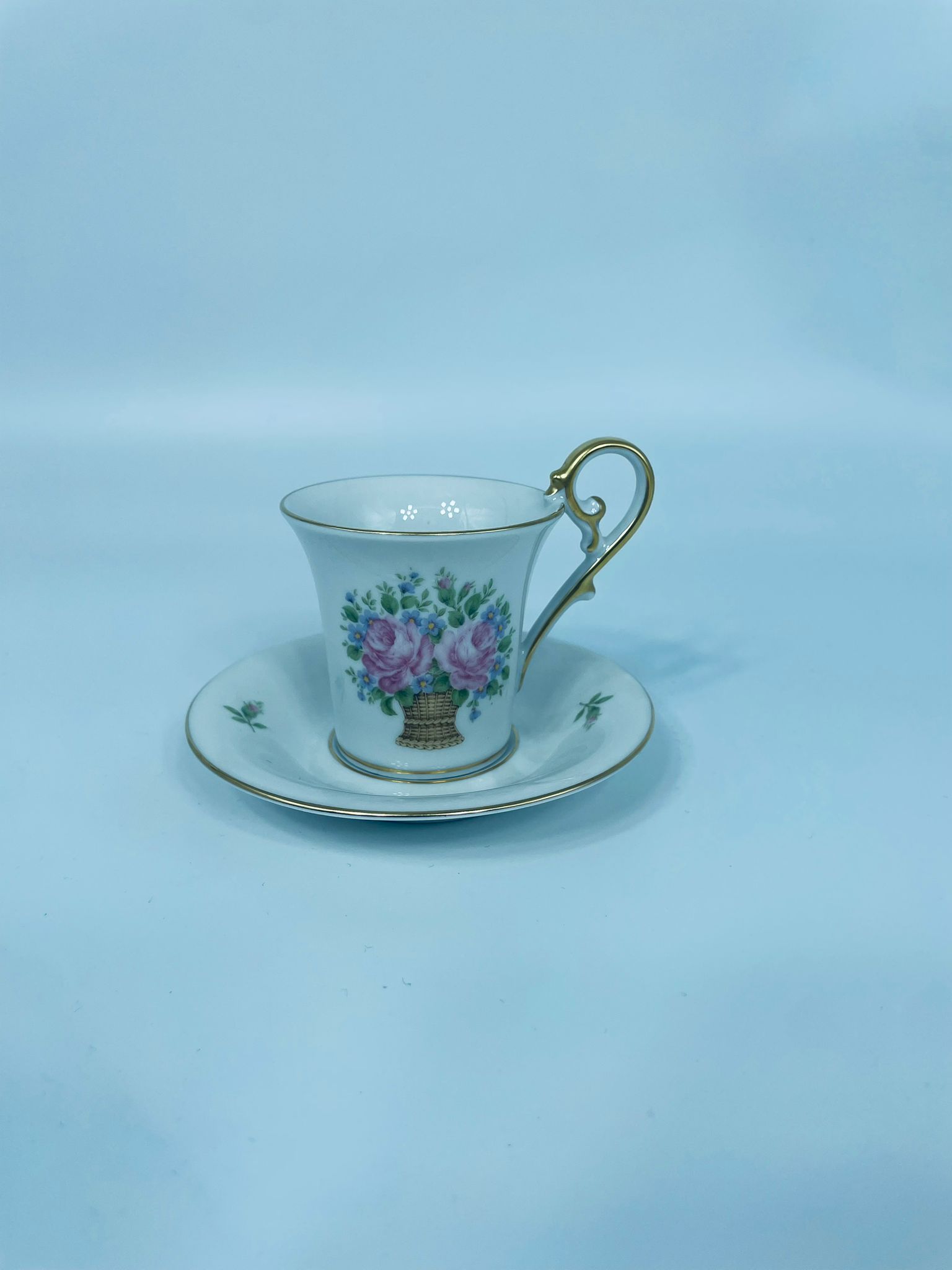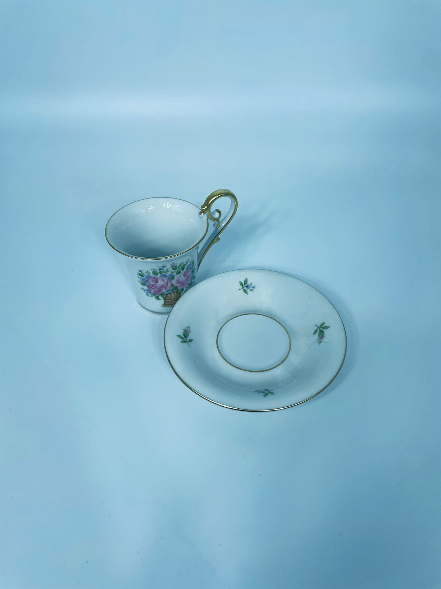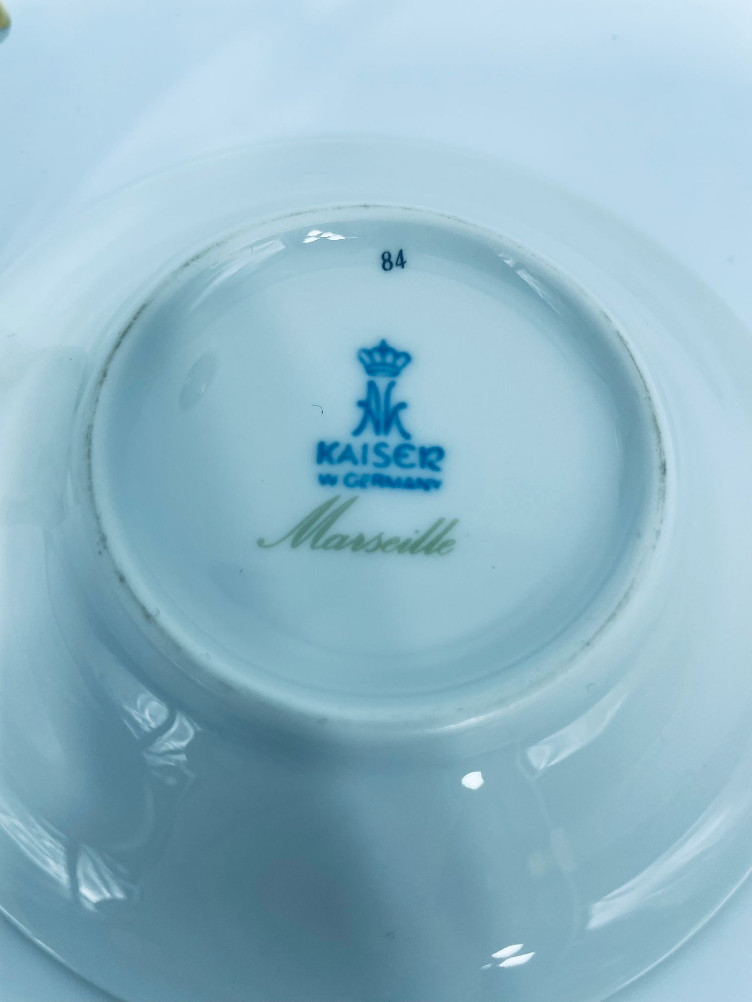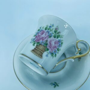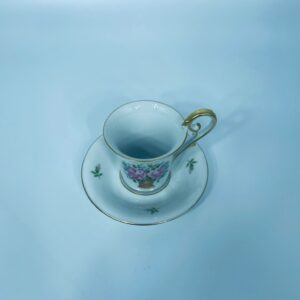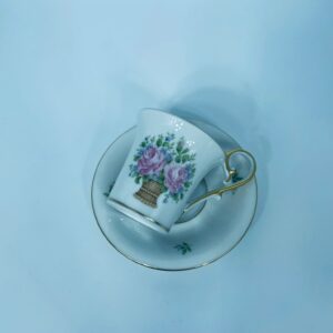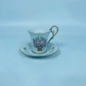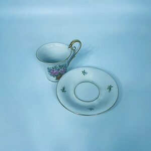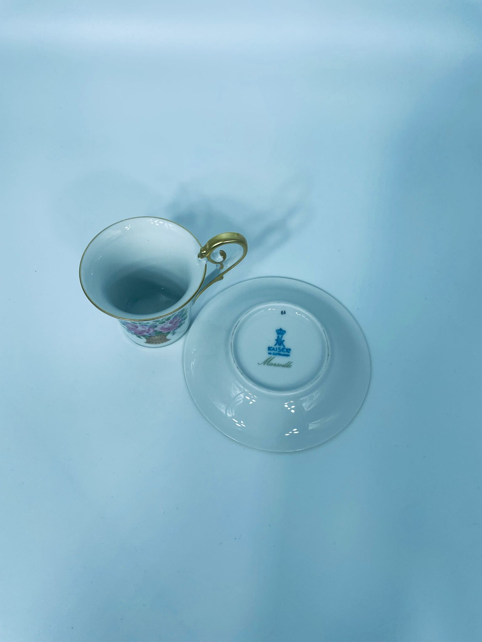 Filiżanka kolekcjonerska w zestawie duo wytwórni Kaiser, wykonany z wysokiej jakości białej porcelany. Zestaw charakteryzuje się wzorem „Marseille”, autora K. Nossek , piękną kompozycja kwiatowa, filiżanka z eleganckim wyprofilowanym, pastoralnym uszkiem, wykończony złoceniem na rantach.