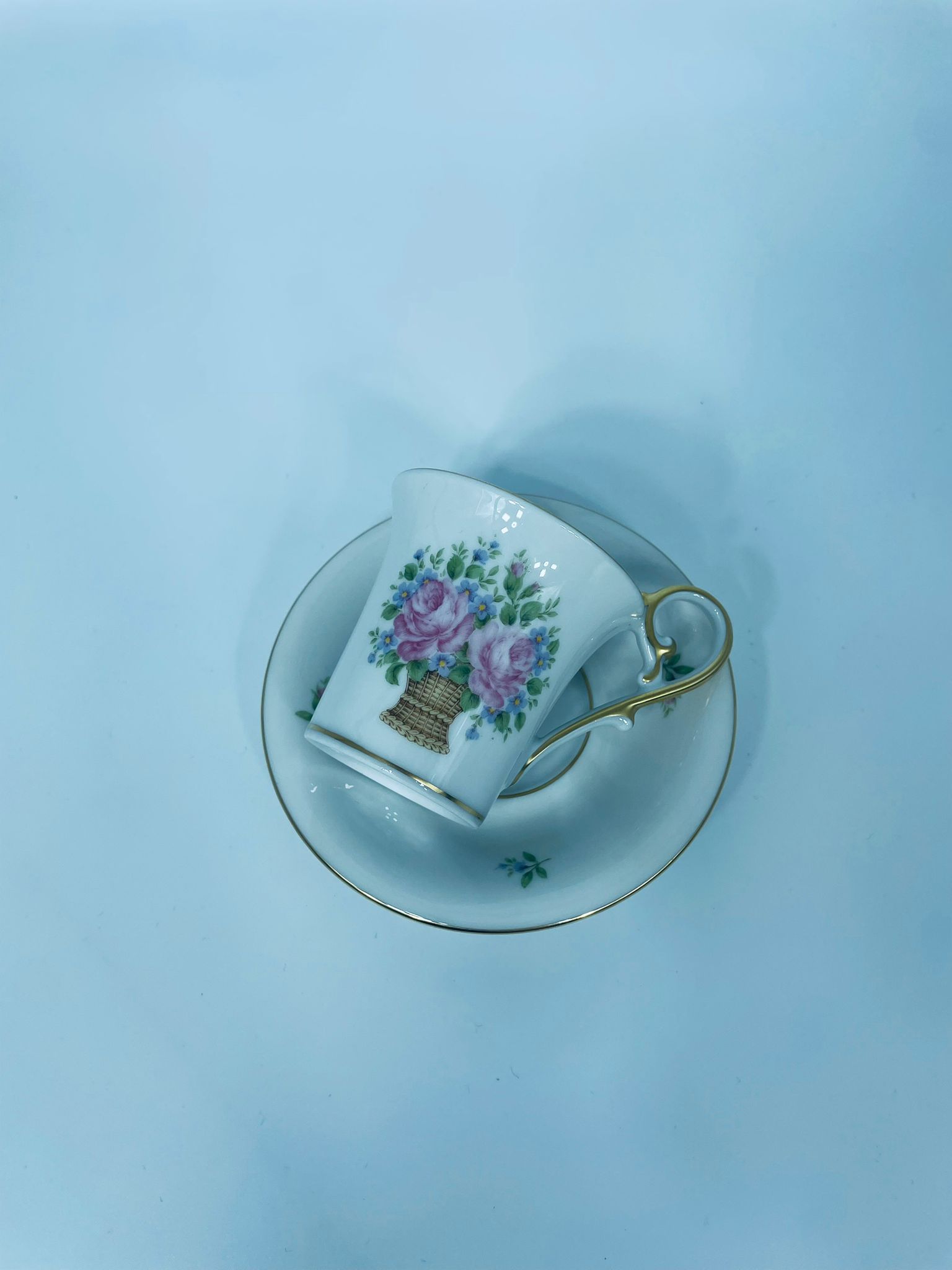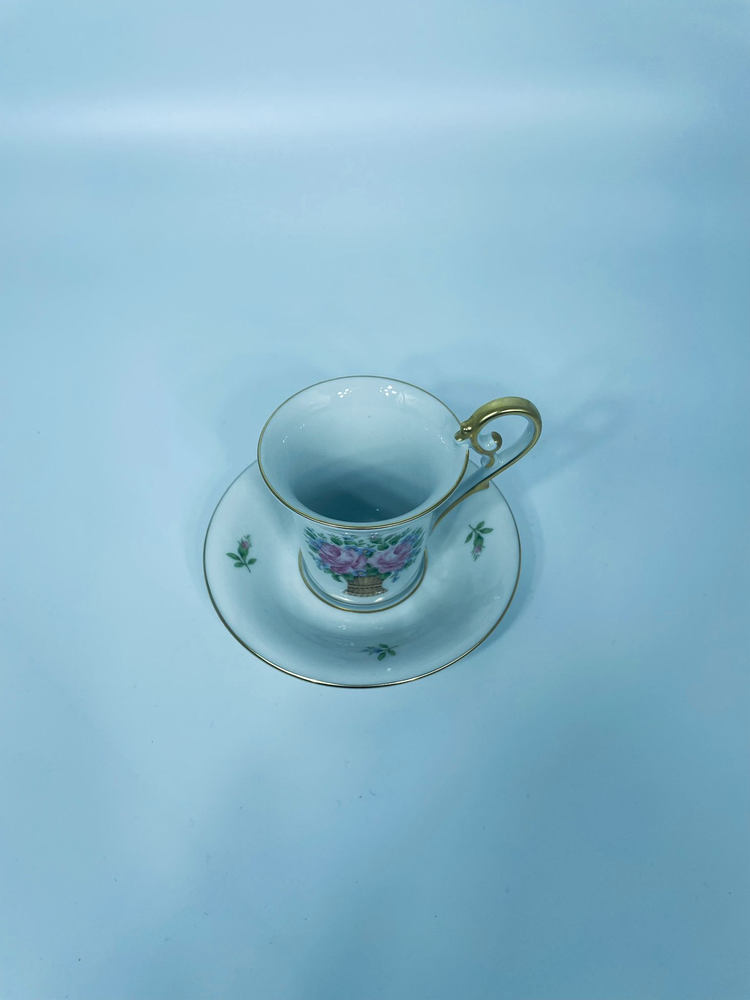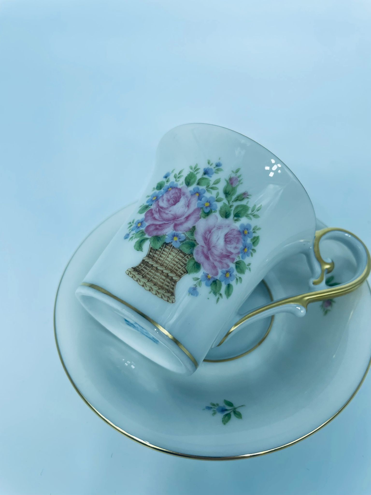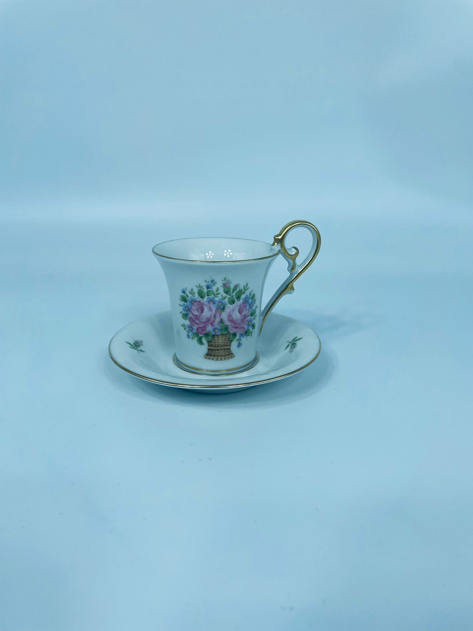 Filiżanka kolekcjonerska w zestawie duo wytwórni Kaiser, wykonany z wysokiej jakości białej porcelany. Zestaw charakteryzuje się wzorem „Marseille”, autora K. Nossek , piękną kompozycja kwiatowa, filiżanka z eleganckim wyprofilowanym, pastoralnym uszkiem, wykończony złoceniem na rantach.