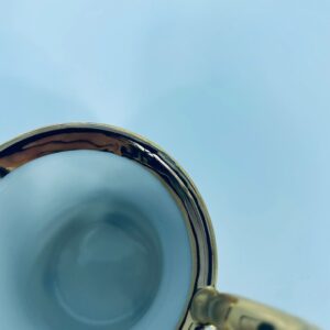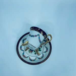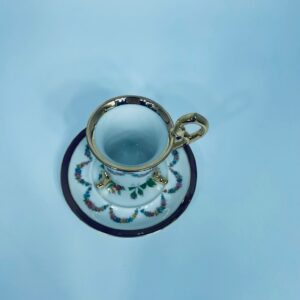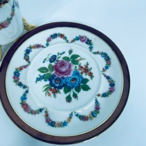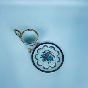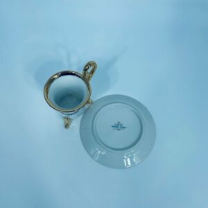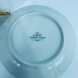 Filiżanka kolekcjonerska w zestawie duo, wytwórni Ohaishi China z 1932r., wykonana z wysokiej jakości białej porcelany japońskiej. Zestaw charakteryzuje się ręcznie malowanym wzorem, pięknych, kolorowych, delikatnych kwiatuszków. Filiżanka osadzona na trzech dekoracyjnych, złotych nóżkach, posiada piękny, złoty uchwyt, wykonczona złoceniem na górnym rancie. Talerzyk wykończony fioletowym pasem ze złoceniem na rancie. Posiada delikatne przetarcie na złoceniu.