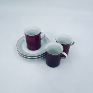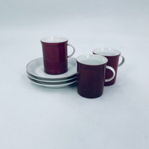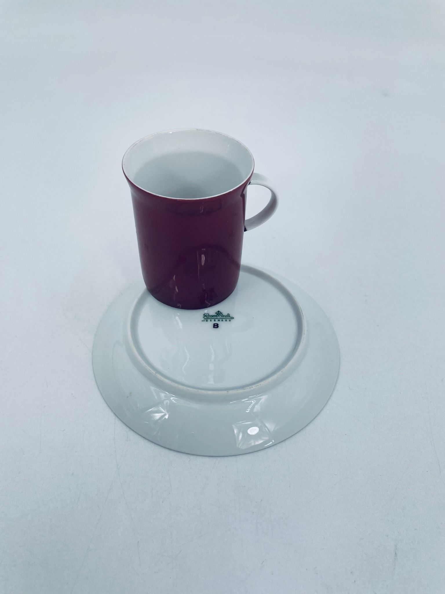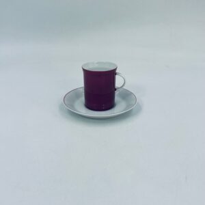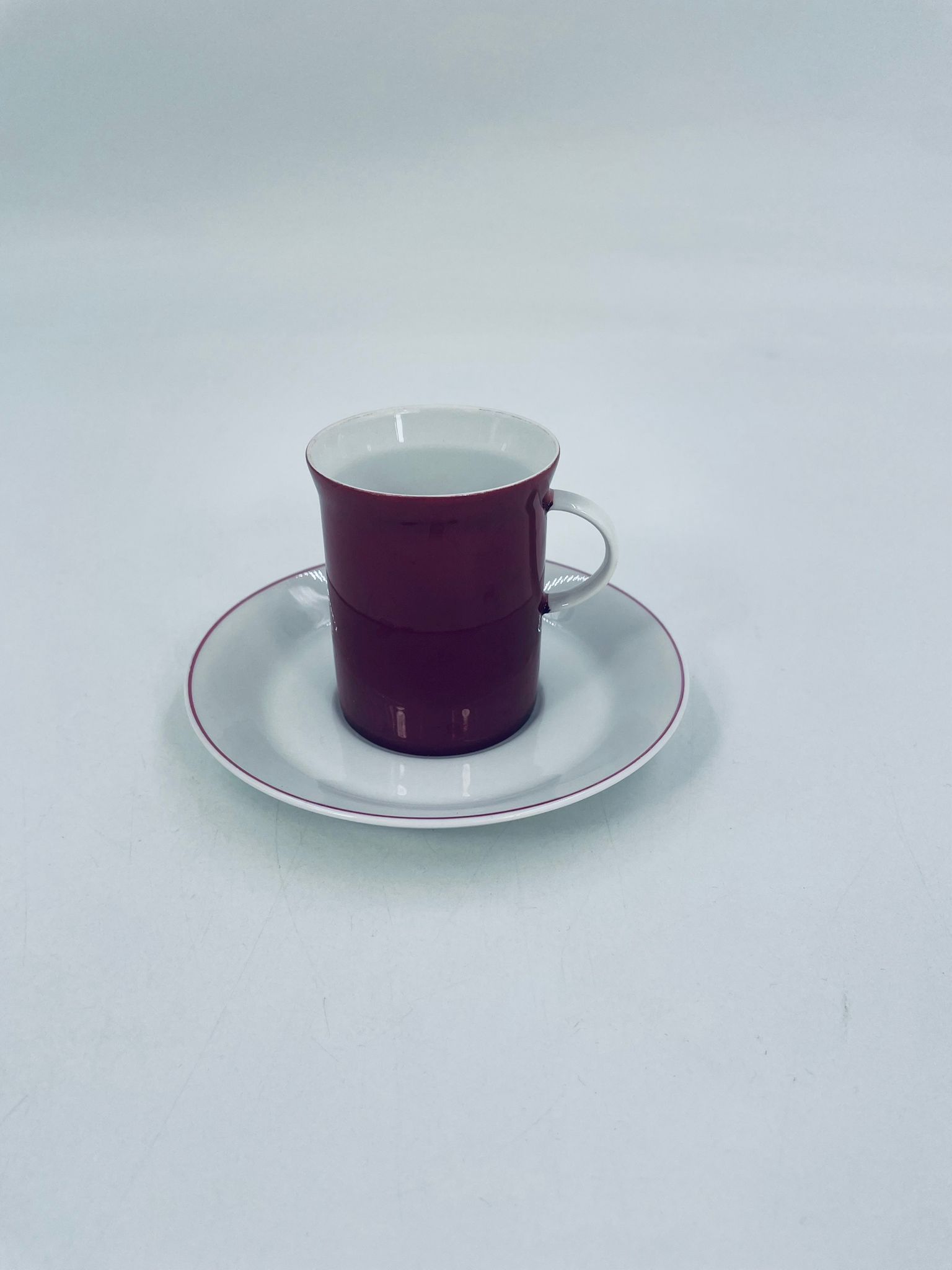 Filiżanka kolekcjonerska w zestawie duo, znanej wytwórni Rosenthal. Zestaw wykonany jest z wysokiej jakości białej porcelany. Filiżanka koloru bordowego, a talerzyk biały z wykończeniem bordowym na obrzeżu.