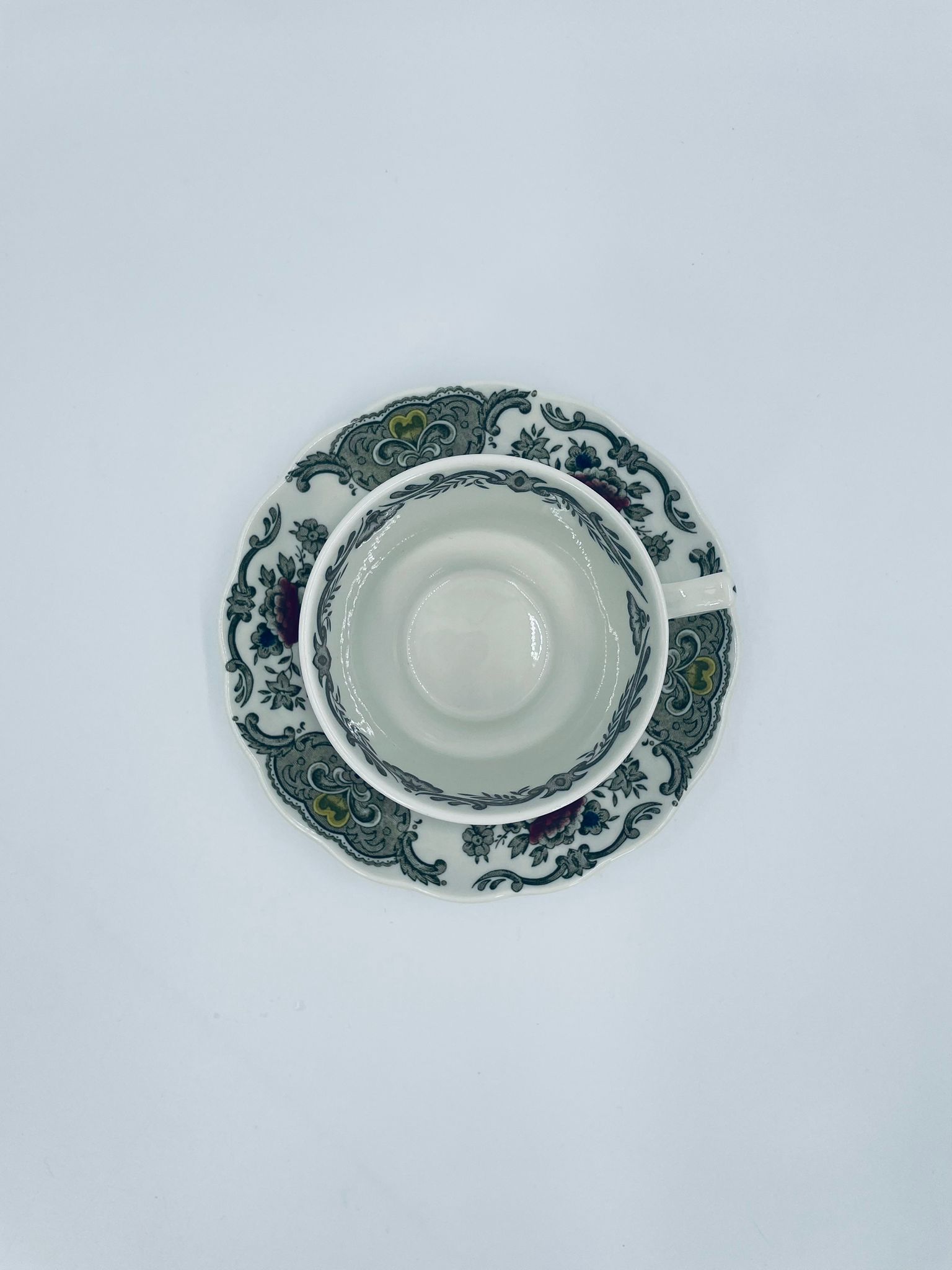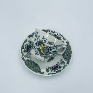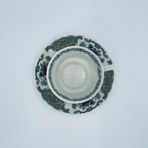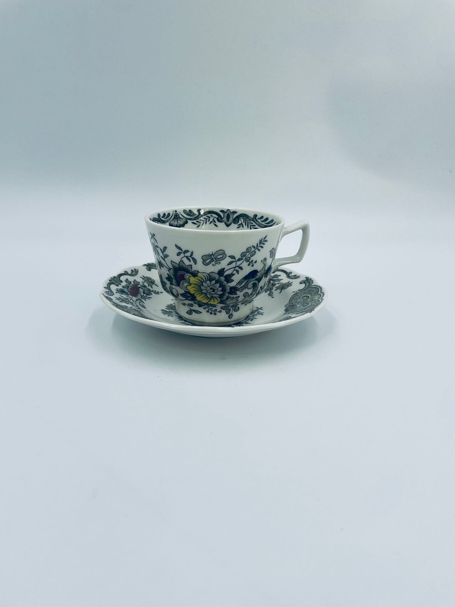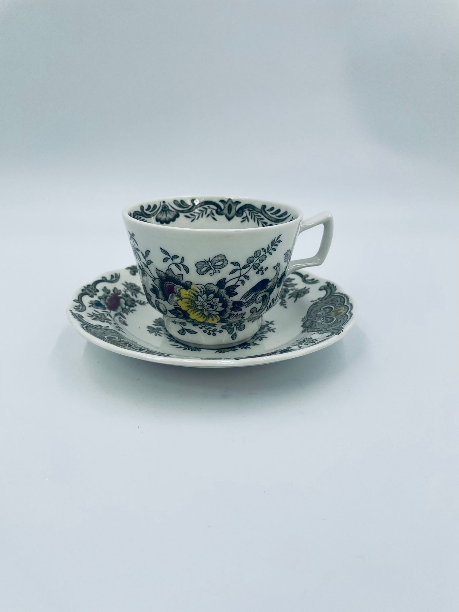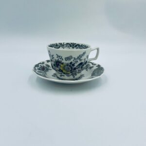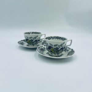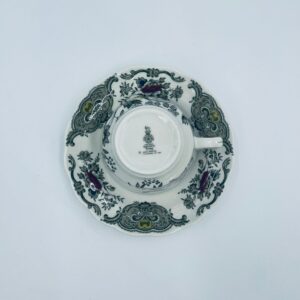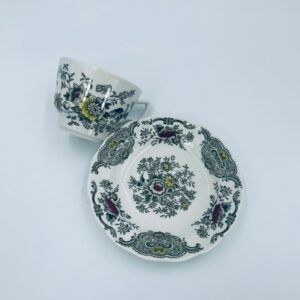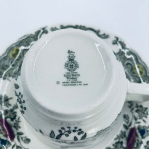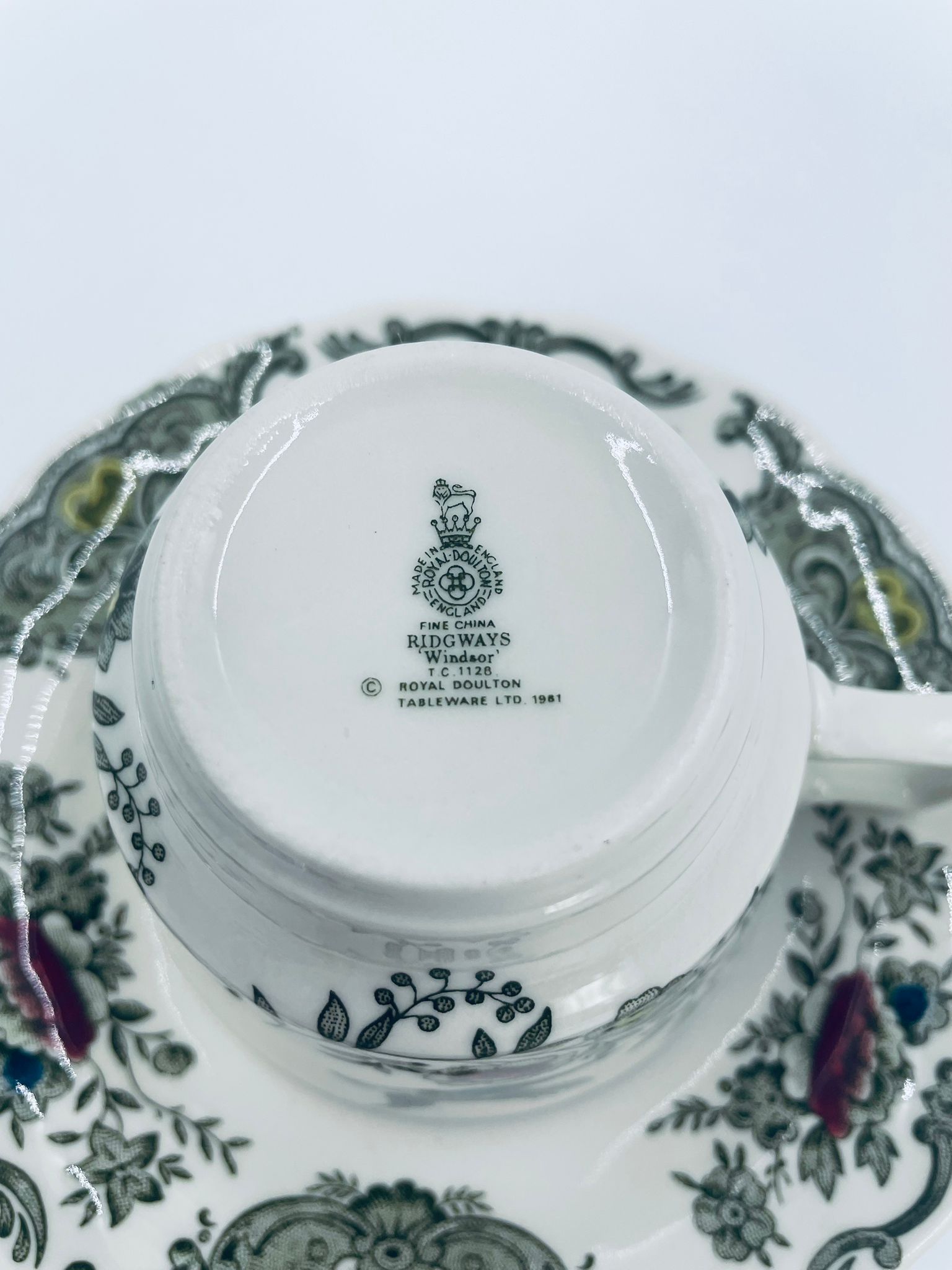 Filiżanka kolekcjonerska w zestawie duo, wytwórni Royal Doulton Tableware z 1981r., wykonana z wysokiej jakości szlachetnej, angielskiej porcelany. Zestaw we wzorze „Ridgways ‚Windsor’” , charakteryzuje się pięknym wzorem kwiatów i ręcznie grawerowanym wzorem bażantów. Filiżanka wewnątrz ozdobiona motywem roślinnym oraz z dekoracyjnym uchwytem, talerz z falistą krawędzią.