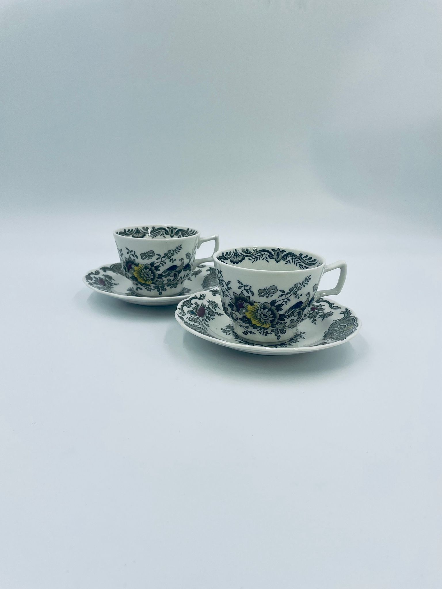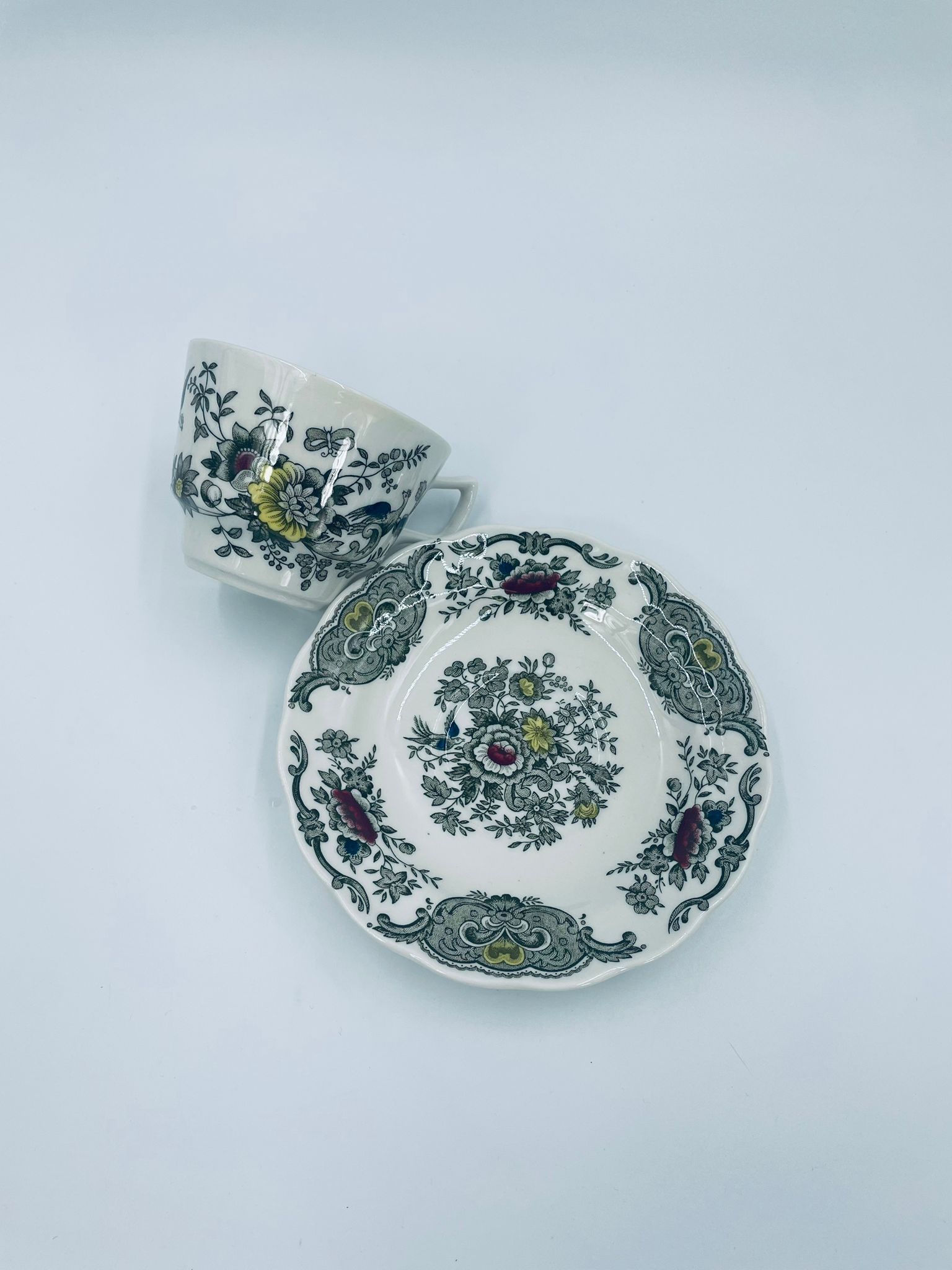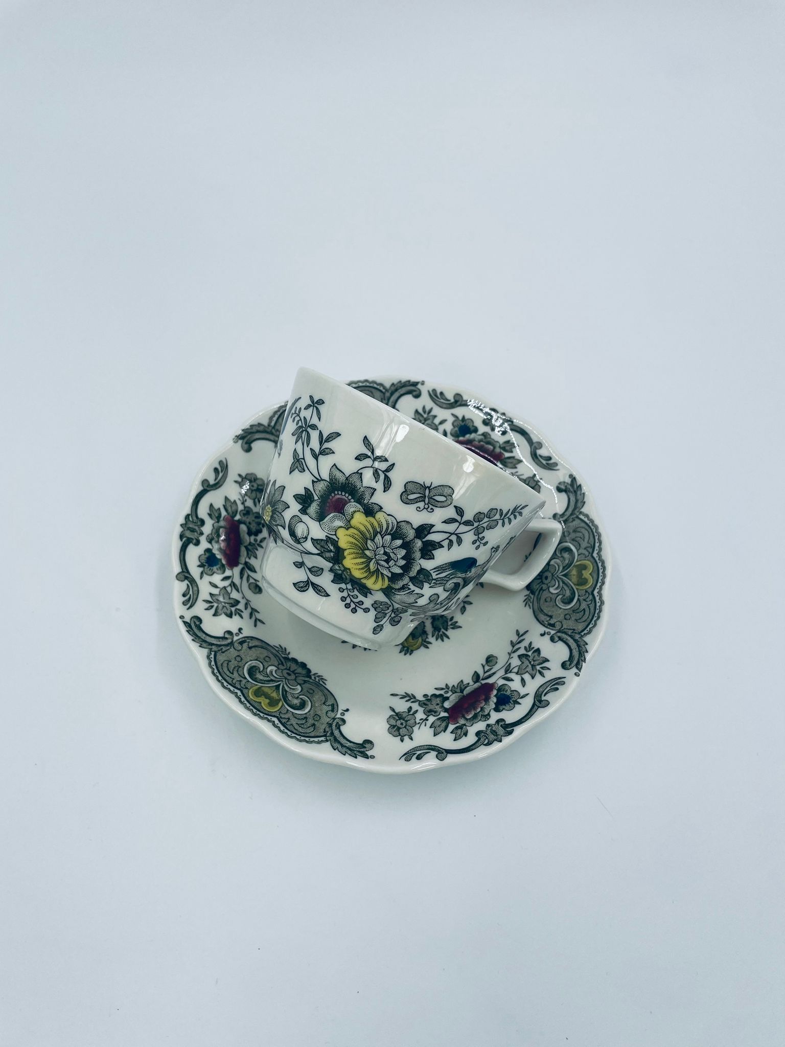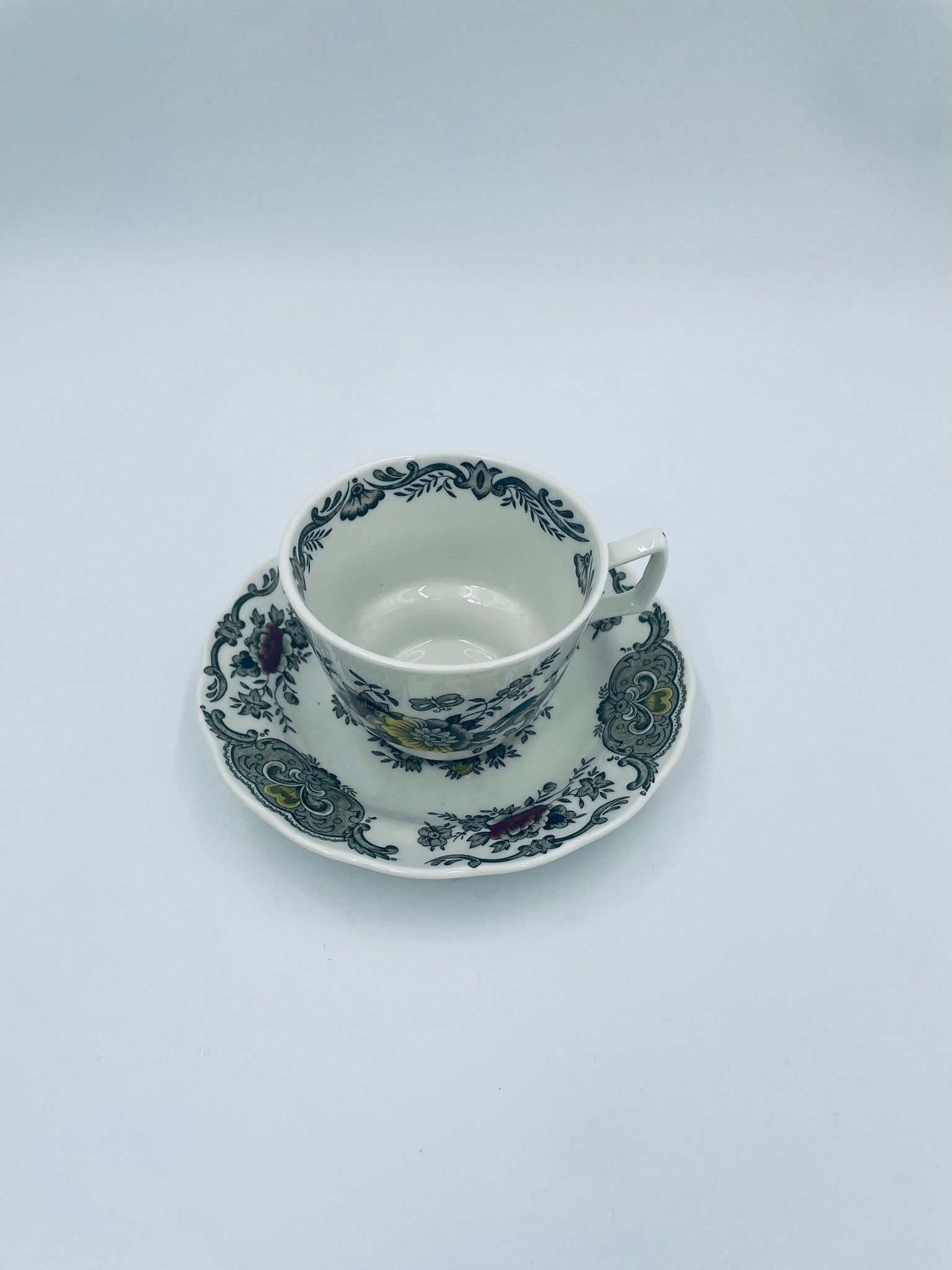 Filiżanka kolekcjonerska w zestawie duo, wytwórni Royal Doulton Tableware z 1981r., wykonana z wysokiej jakości szlachetnej, angielskiej porcelany. Zestaw we wzorze „Ridgways ‚Windsor’” , charakteryzuje się pięknym wzorem kwiatów i ręcznie grawerowanym wzorem bażantów. Filiżanka wewnątrz ozdobiona motywem roślinnym oraz z dekoracyjnym uchwytem, talerz z falistą krawędzią.