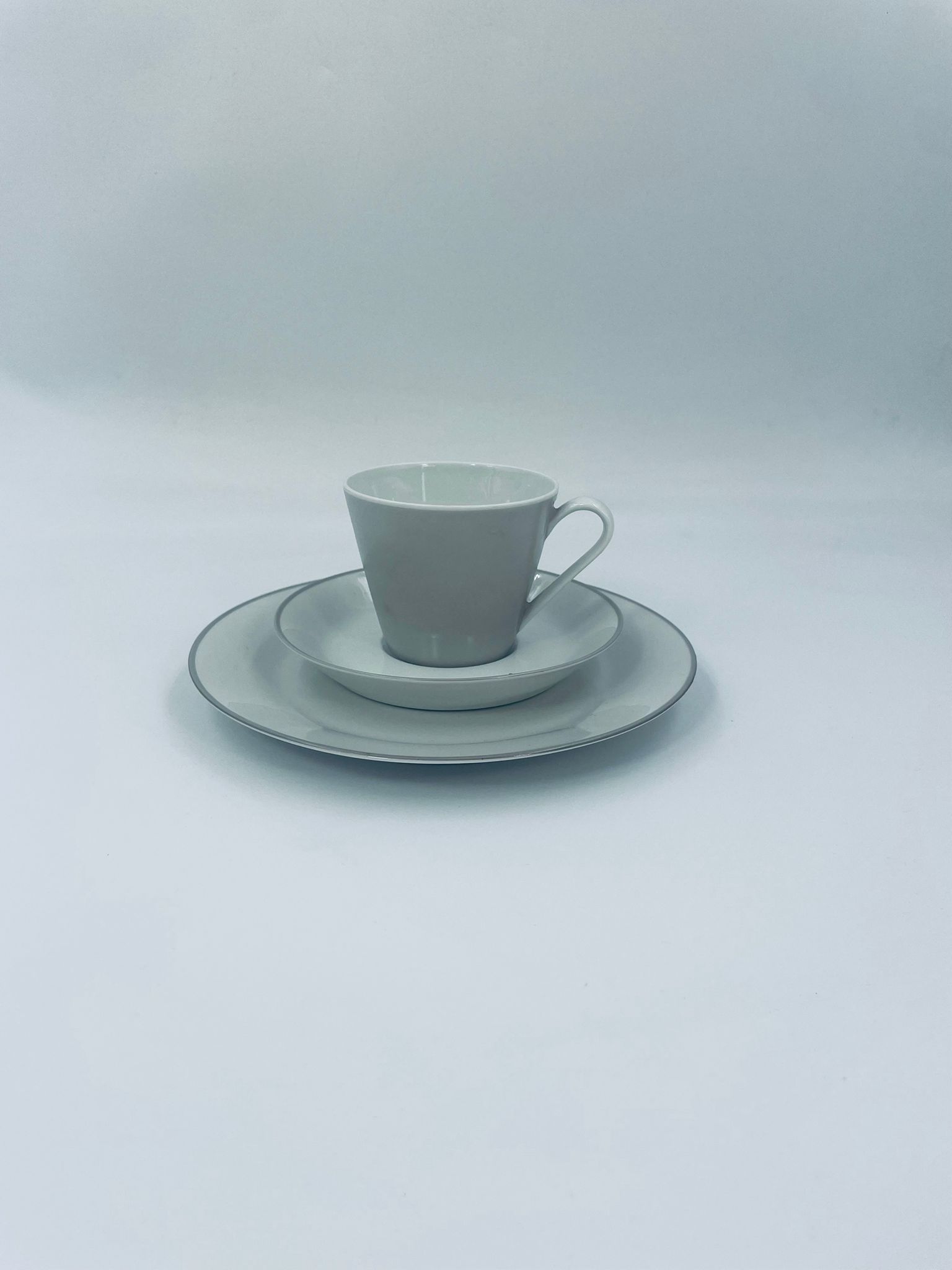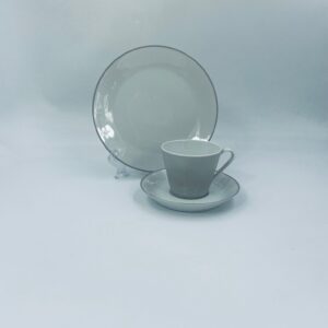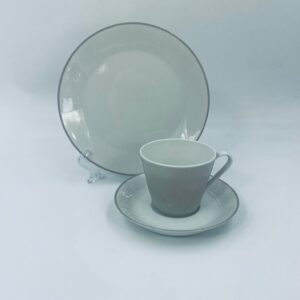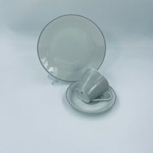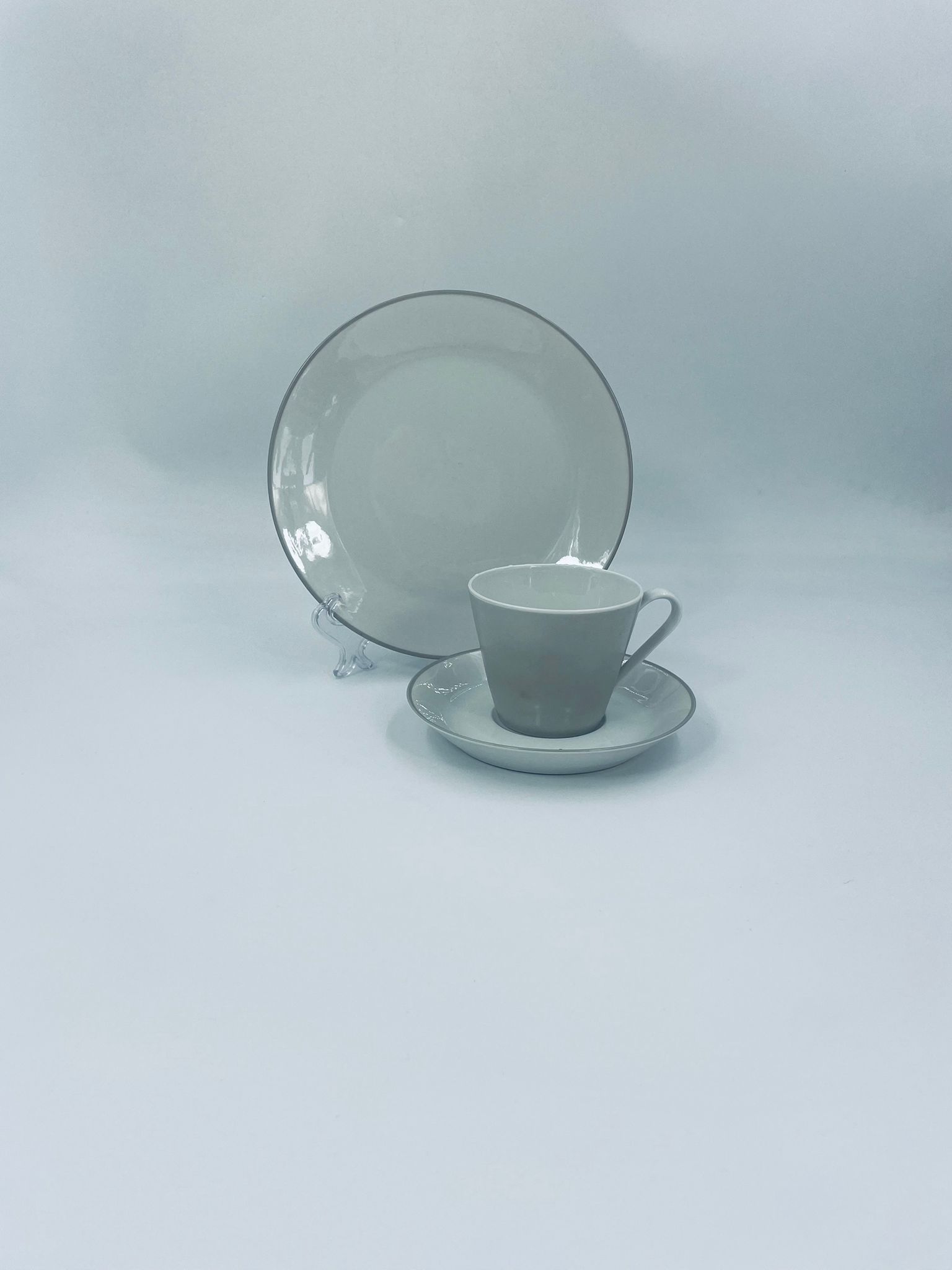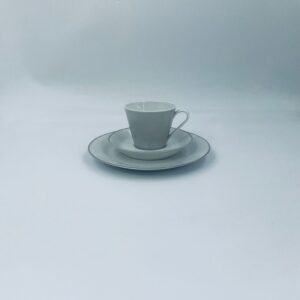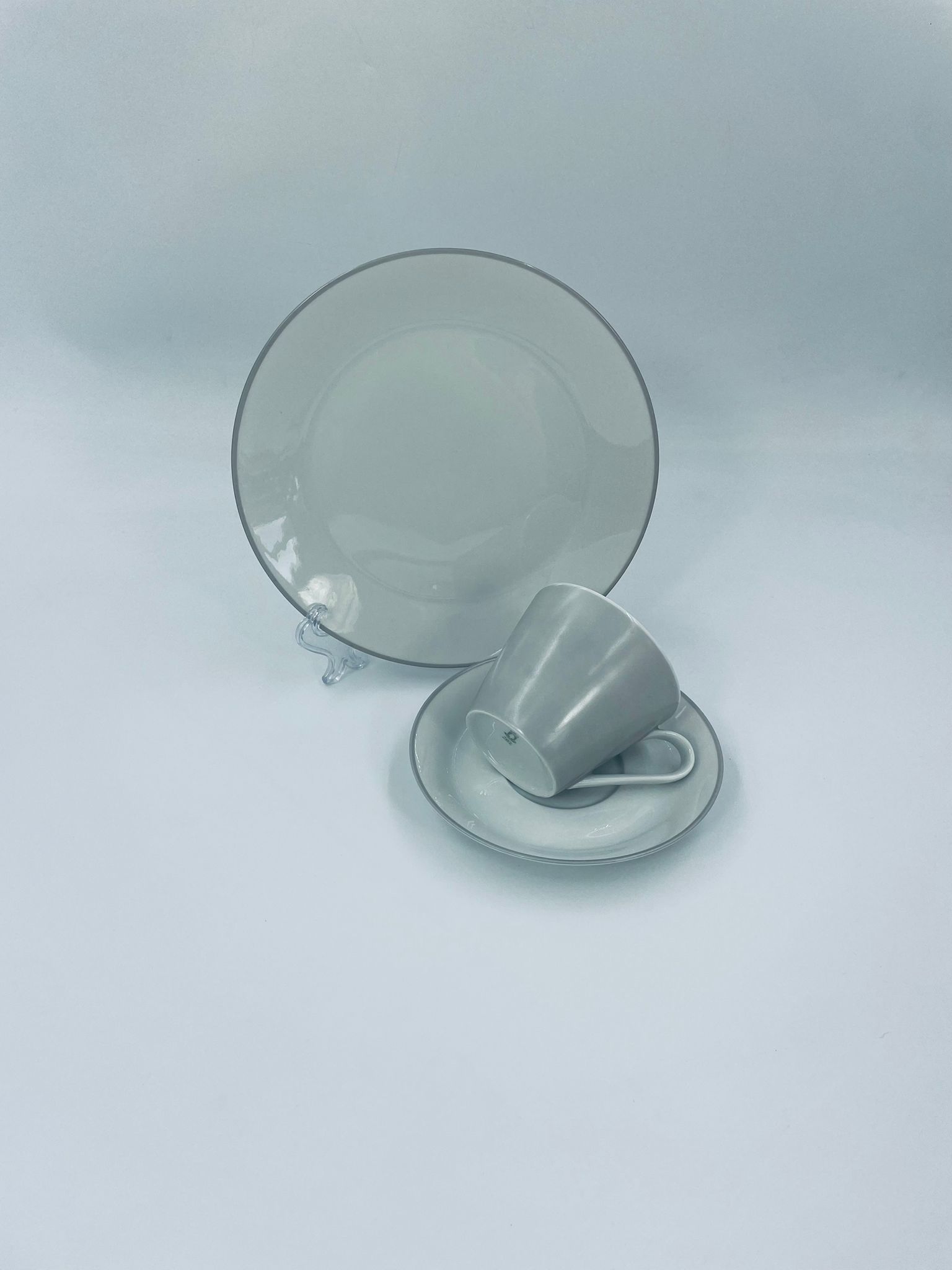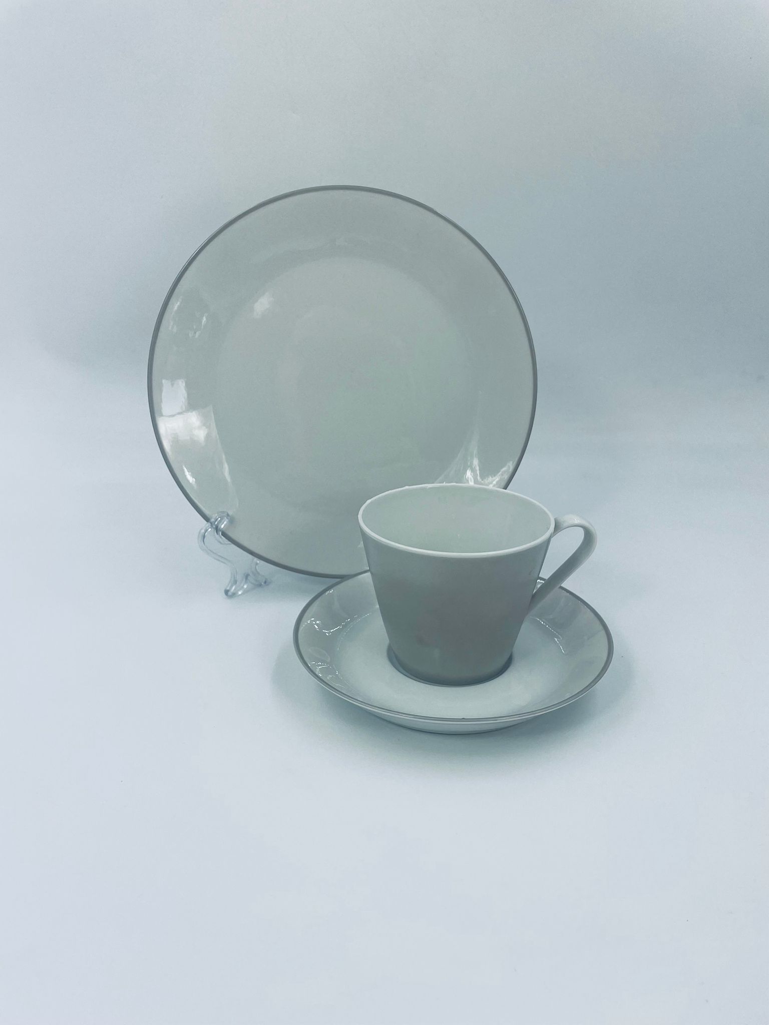 Filiżanka kolekcjonerska w zestawie trio wytwórni Schönwald, wykonana z wysokiej jakości białej porcelany z odcieniem szarości. Talerzyki również wykończone na rantach szarością. Zestaw klasyczny do użytku codziennego.