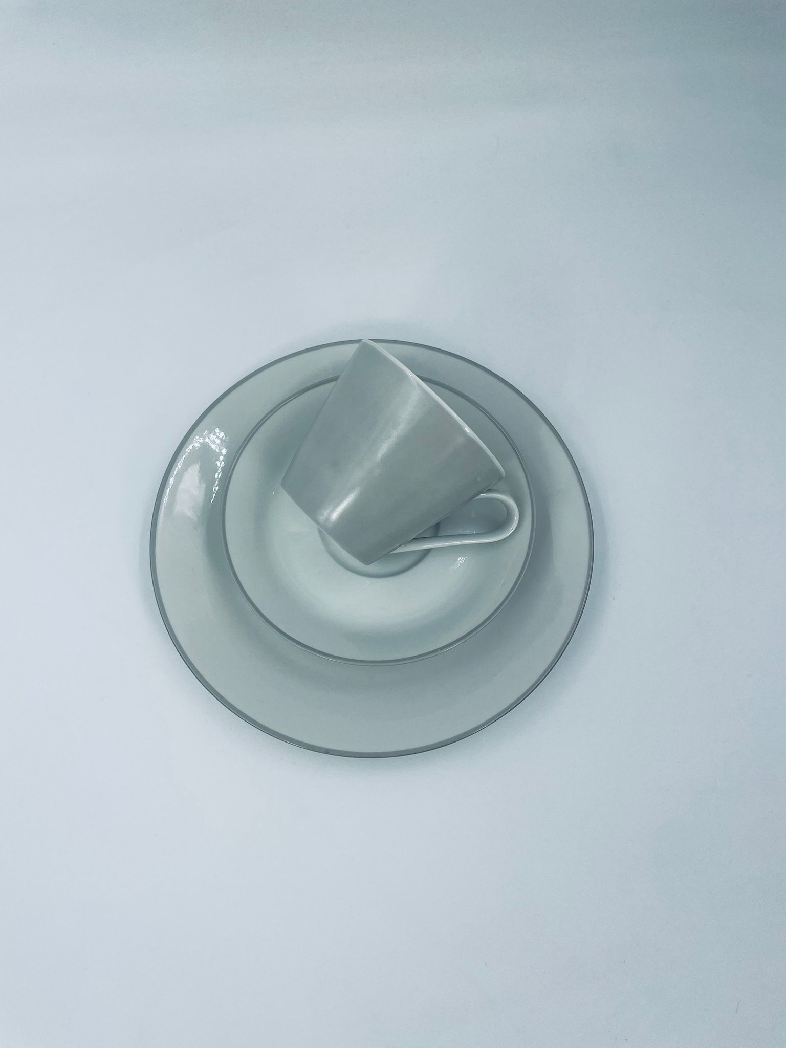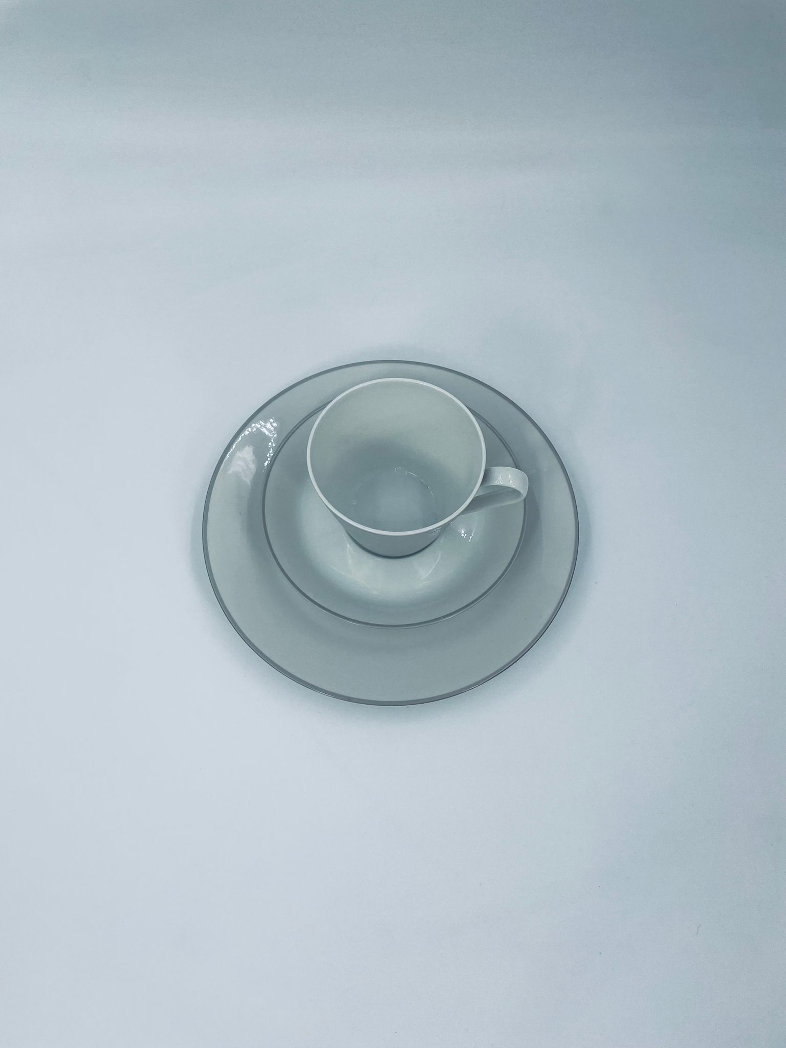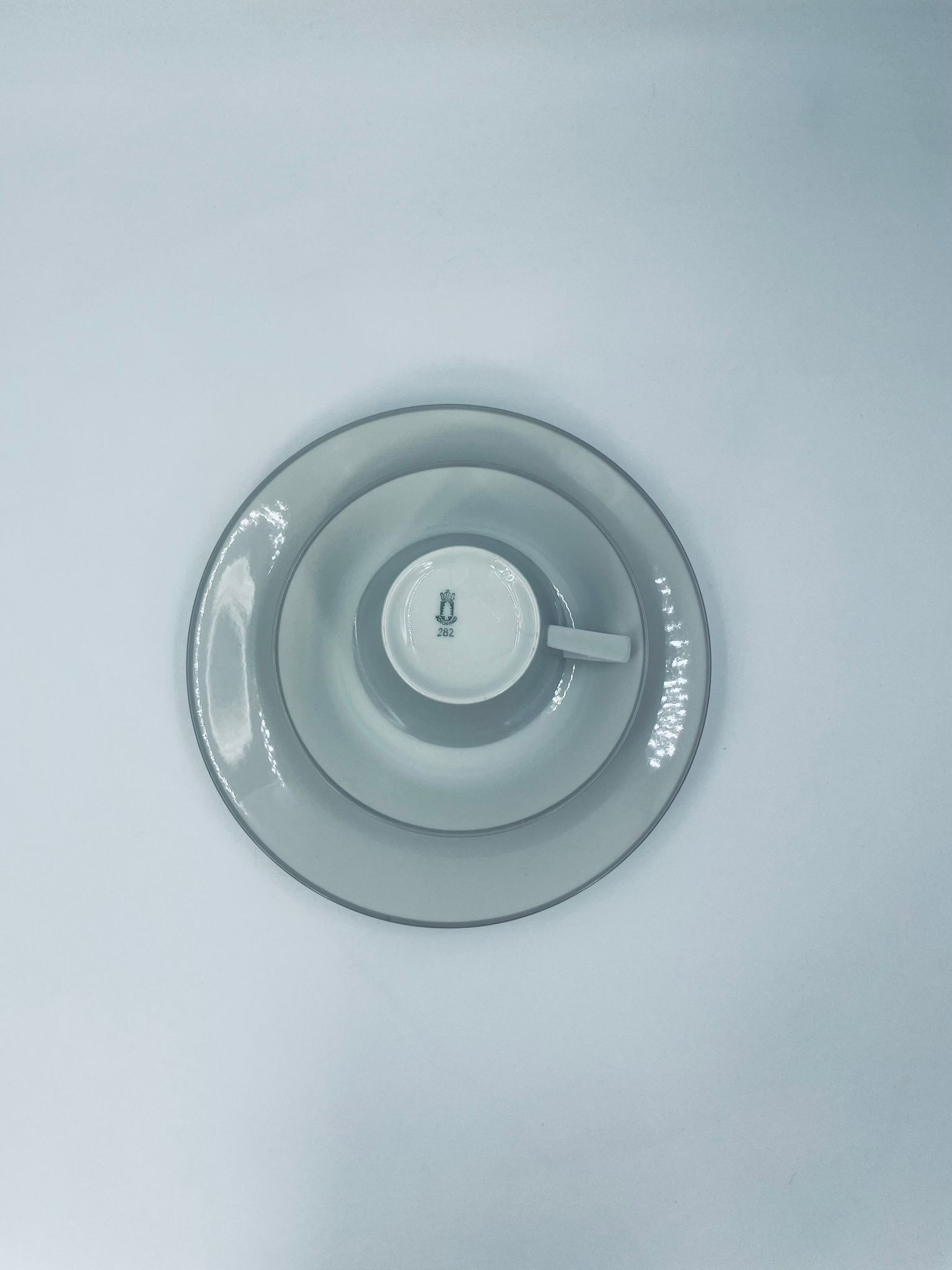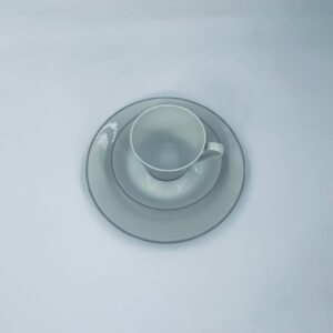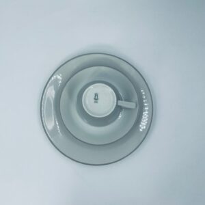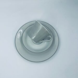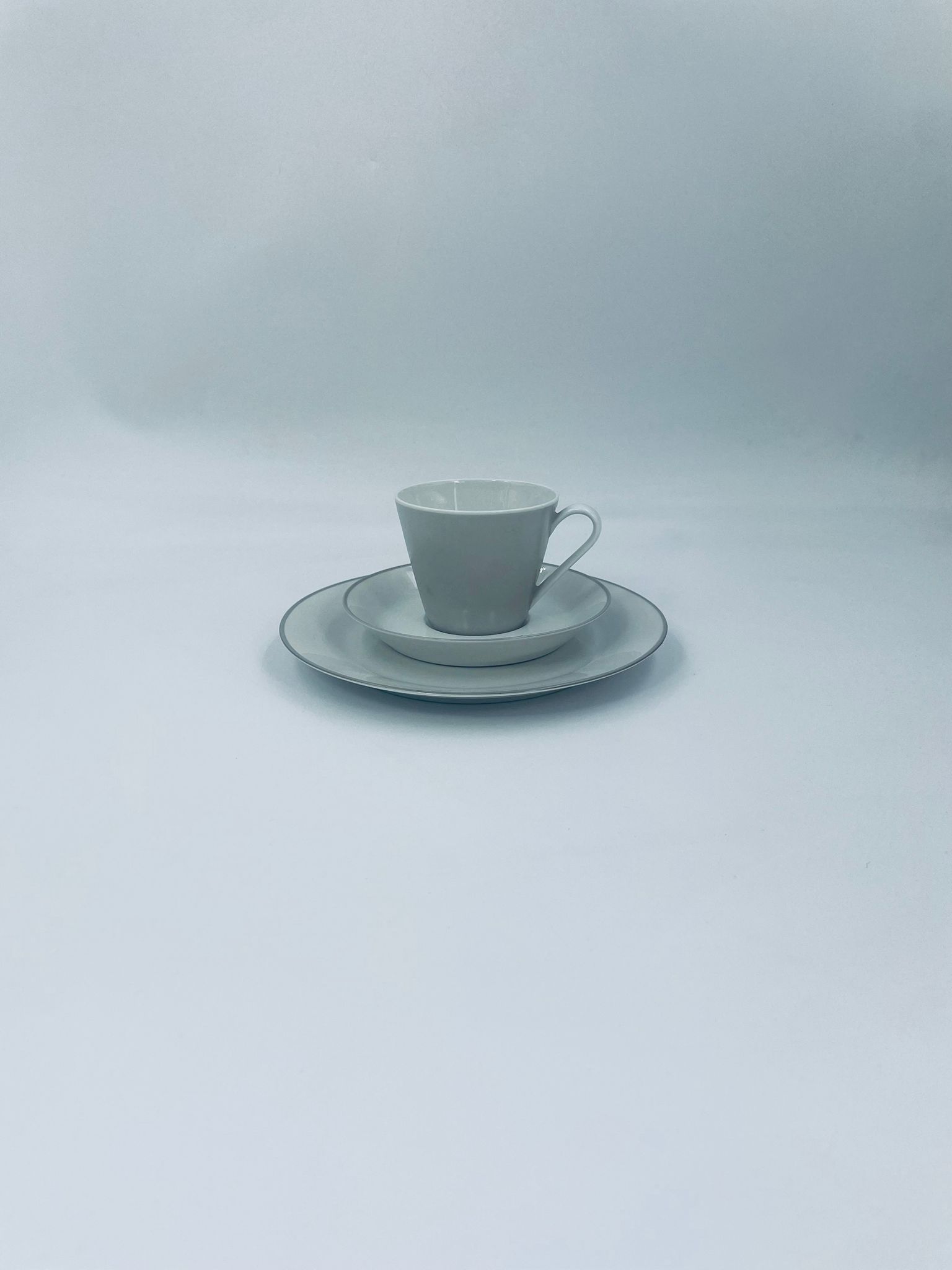 Filiżanka kolekcjonerska w zestawie trio wytwórni Schönwald, wykonana z wysokiej jakości białej porcelany z odcieniem szarości. Talerzyki również wykończone na rantach szarością. Zestaw klasyczny do użytku codziennego.