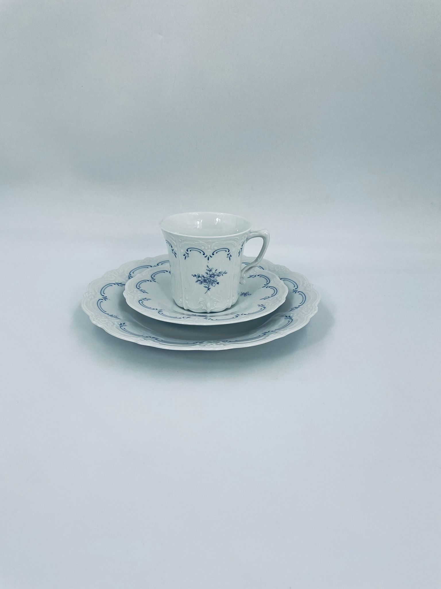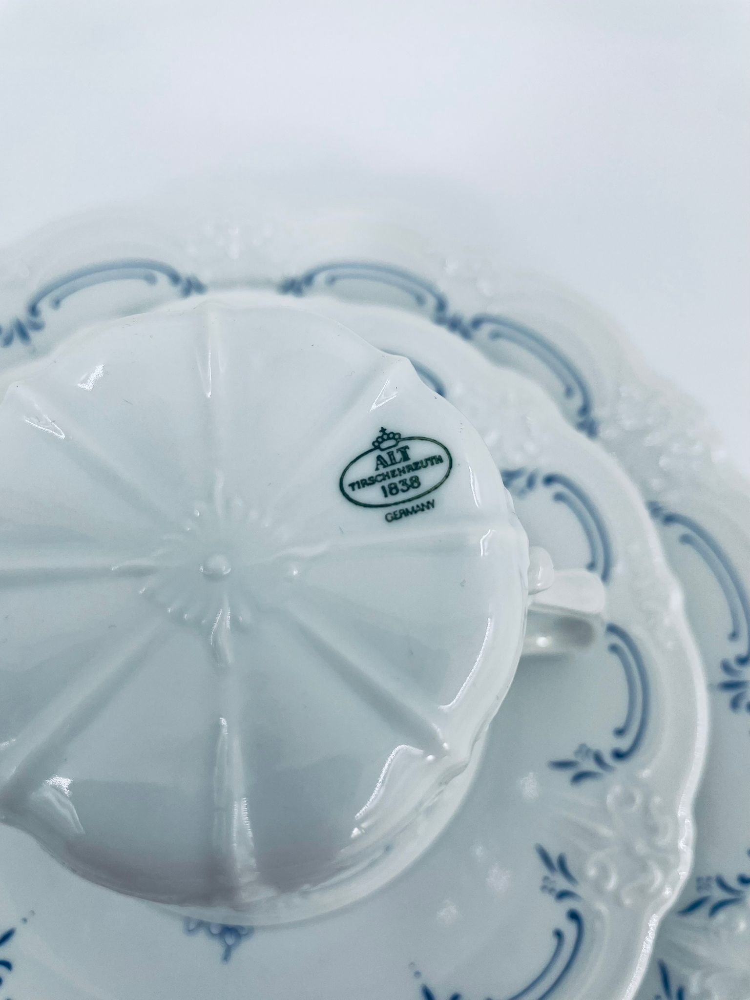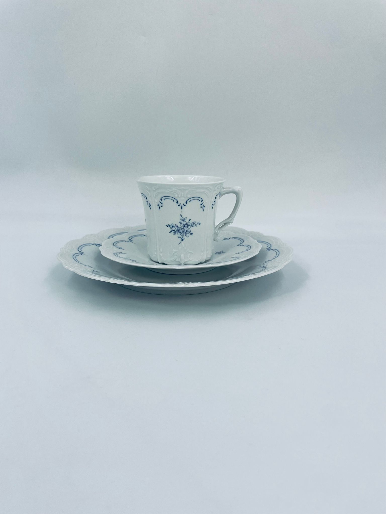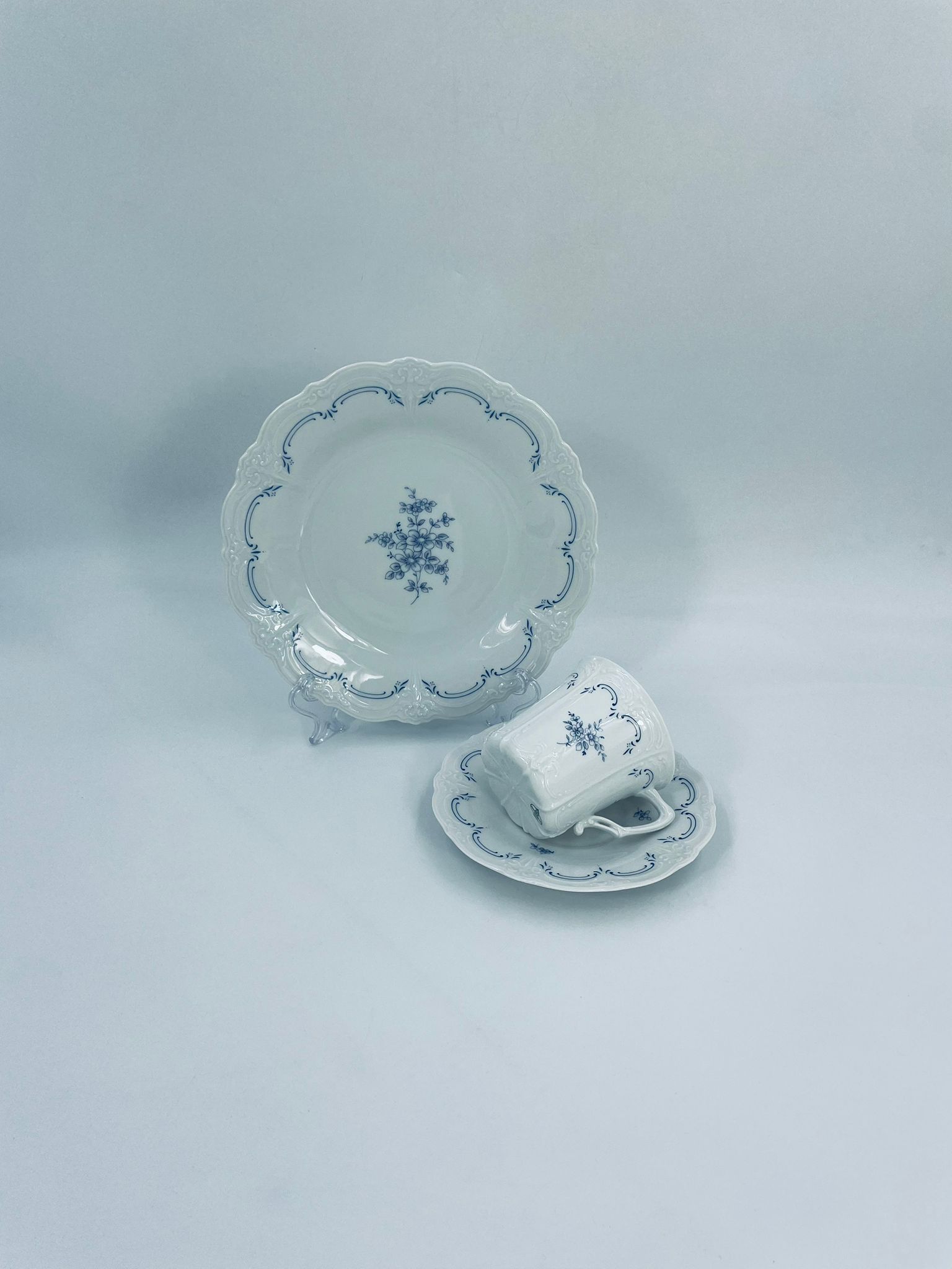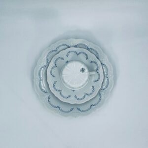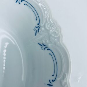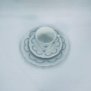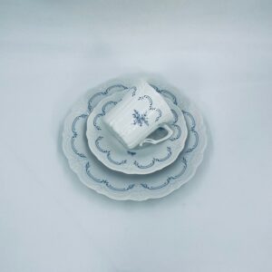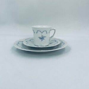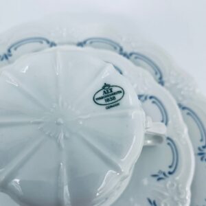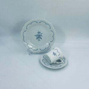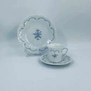 Filiżanka kolekcjonerska w zestawie trio wytwórni Tirschenreutch wykonana z wysokiej jakości białej porcelany. Zestaw we wzorze Fleur De Lis Blue, charakteryzujący się niebieskimi akcentami, kwiatowym wzorem, ozdobnymi reliefami i pofalowanym brzegiem.