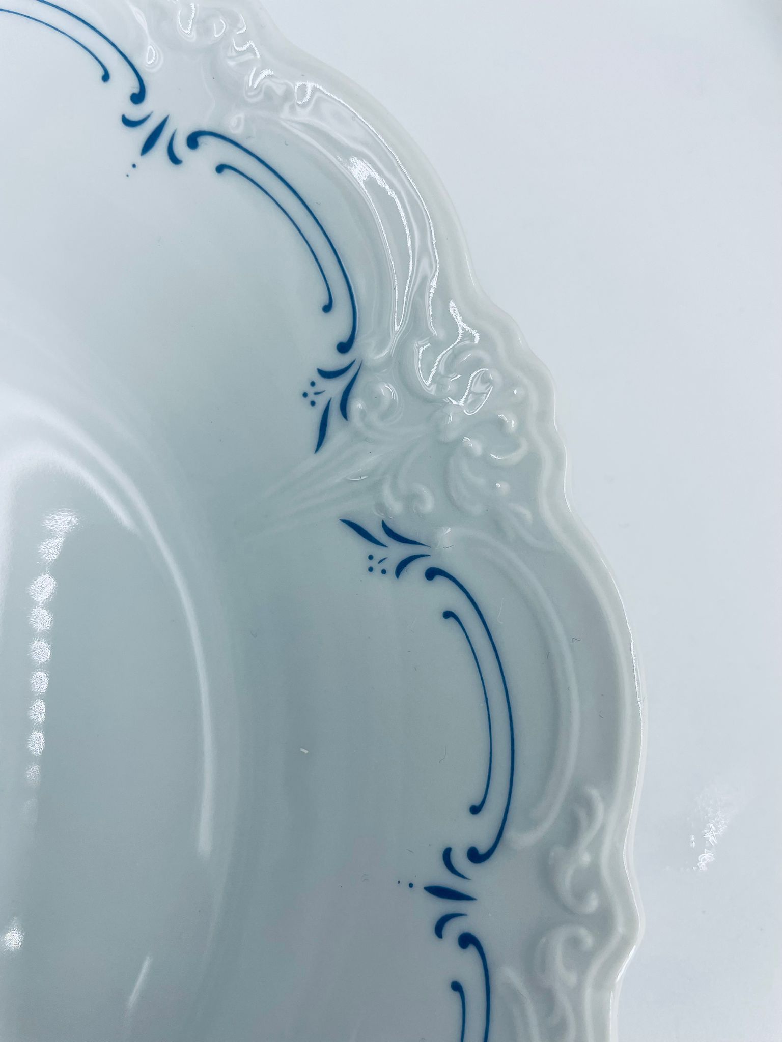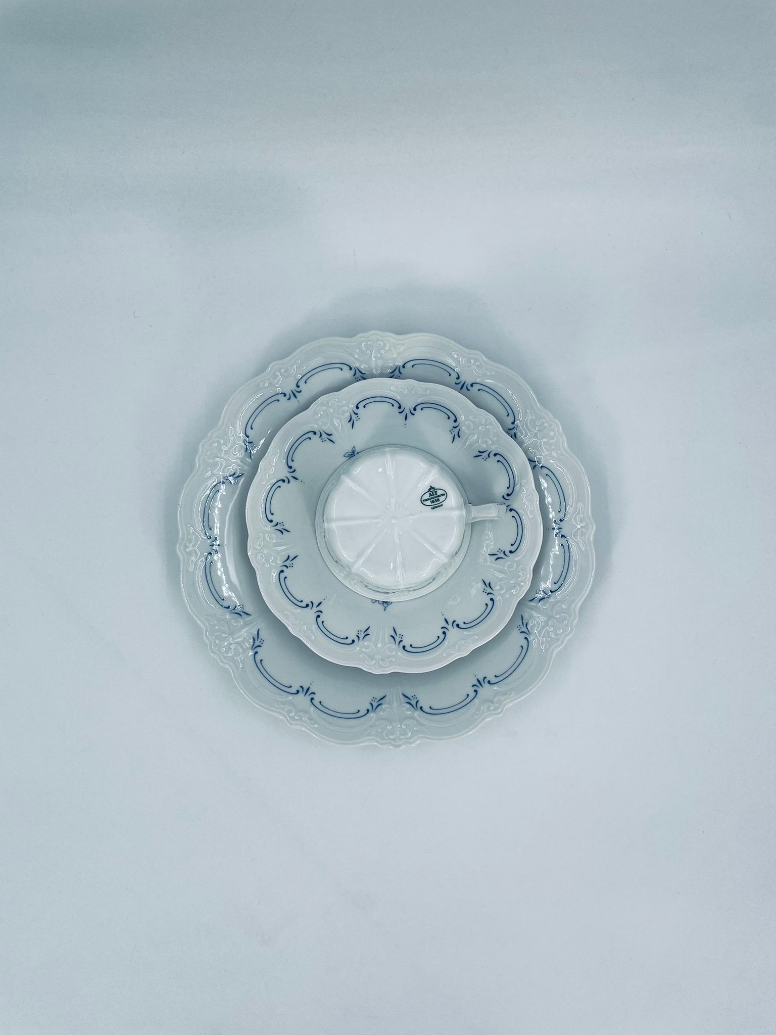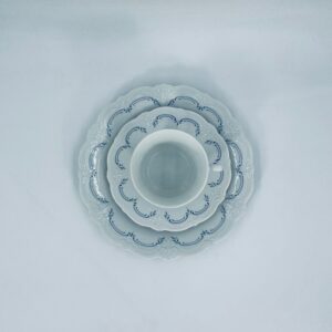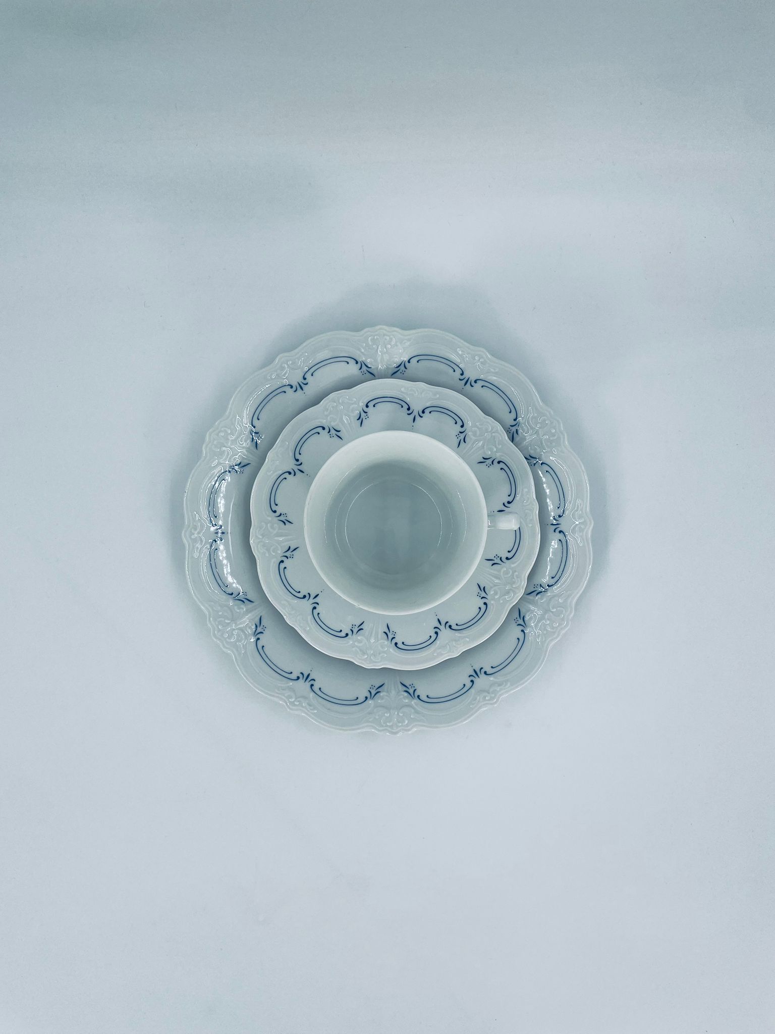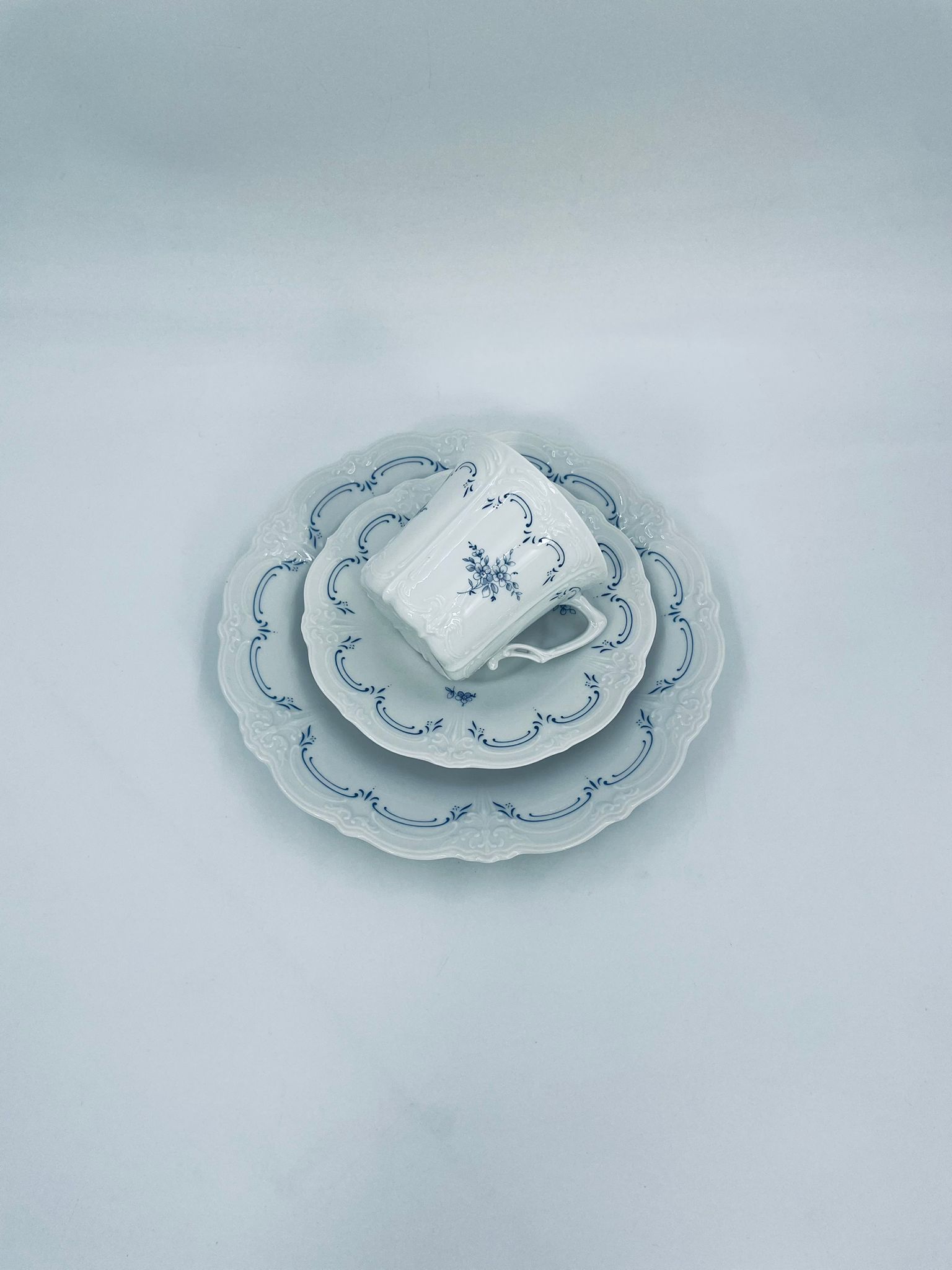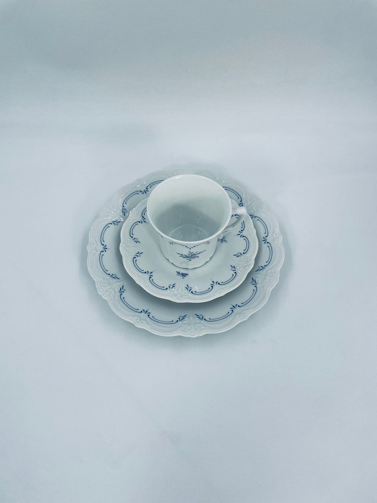 Filiżanka kolekcjonerska w zestawie trio wytwórni Tirschenreutch wykonana z wysokiej jakości białej porcelany. Zestaw we wzorze Fleur De Lis Blue, charakteryzujący się niebieskimi akcentami, kwiatowym wzorem, ozdobnymi reliefami i pofalowanym brzegiem.