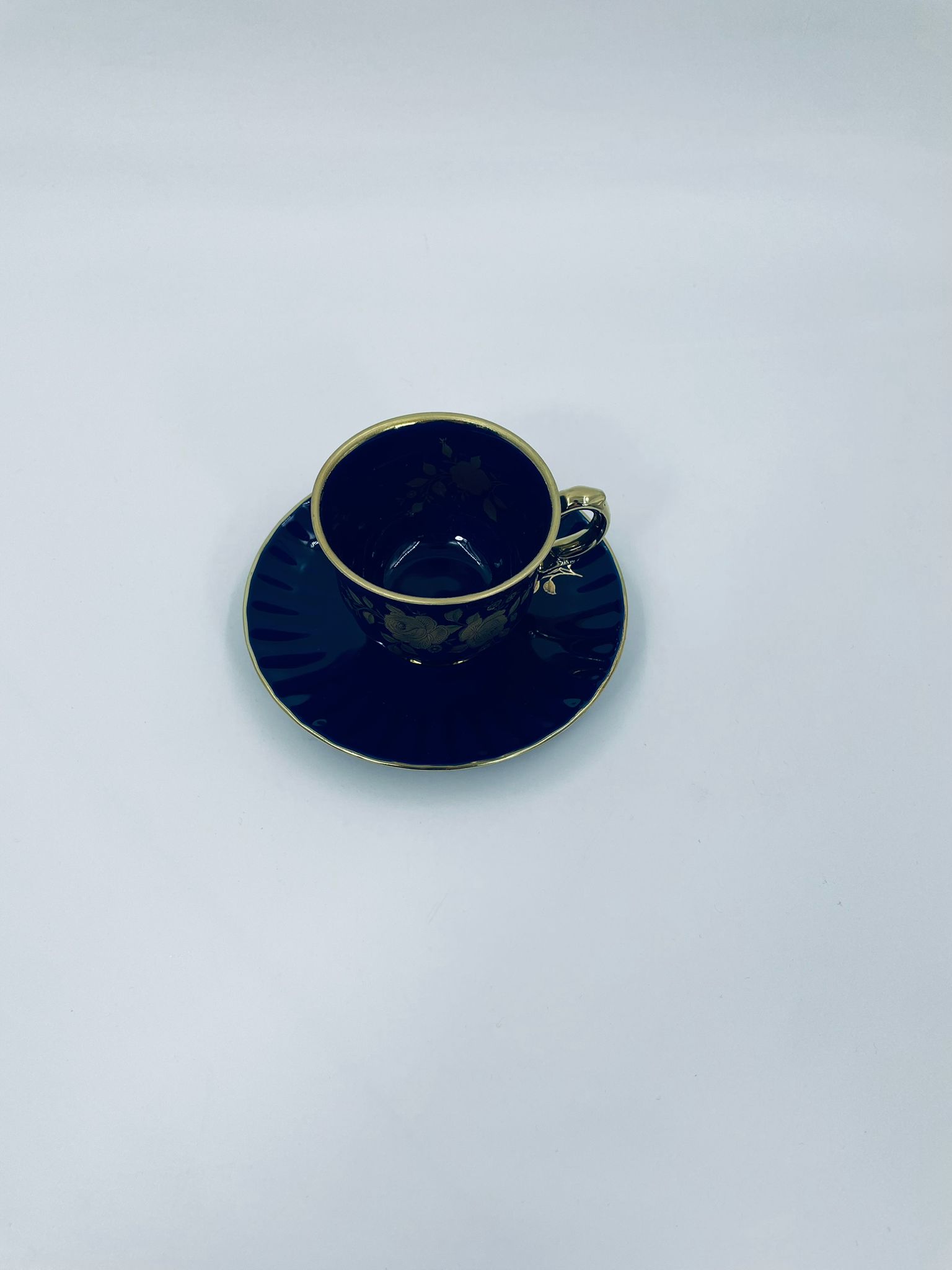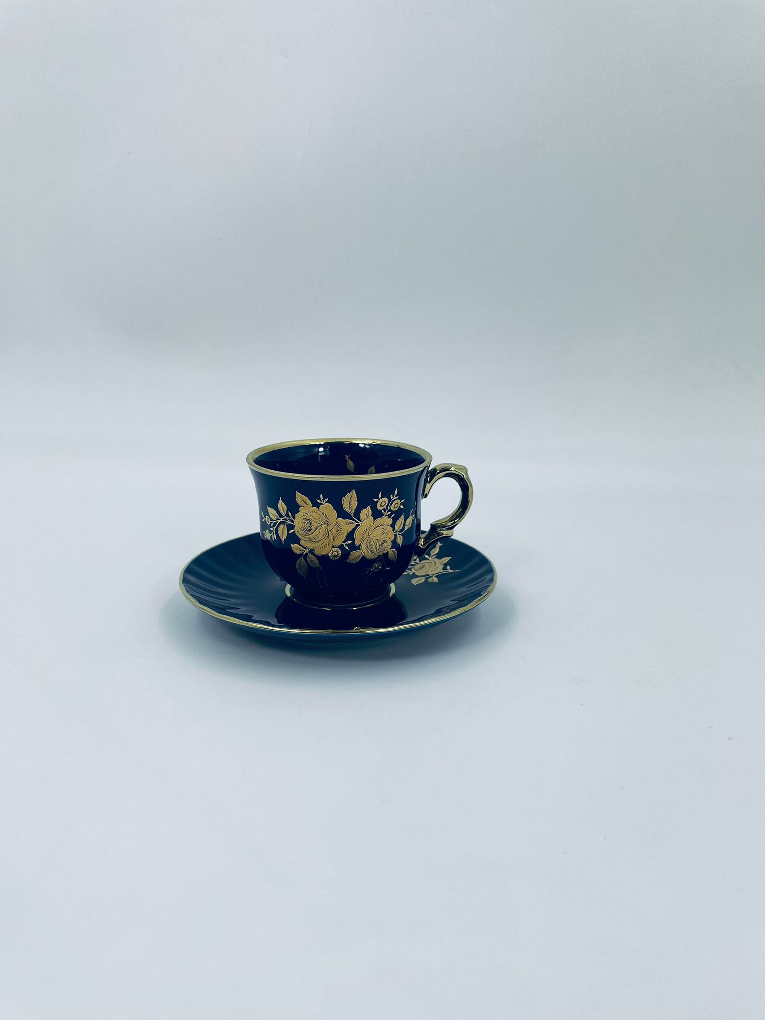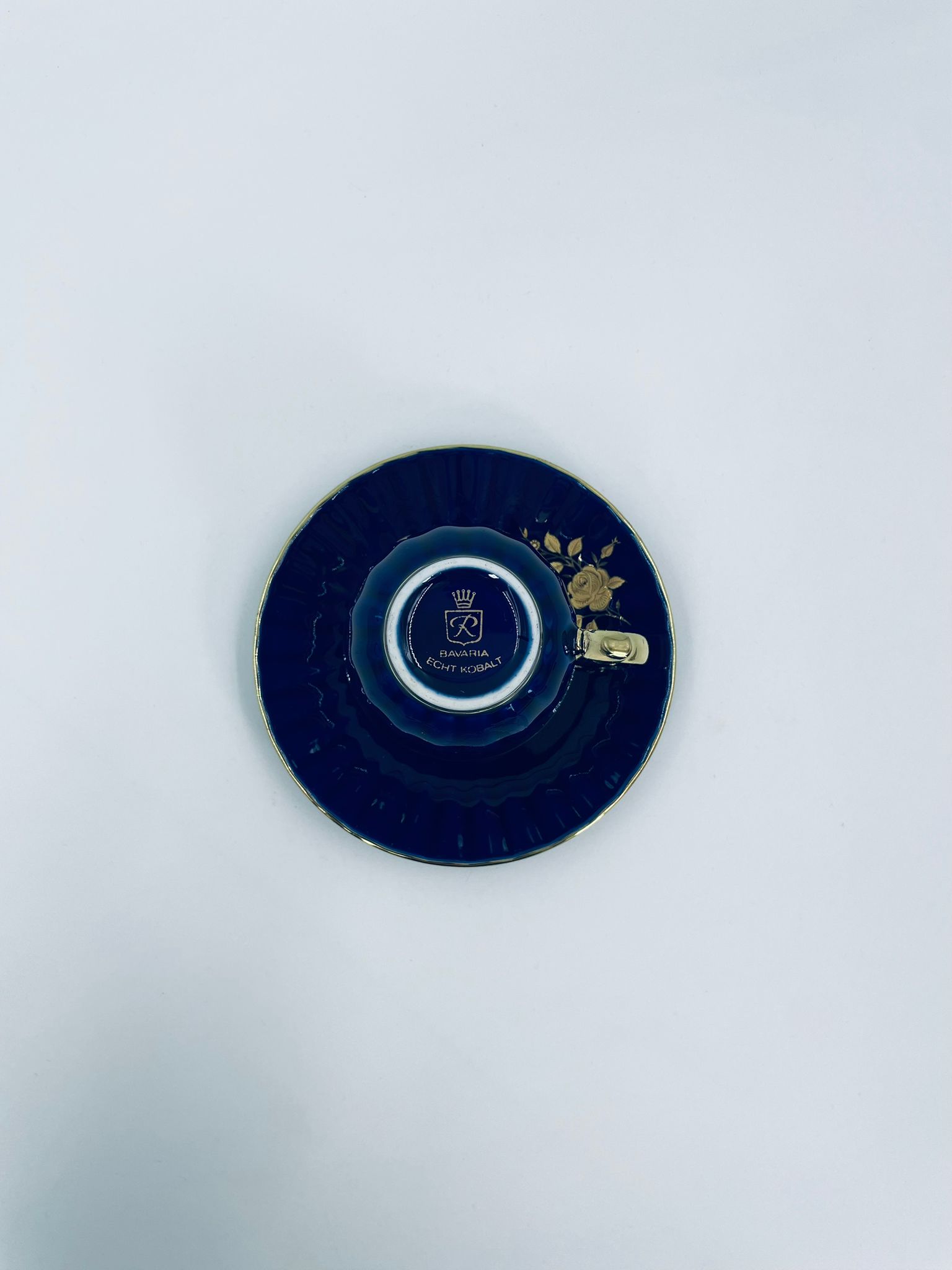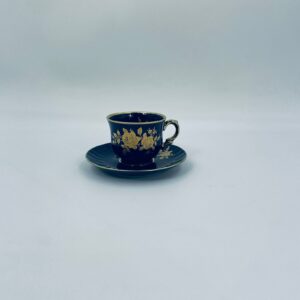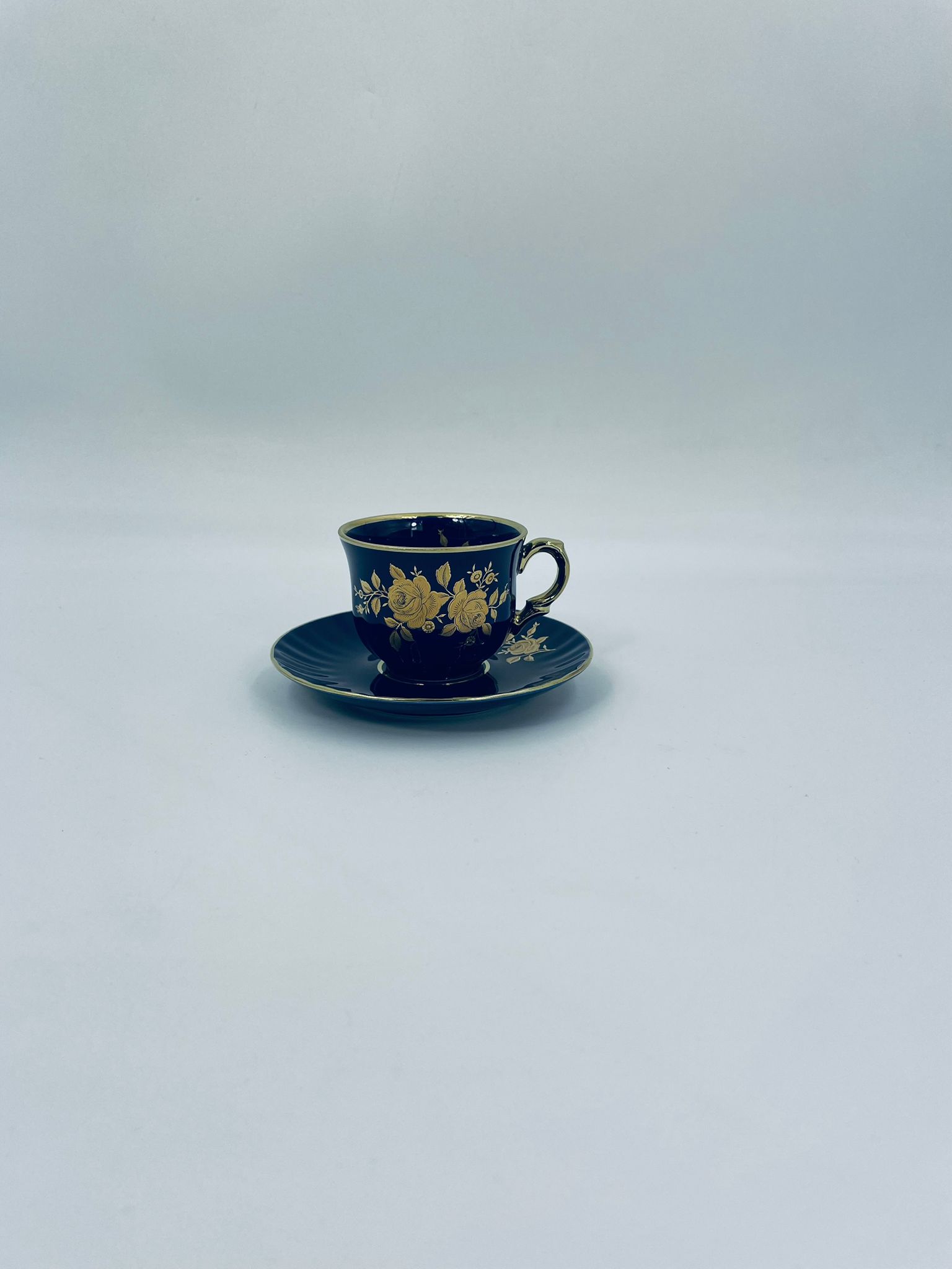 Filiżanka kolekcjonerska w zestawie duo marki Wunsiedel Bavaria Echt Kobalt, wykonana z wysokiej jakości porcelany. Zestaw charakteryzuje się ciemnym, kobaltowym kolorem z bogatymi, 24 karatowym złotym zdobieniami w postaci Róż, wykończony złoceniem na rantach.