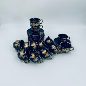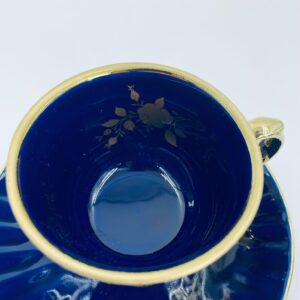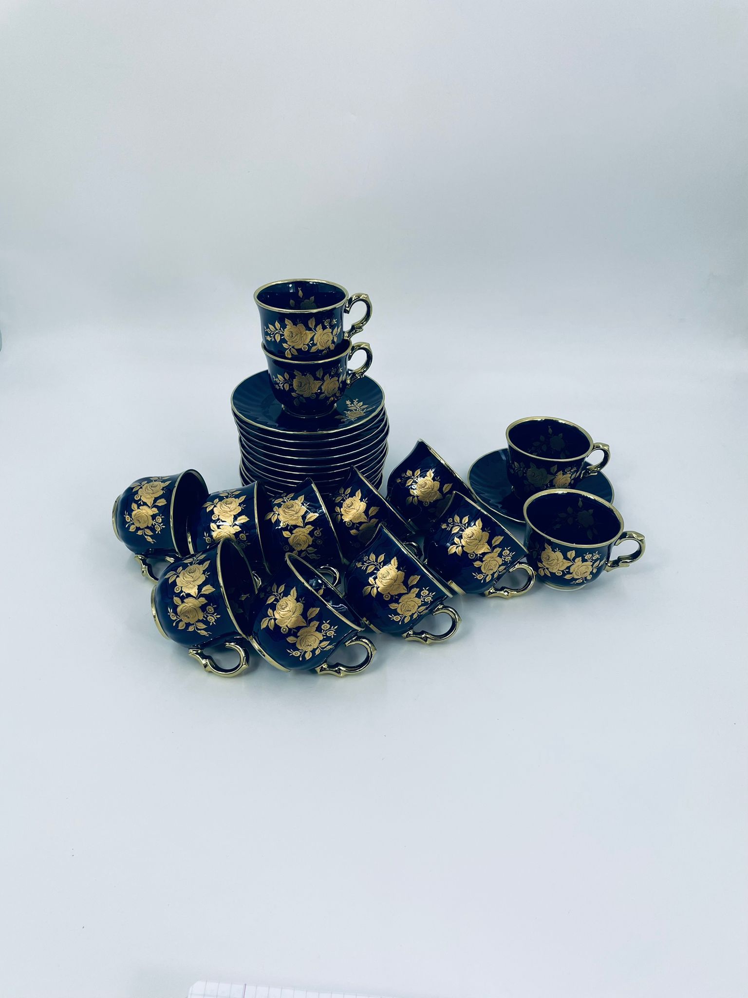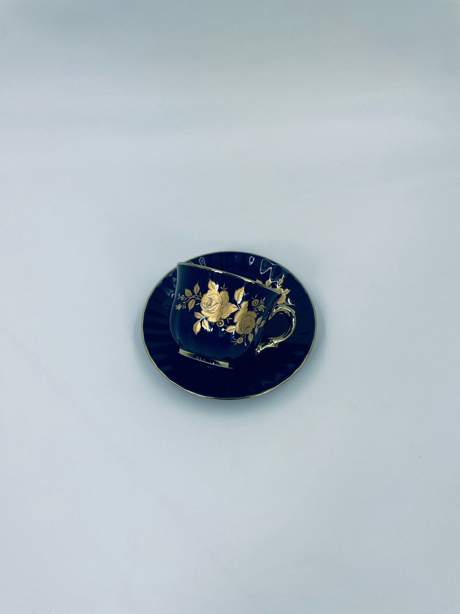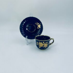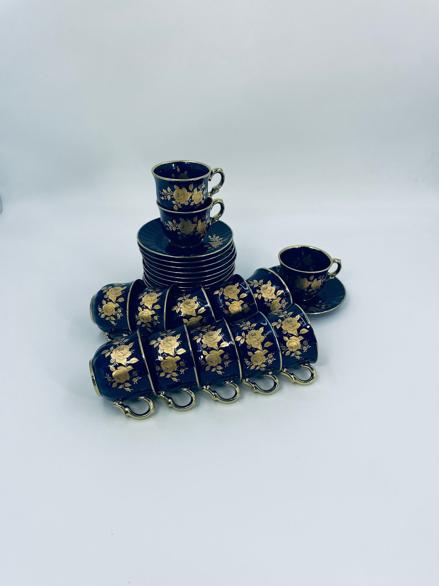 Filiżanka kolekcjonerska w zestawie duo marki Wunsiedel Bavaria Echt Kobalt, wykonana z wysokiej jakości porcelany. Zestaw charakteryzuje się ciemnym, kobaltowym kolorem z bogatymi, 24 karatowym złotym zdobieniami w postaci Róż, wykończony złoceniem na rantach.