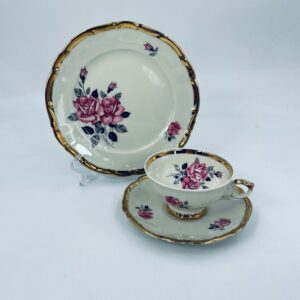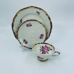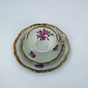 Filiżanka w zestawie trio wytwórni Bareuther Waldsassen Bavaria. Wysokiej jakości porcelana w kolorze ecru z delikatnym kwiatowym wzorem różowych róż na gałązkach w kolorze czerni i szarości. Zestaw wykończony złoceniami na rantach. Delikatne przetarcia na złoceniach.