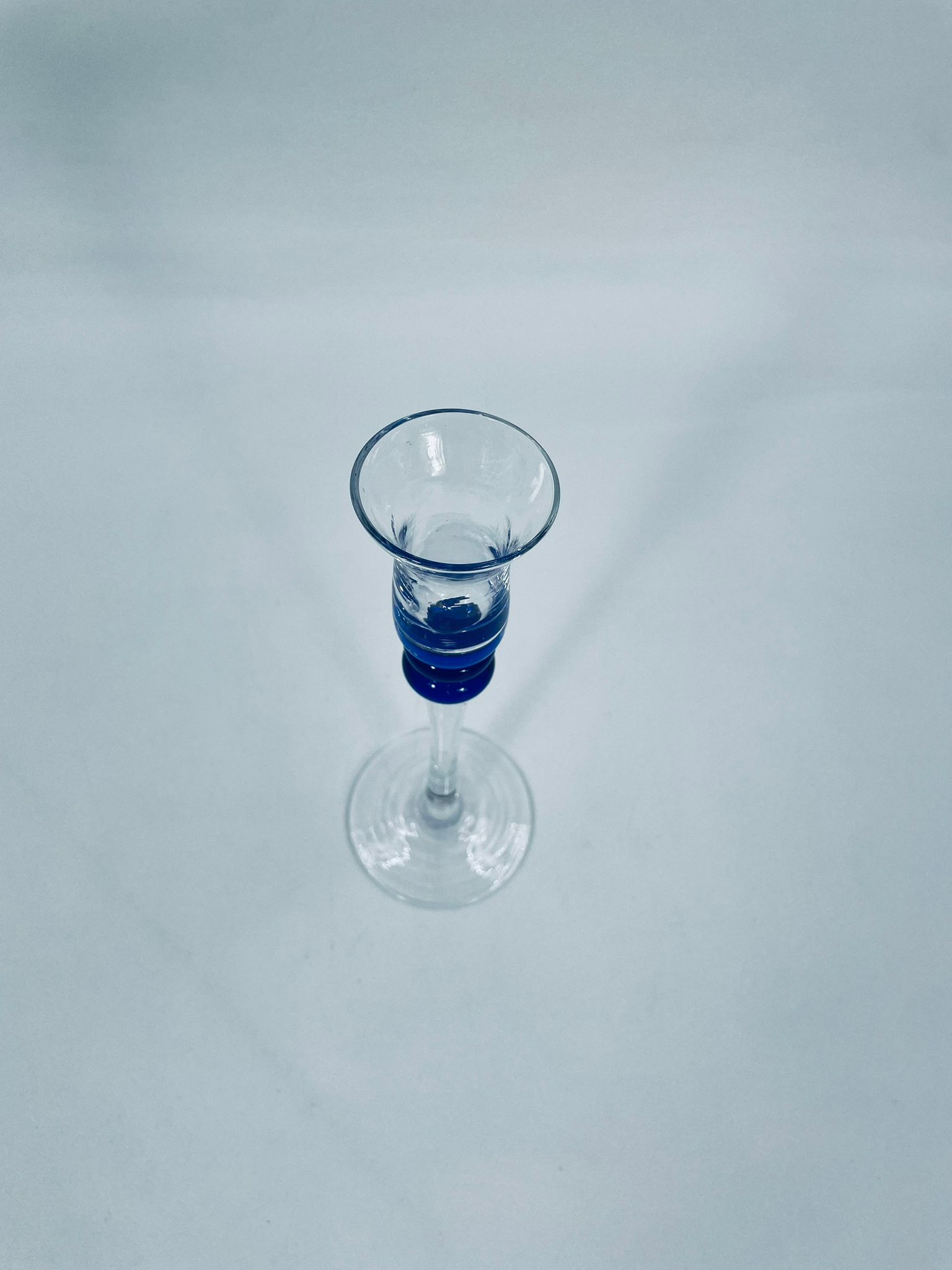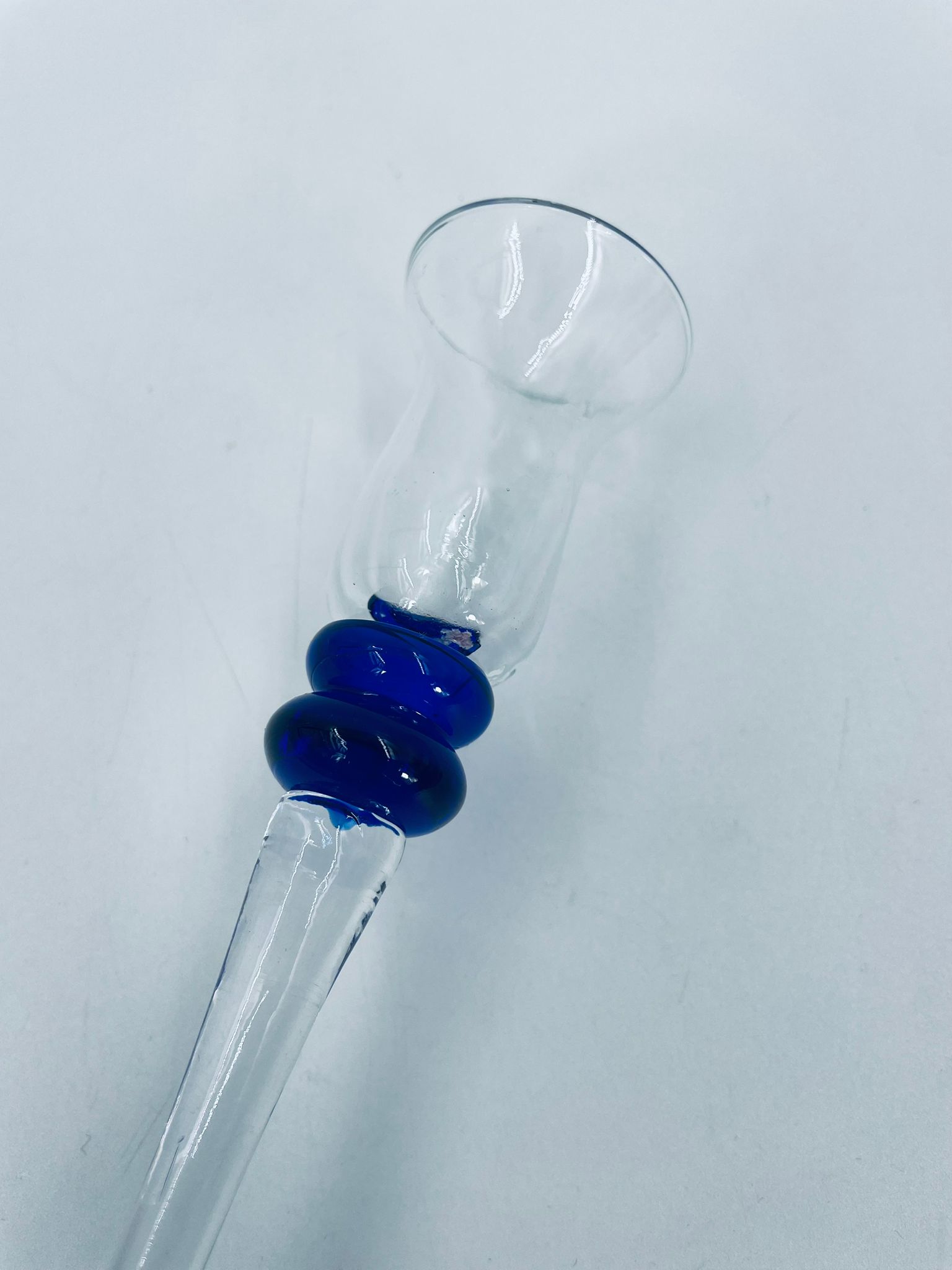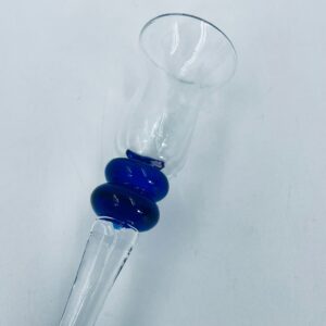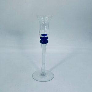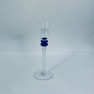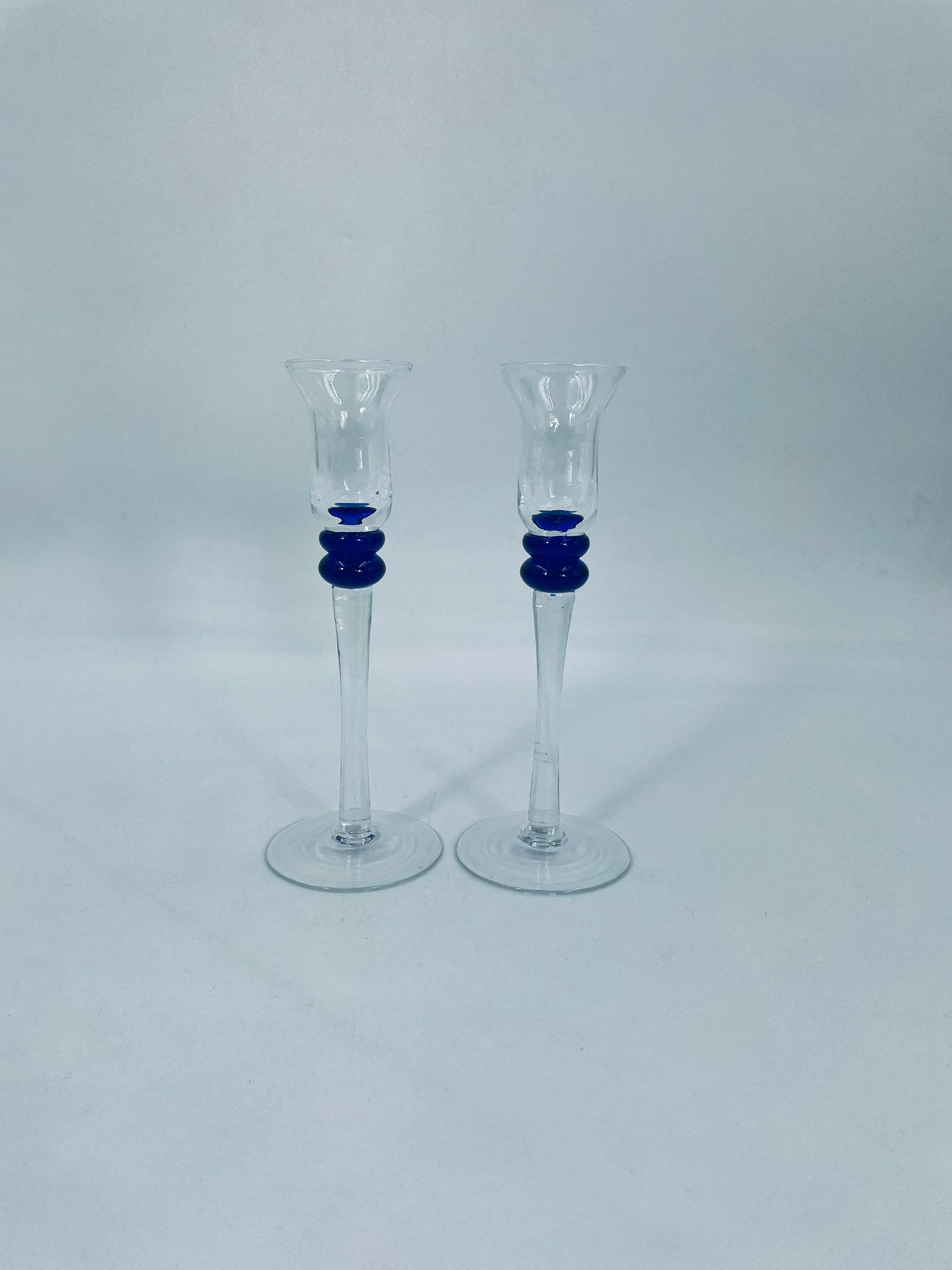 Zestaw świeczników w stylu Vintage Memphis Milano, wykonanych z wysokiej jakości artystycznego szkła. Świeczniki charakteryzują się smukłą, wydłużoną nóżką, z dekoracyjnymi kobaltowymi elementami w górnej części, tuż pod kielichem.