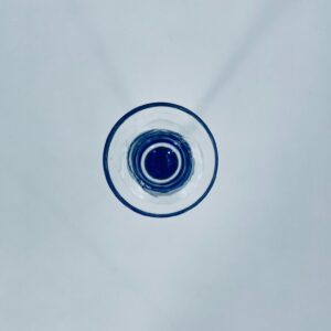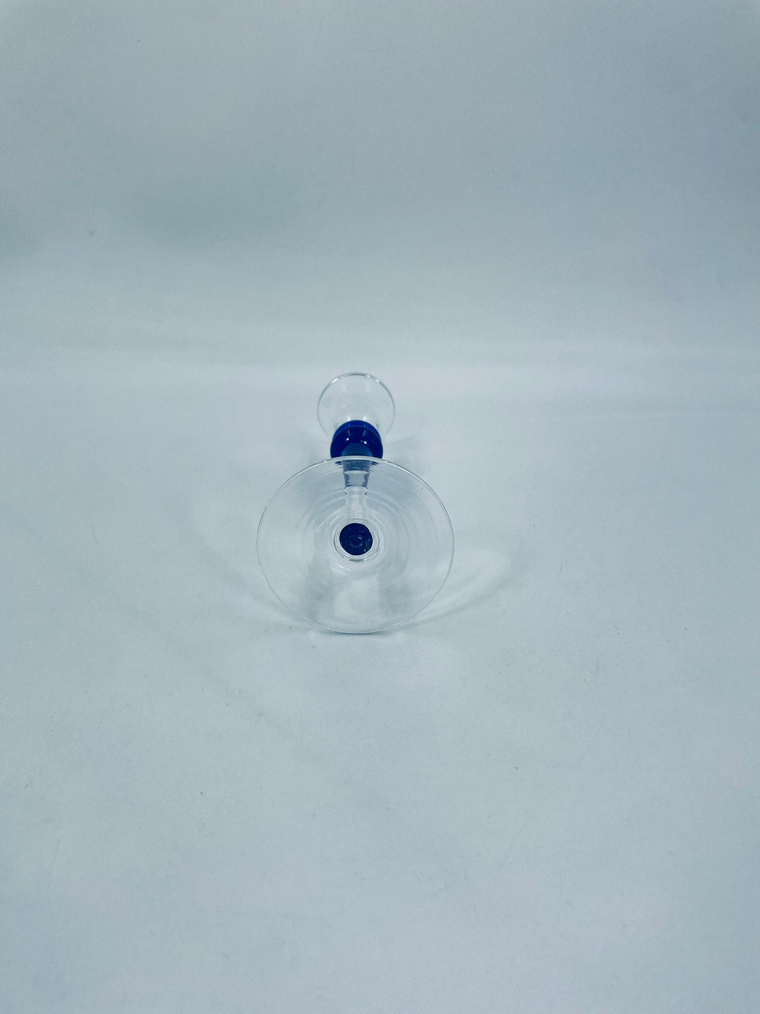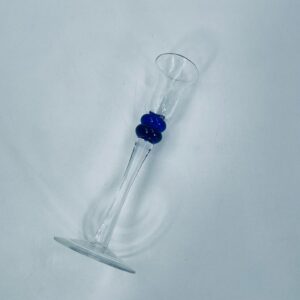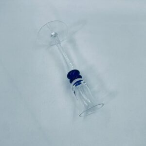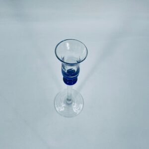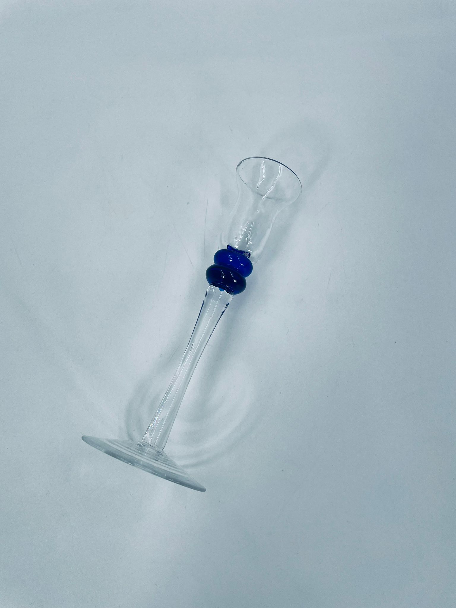 Zestaw świeczników w stylu Vintage Memphis Milano, wykonanych z wysokiej jakości artystycznego szkła. Świeczniki charakteryzują się smukłą, wydłużoną nóżką, z dekoracyjnymi kobaltowymi elementami w górnej części, tuż pod kielichem.