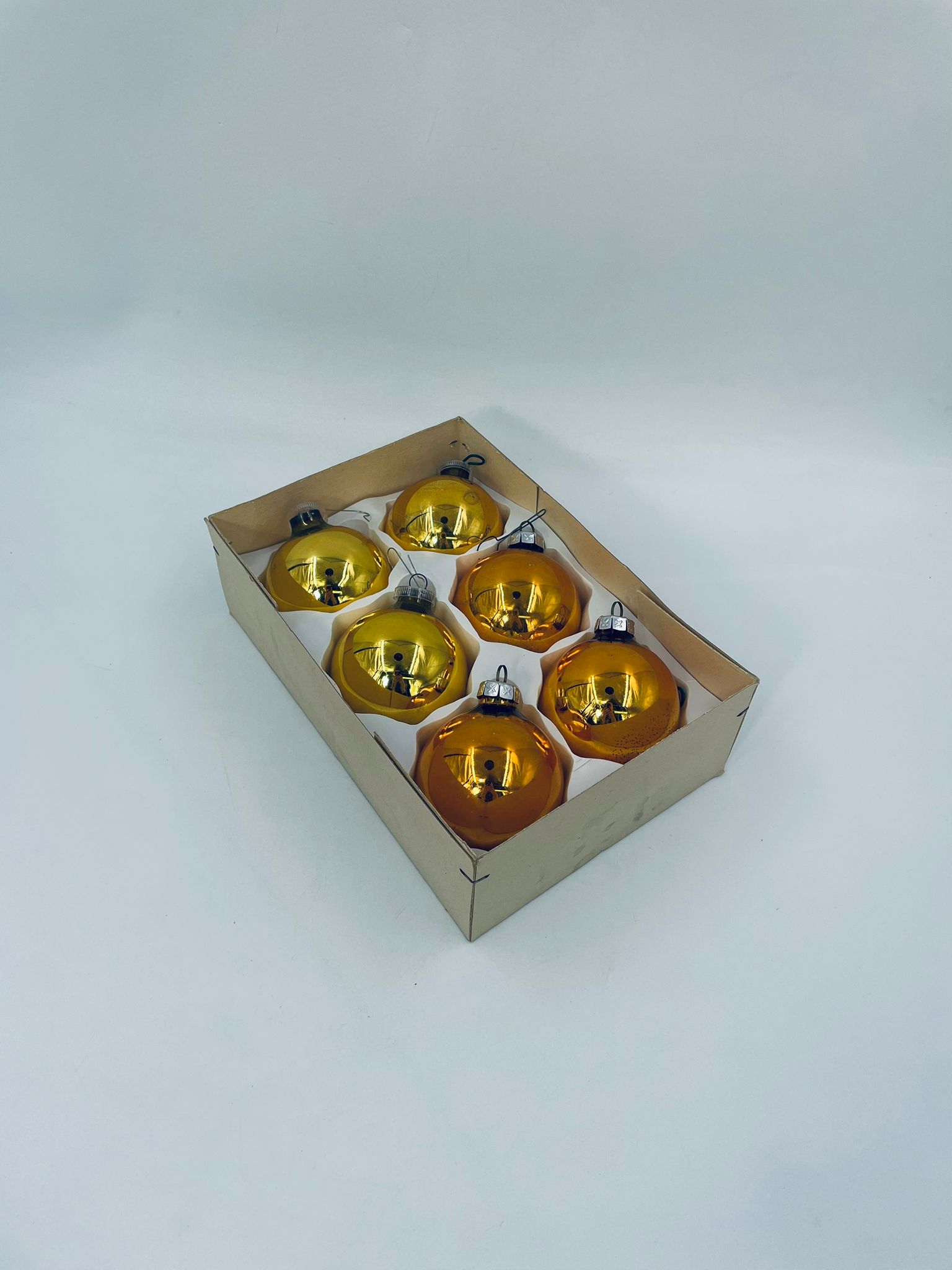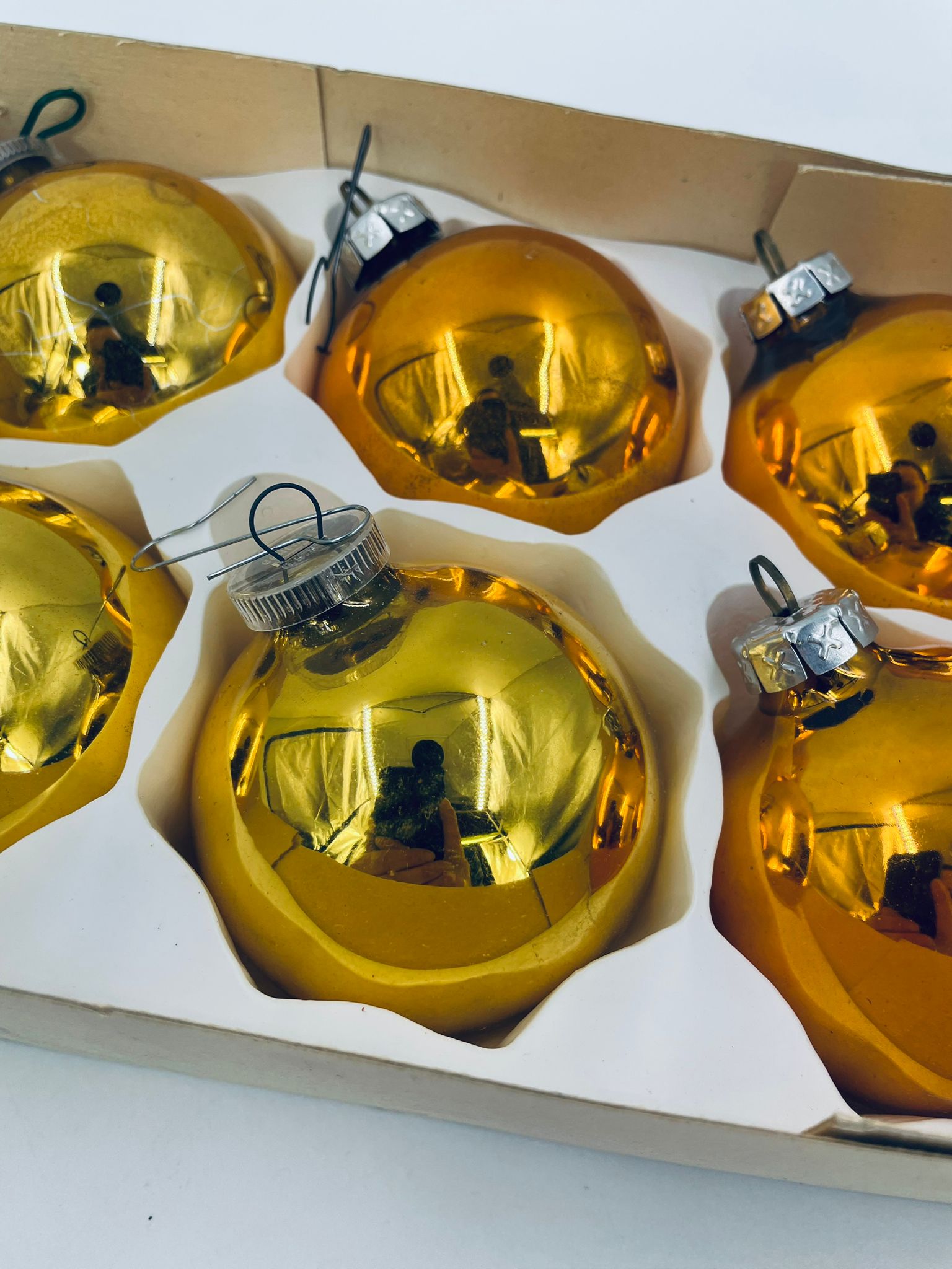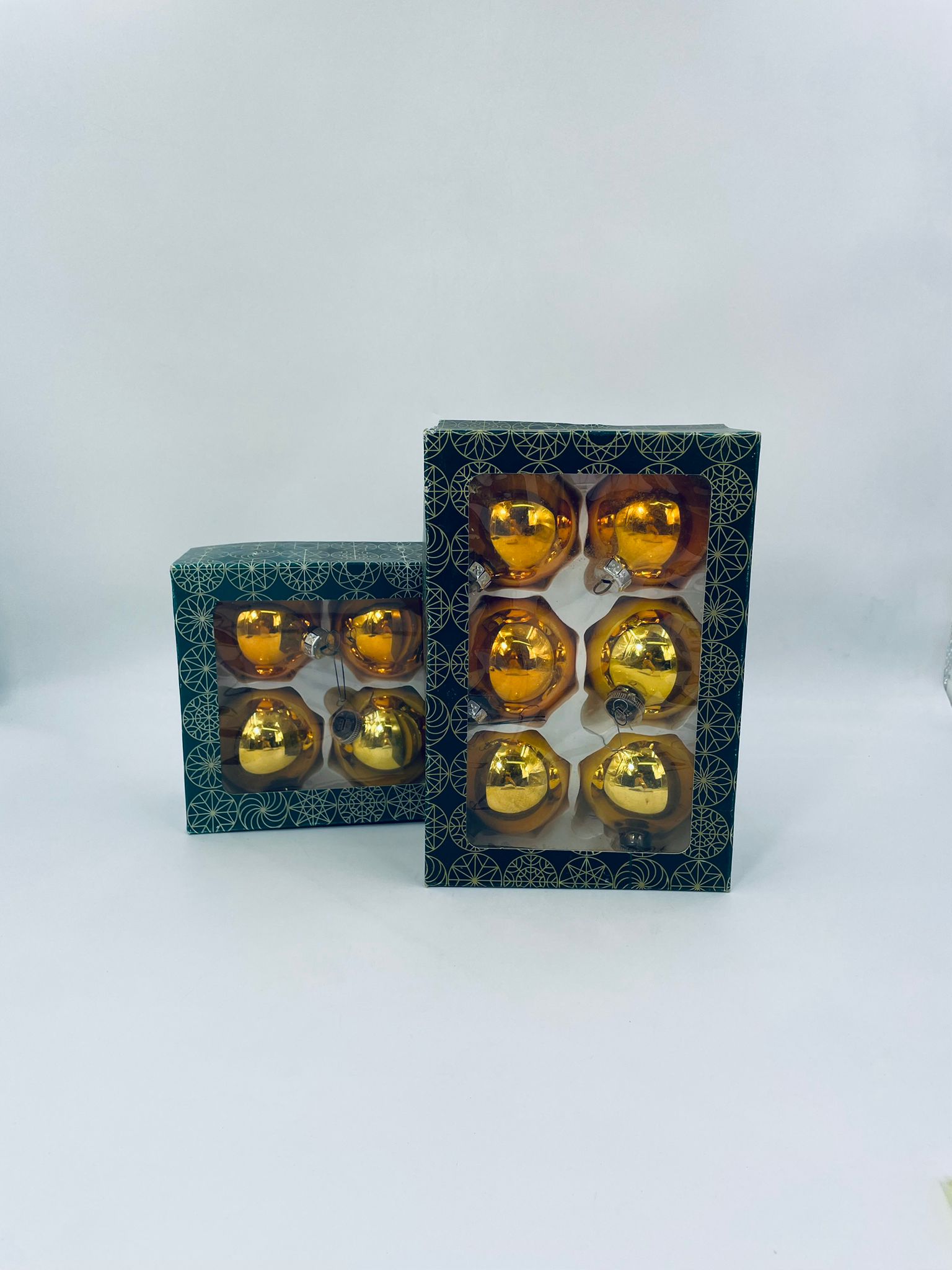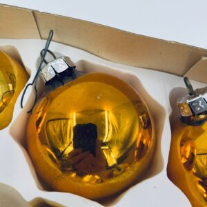 Zestaw zabytkowych bombek na choinkę w stylu Vintage, wykonanych z ręcznie dmuchanego szkła. Bombki barwione na kolor złoty, błyszczący. Drobne zarysowania.