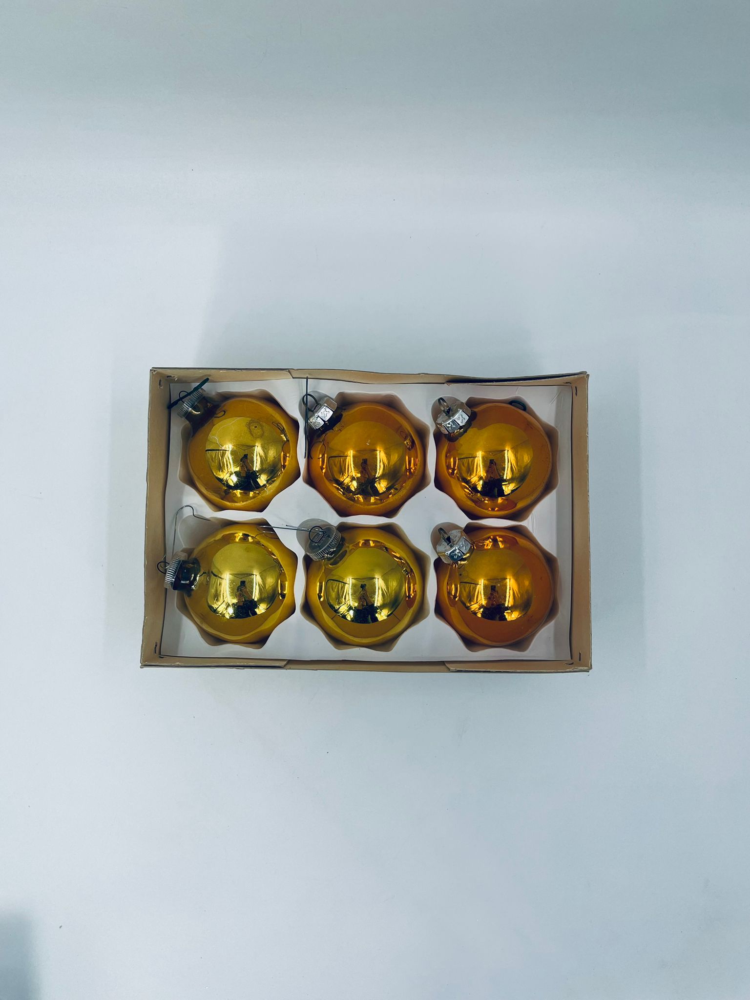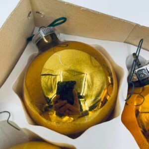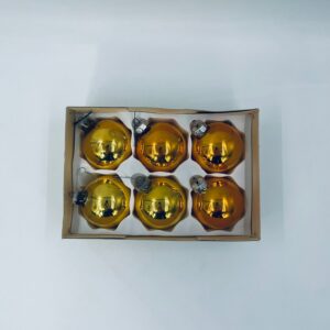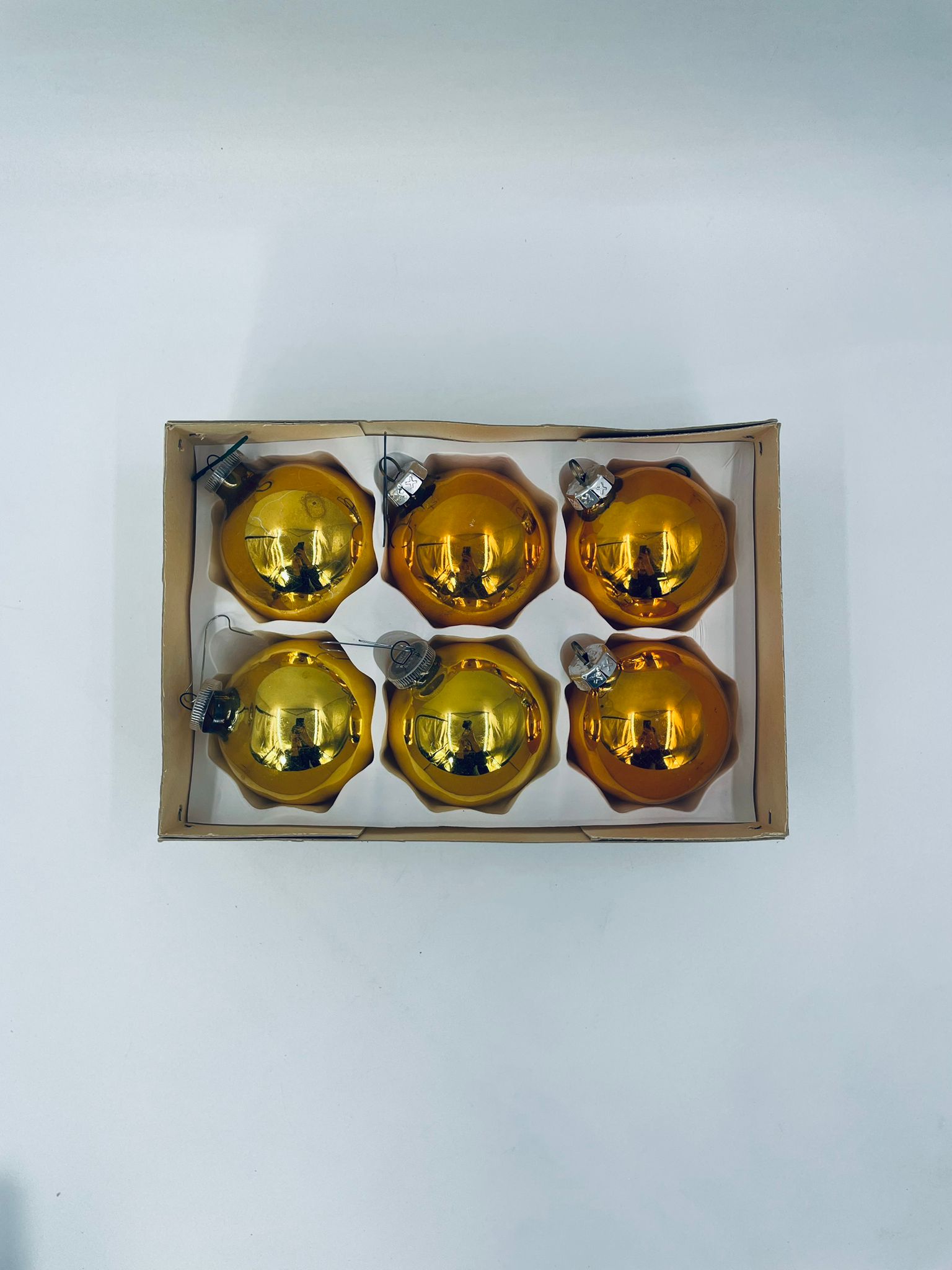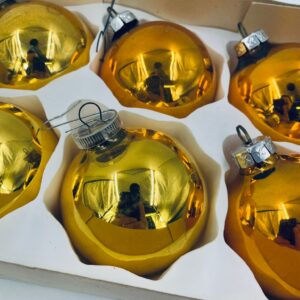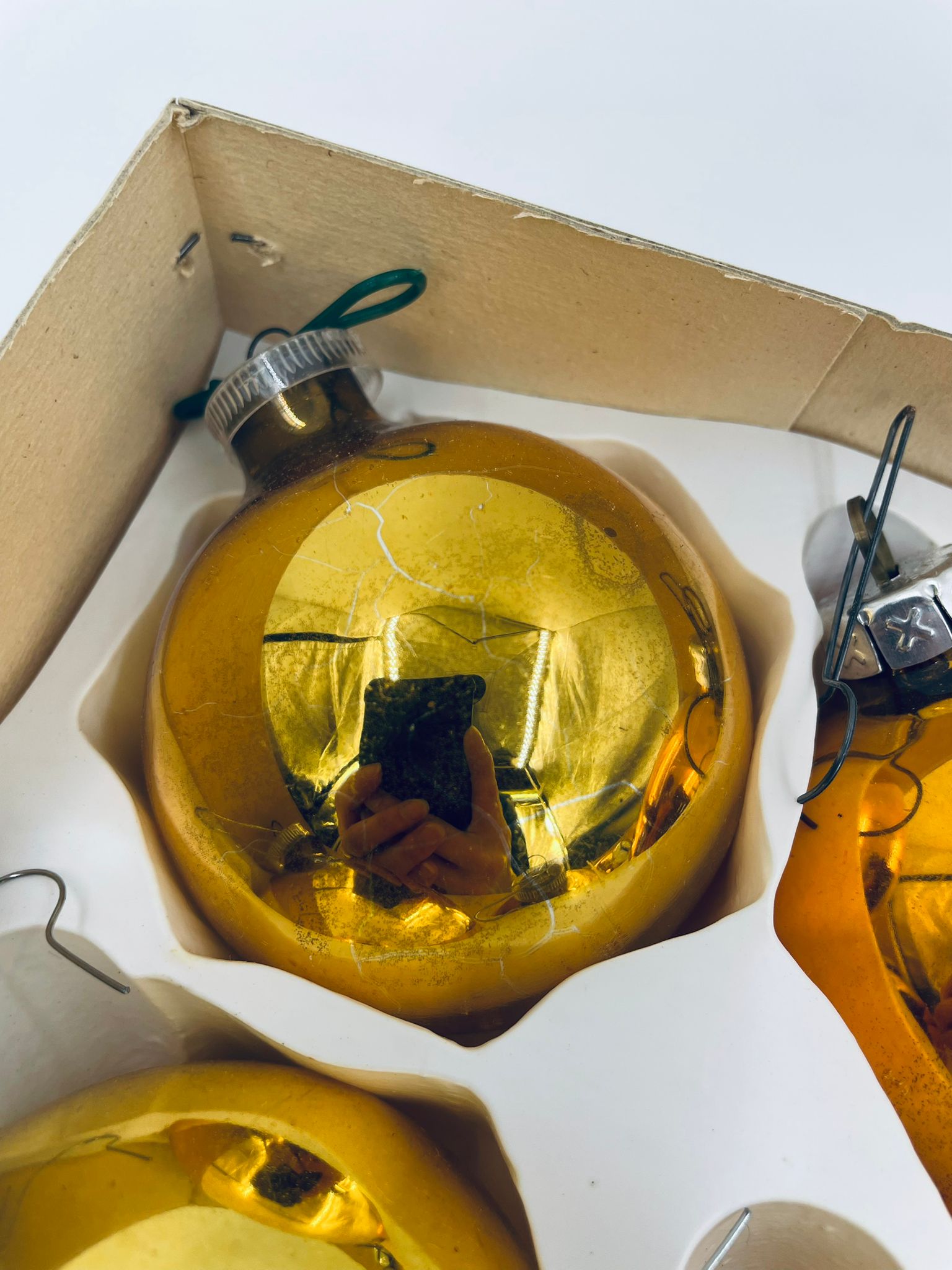 Zestaw zabytkowych bombek na choinkę w stylu Vintage, wykonanych z ręcznie dmuchanego szkła. Bombki barwione na kolor złoty, błyszczący. Drobne zarysowania.