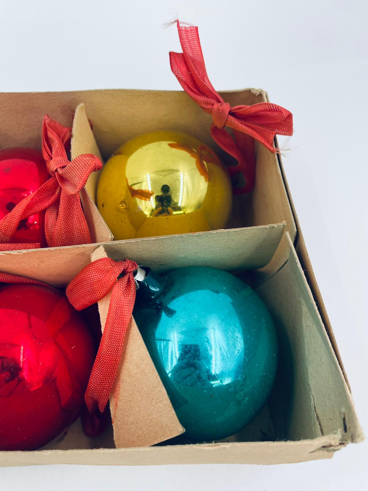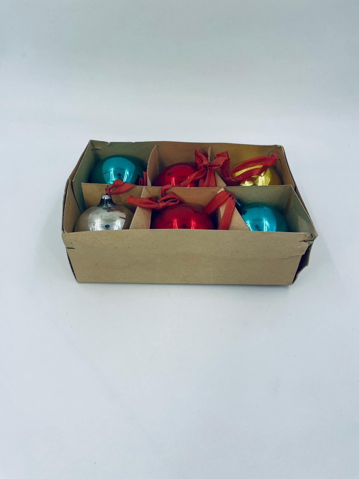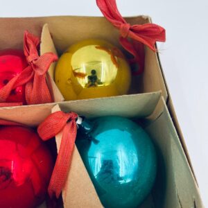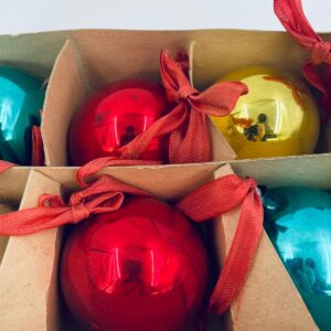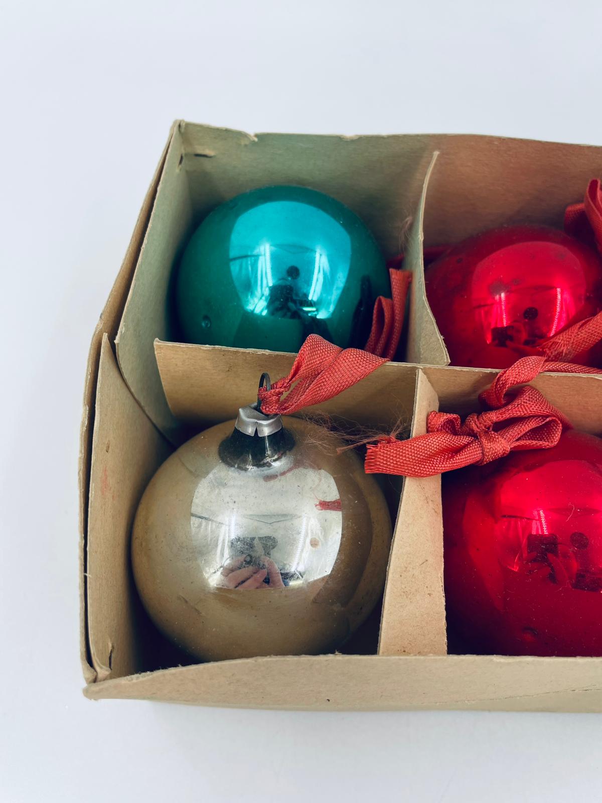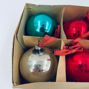 Zestaw zabytkowych bombek na choinkę w stylu Vintage, wykonanych z ręcznie dmuchanego szkła. Bombki ręcznie malowane w kolorze srebrnym, złotym, zielonym i czerwonym. Posiada drobne zarysowania.