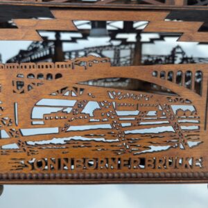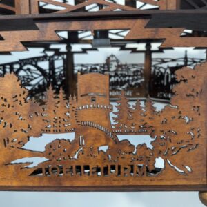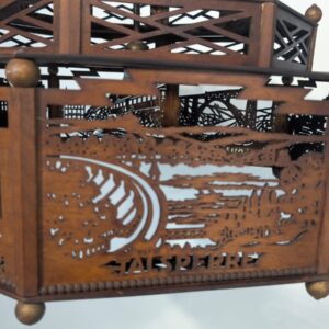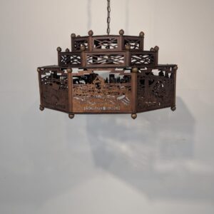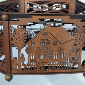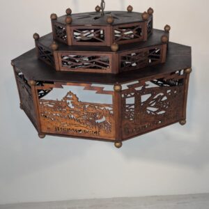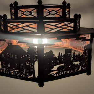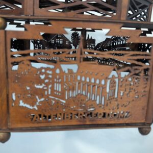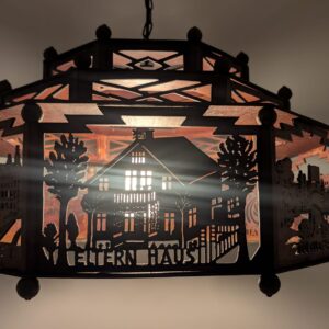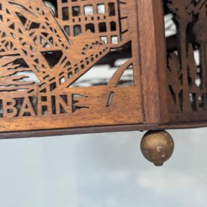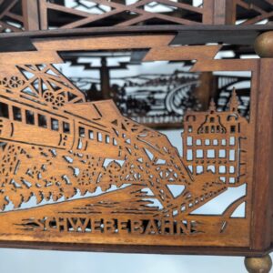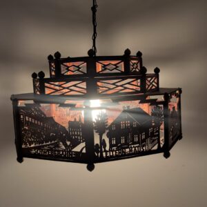 Unikatowa, ręcznie wykonana lampa wisząca w stylu retro z lat 30./40. Wykonana z drewna, z ażurowym, intrygującym wzorem przedstawiającym architekturę miasta Wuppertal. Lampa ma niepowtarzalny, zabytkowy charakter i stanowi ciekawy element wystroju wnętrza.