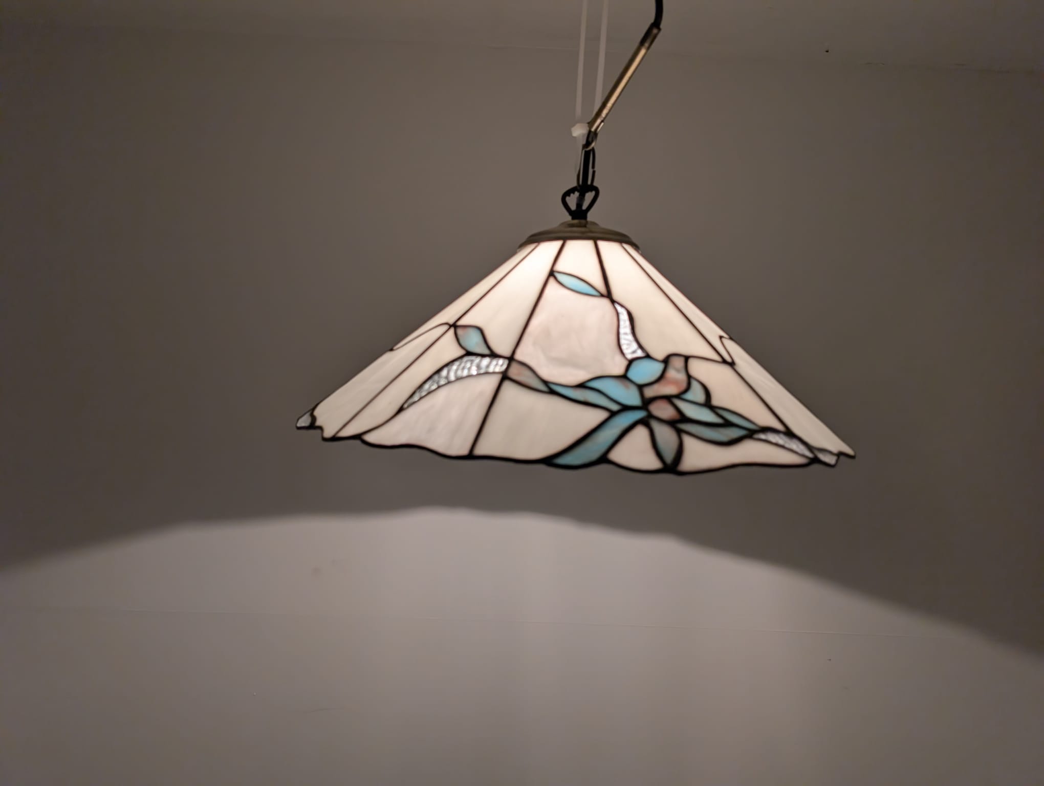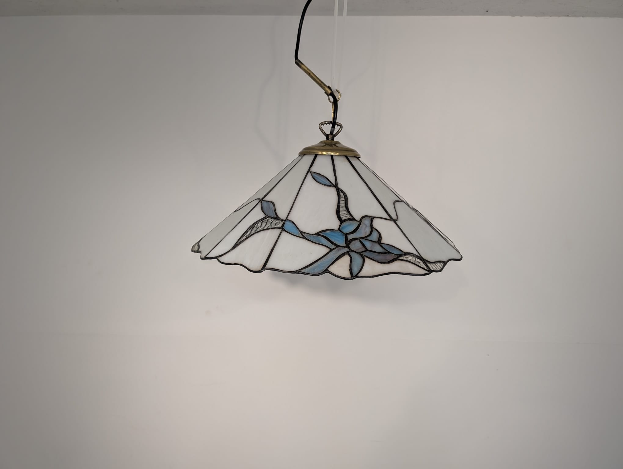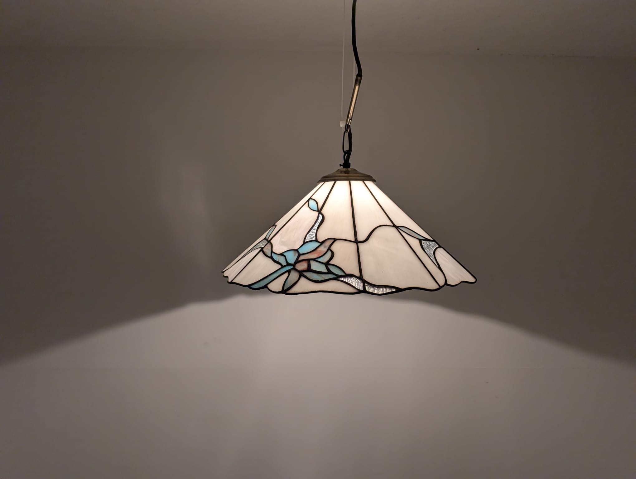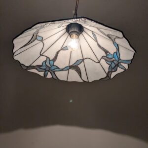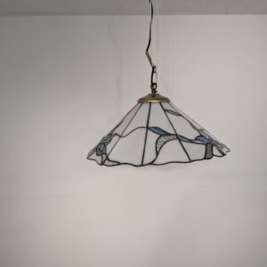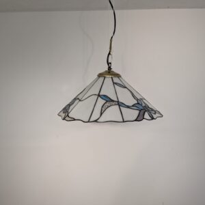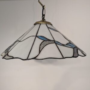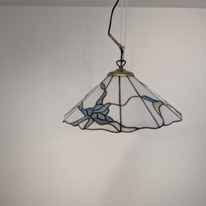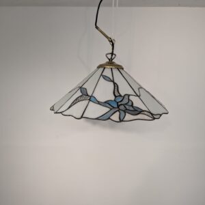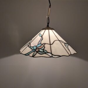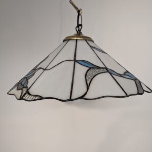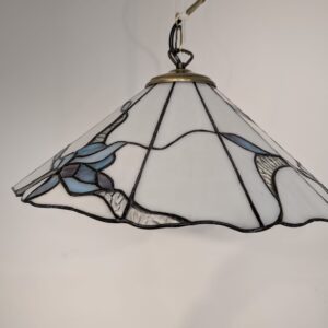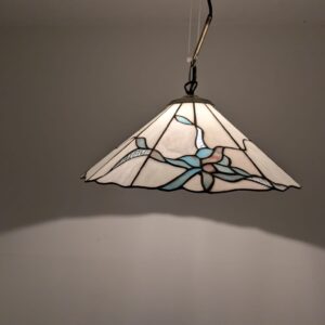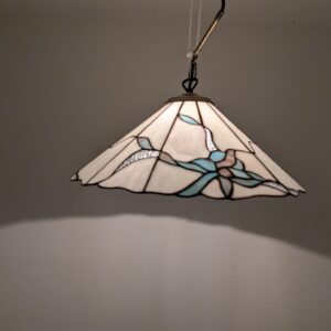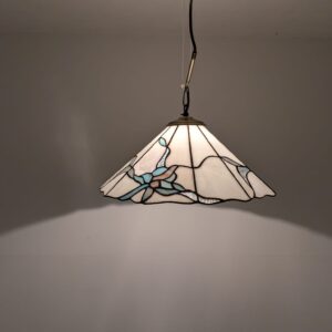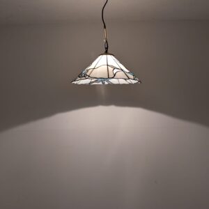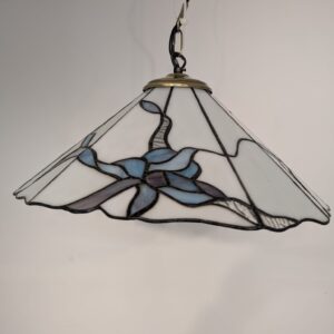 Stylowa lampa wisząca w stylu Tiffany’ego. Abażur wykonany z kolorowego szkła z motywem kwiatowym, który nadaje niepowtarzalny charakter oświetleniu. Lampa będzie pięknym dodatkiem do wnętrza, idealnie sprawdzi się w salonie, sypialni lub jadalni.
