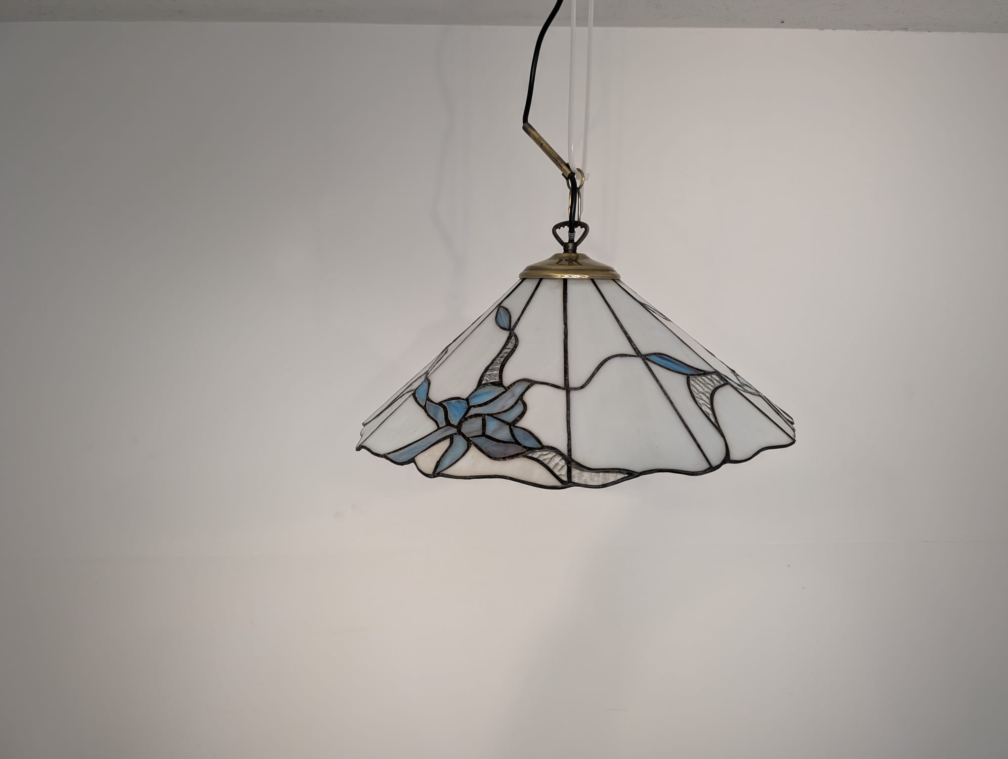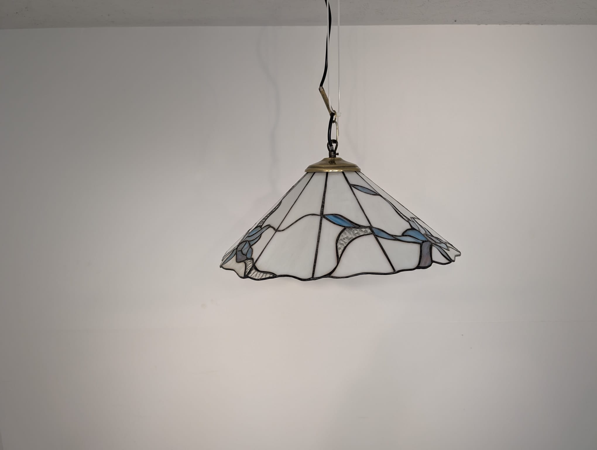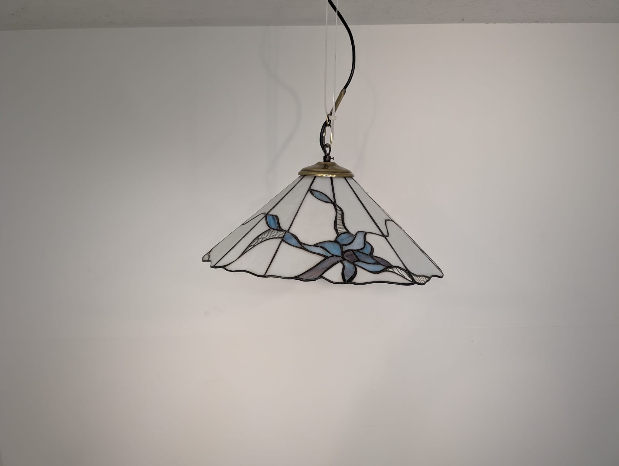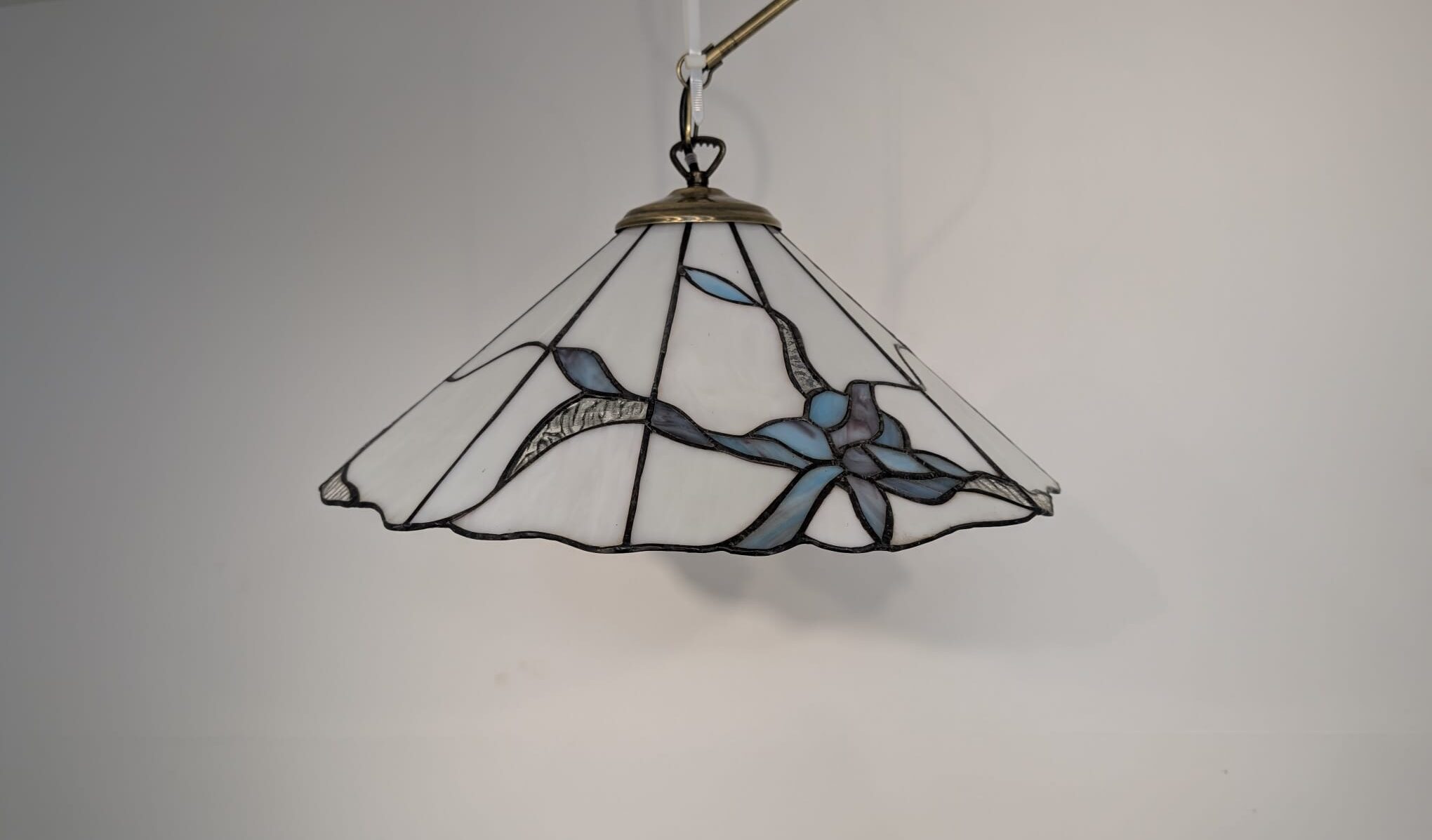 Stylowa lampa wisząca w stylu Tiffany’ego. Abażur wykonany z kolorowego szkła z motywem kwiatowym, który nadaje niepowtarzalny charakter oświetleniu. Lampa będzie pięknym dodatkiem do wnętrza, idealnie sprawdzi się w salonie, sypialni lub jadalni.