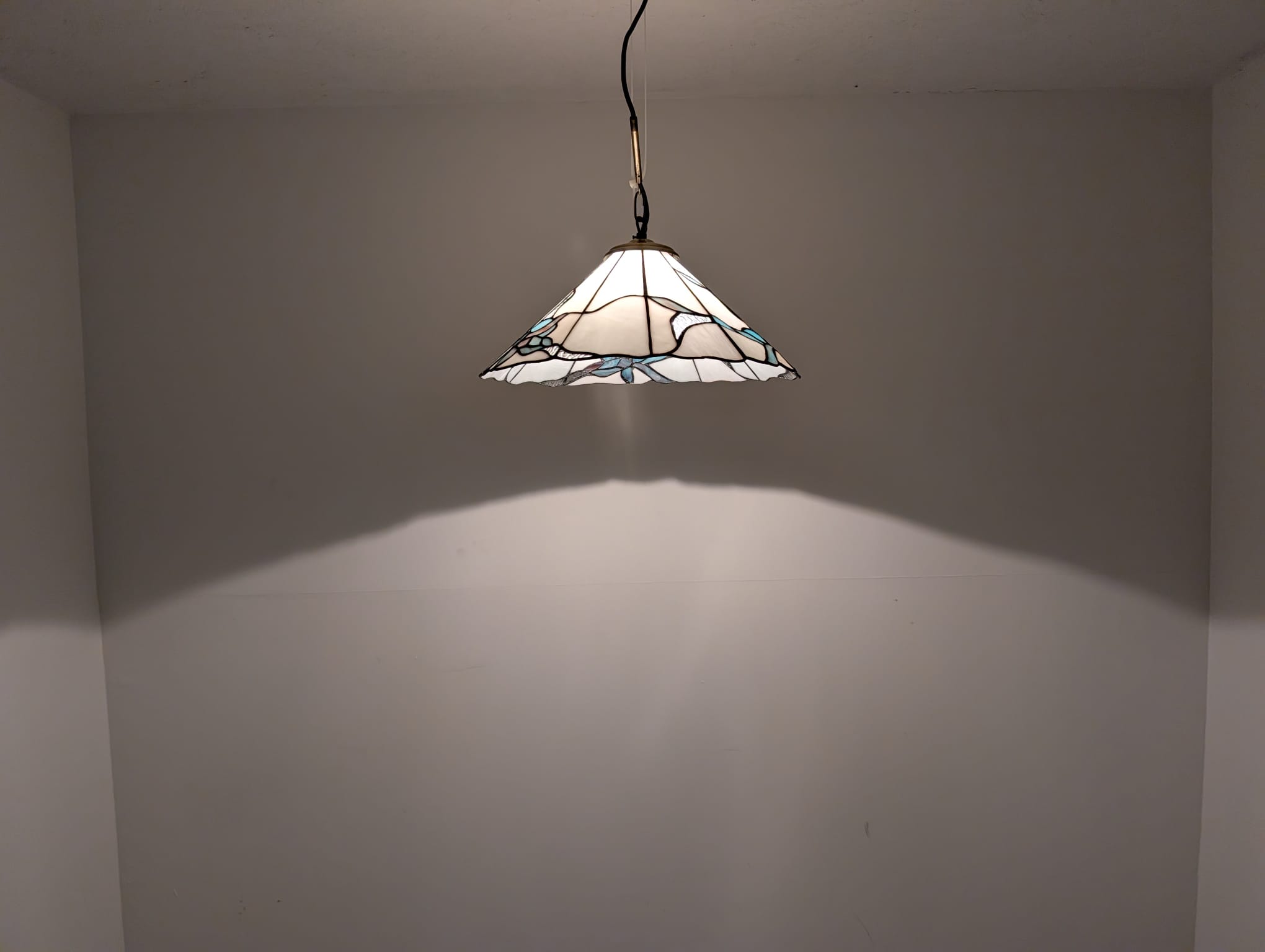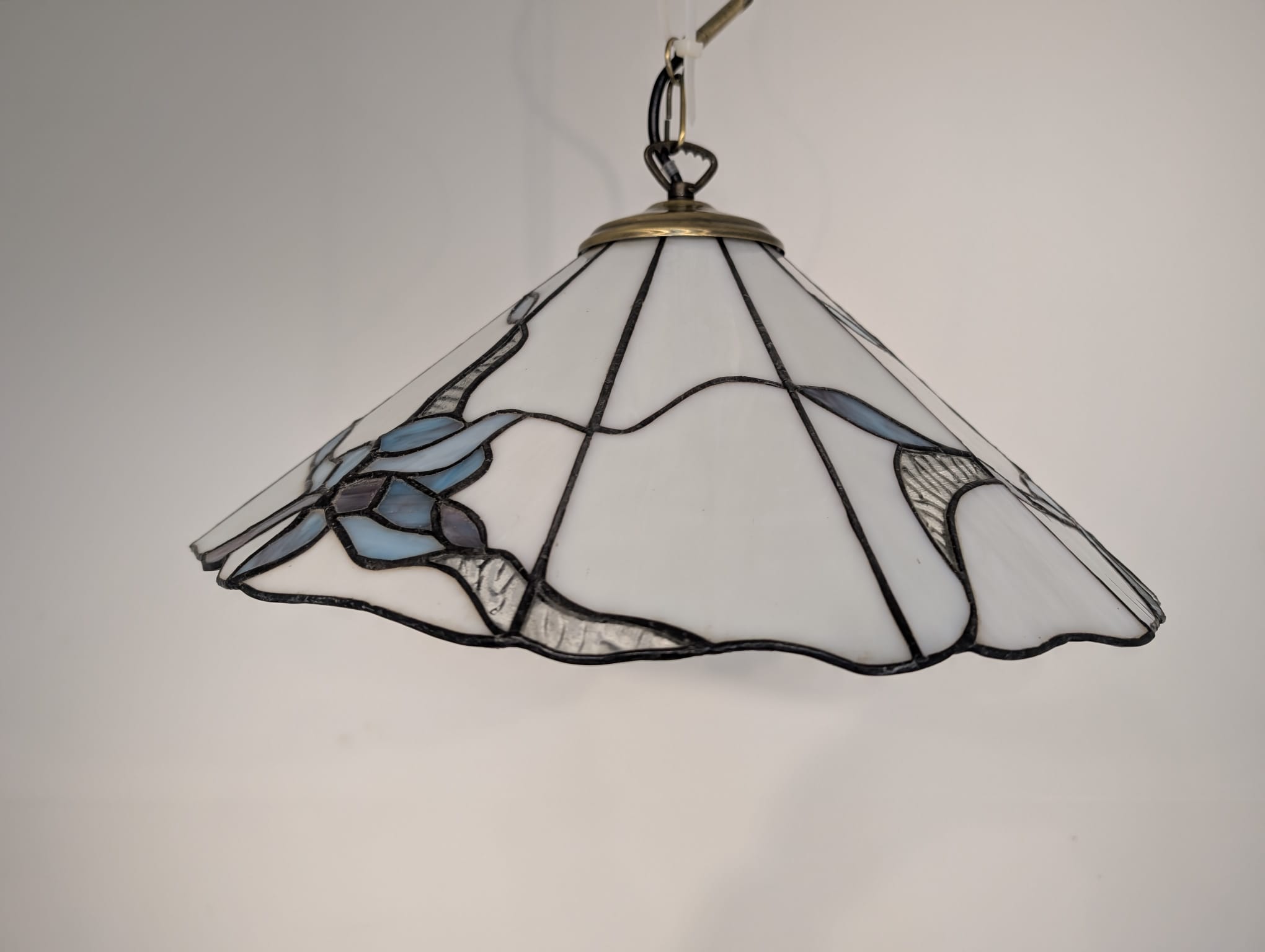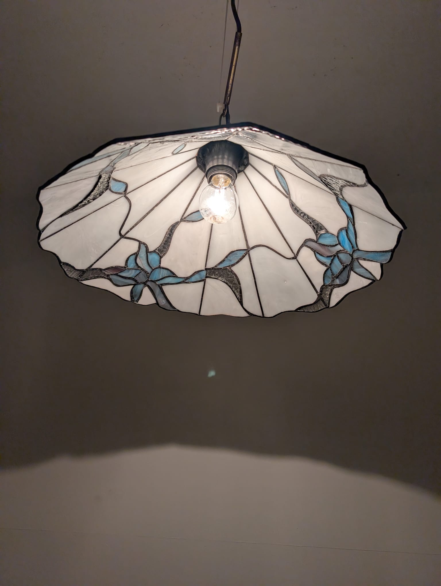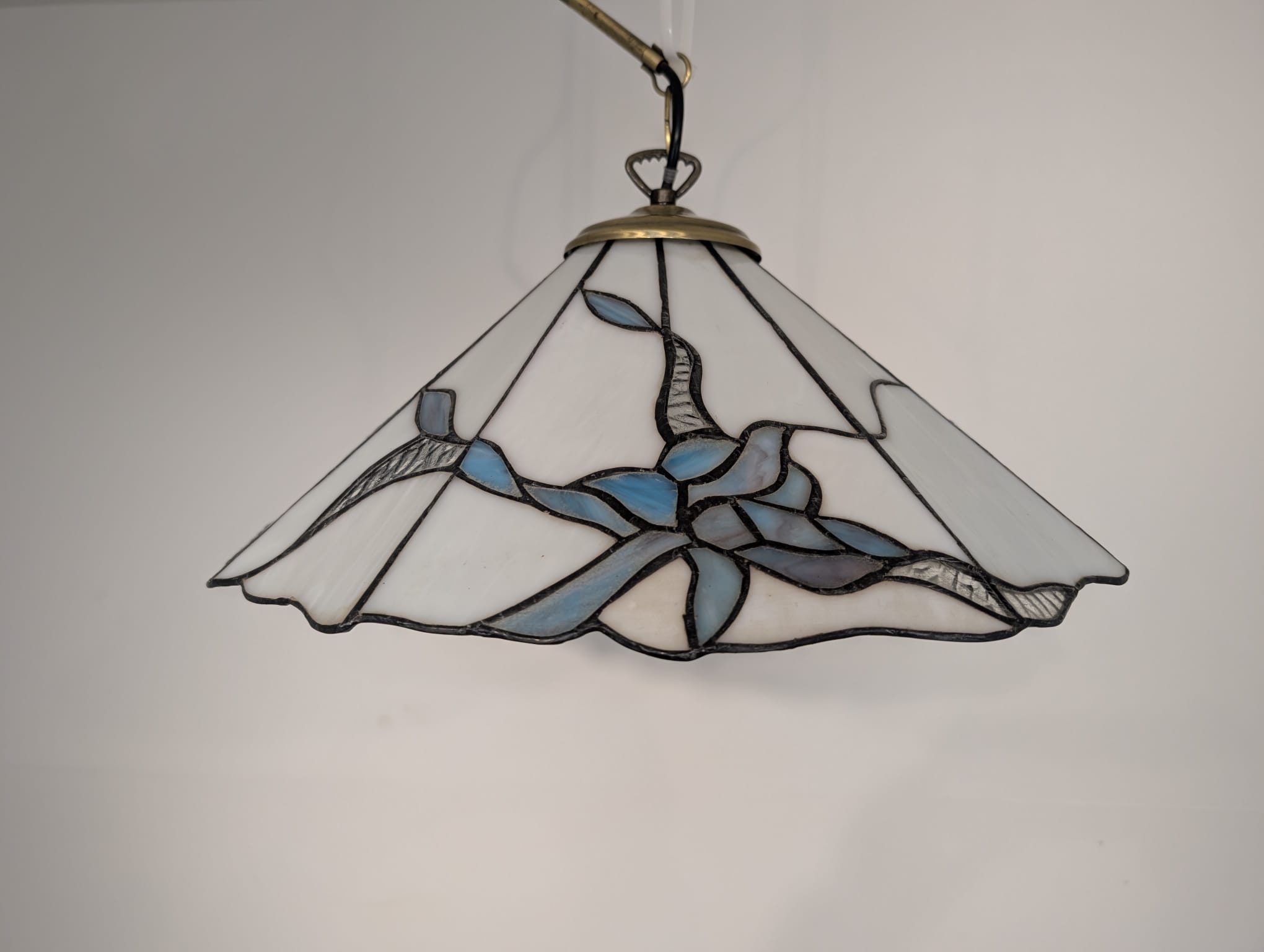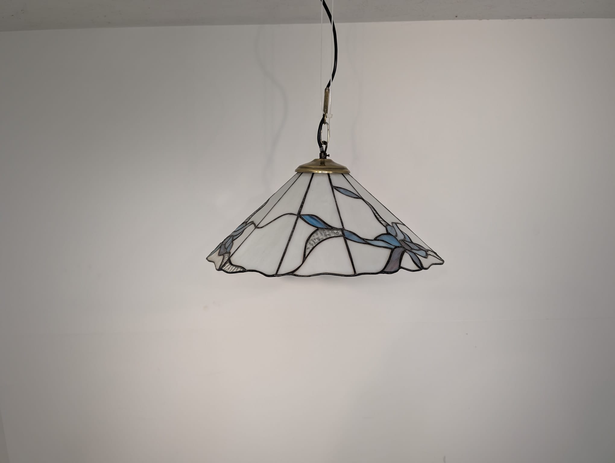 Stylowa lampa wisząca w stylu Tiffany’ego. Abażur wykonany z kolorowego szkła z motywem kwiatowym, który nadaje niepowtarzalny charakter oświetleniu. Lampa będzie pięknym dodatkiem do wnętrza, idealnie sprawdzi się w salonie, sypialni lub jadalni.
