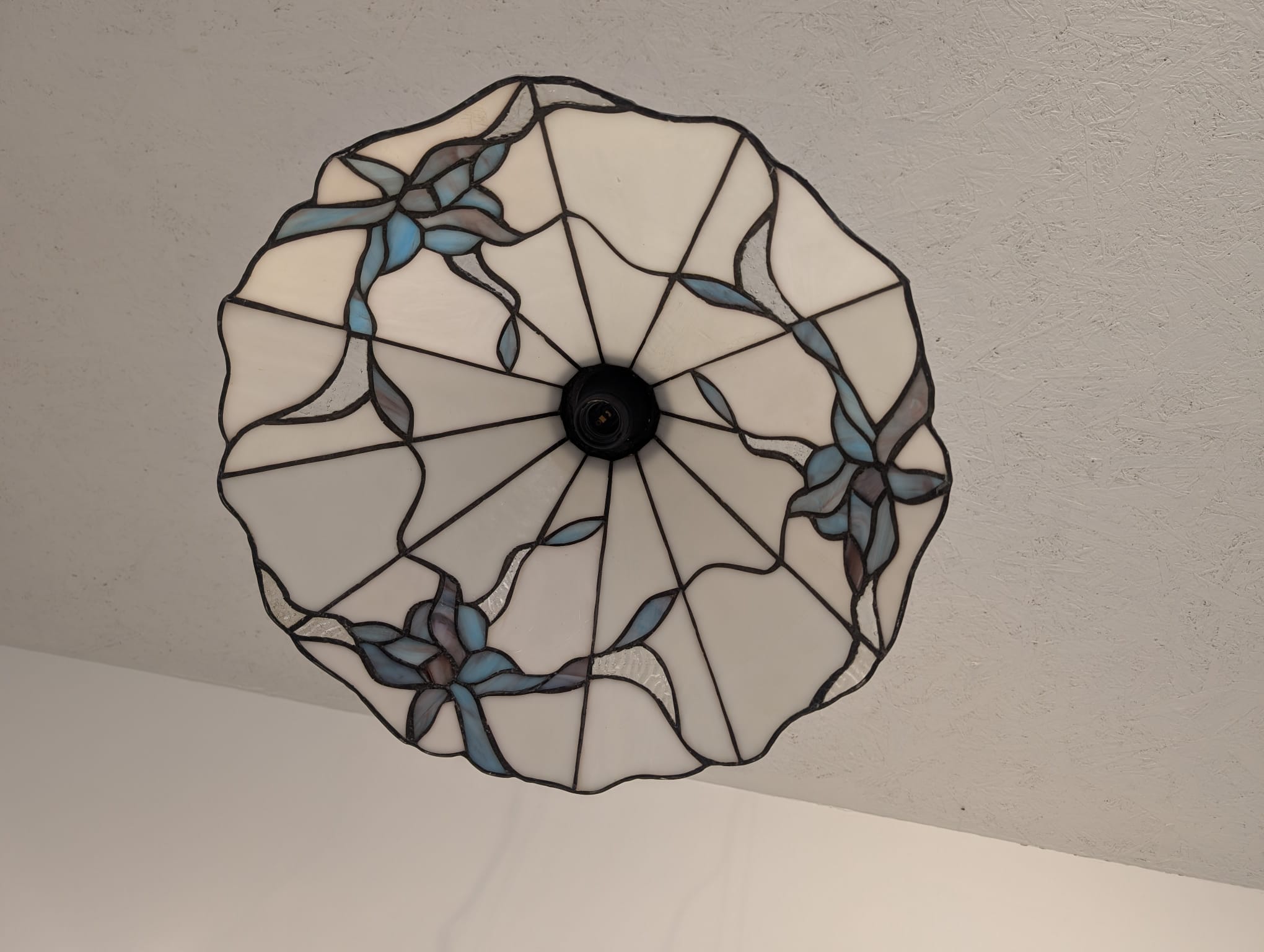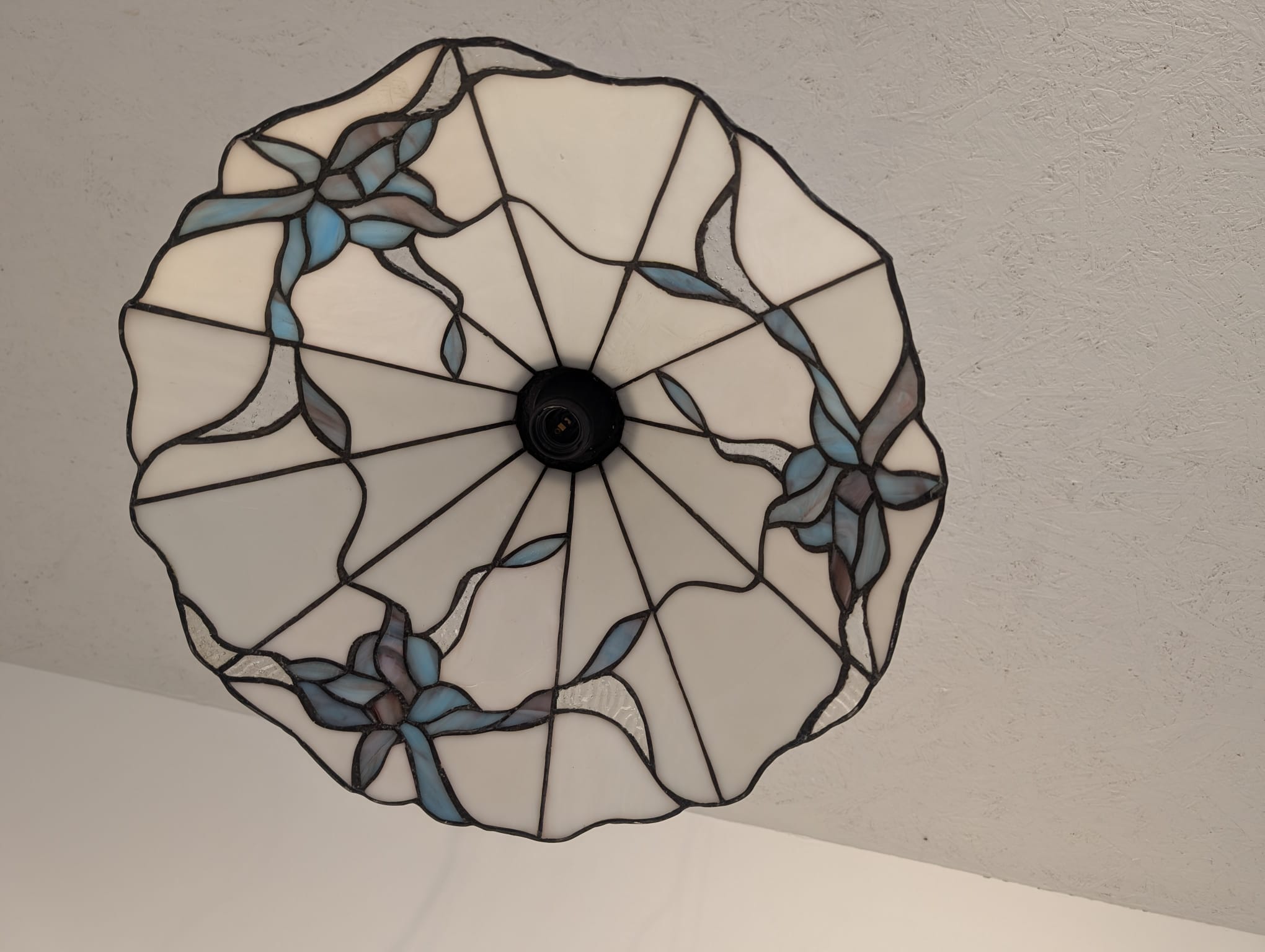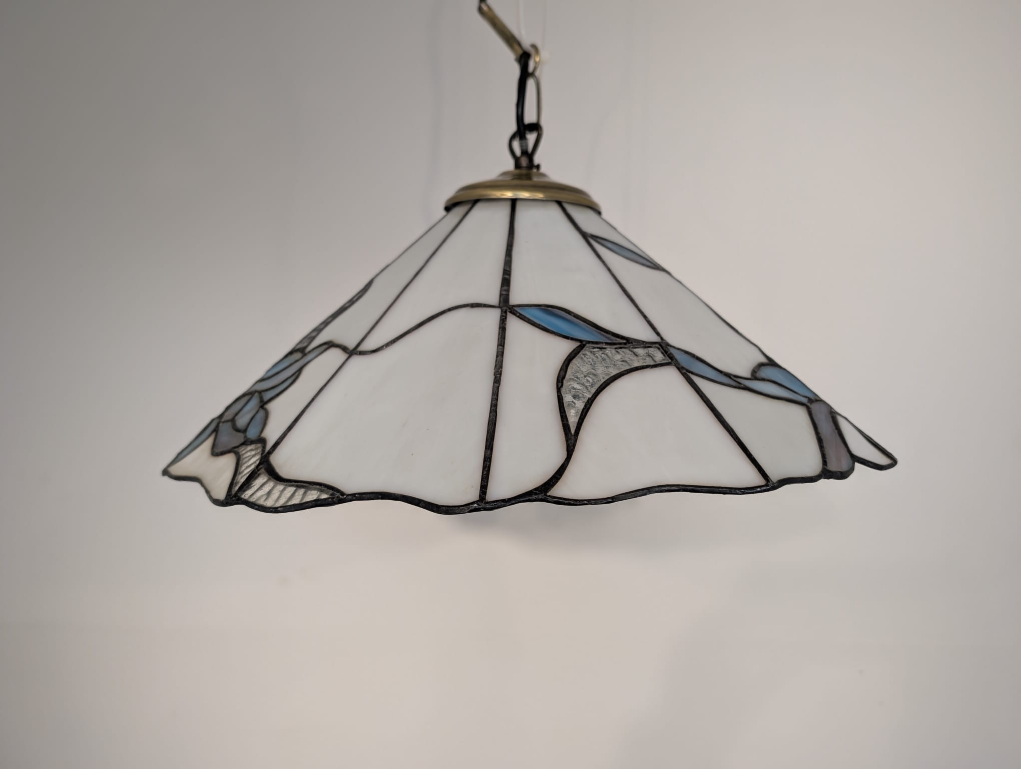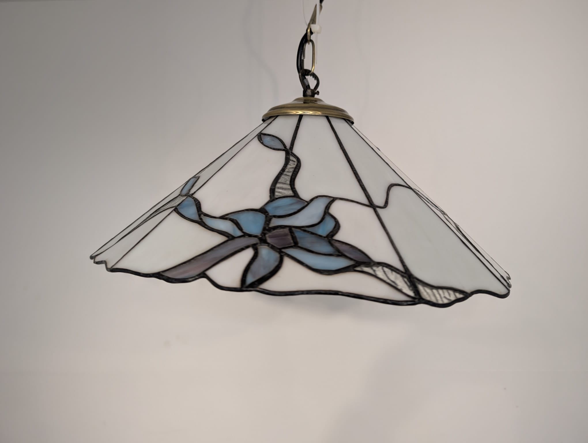 Stylowa lampa wisząca w stylu Tiffany’ego. Abażur wykonany z kolorowego szkła z motywem kwiatowym, który nadaje niepowtarzalny charakter oświetleniu. Lampa będzie pięknym dodatkiem do wnętrza, idealnie sprawdzi się w salonie, sypialni lub jadalni.