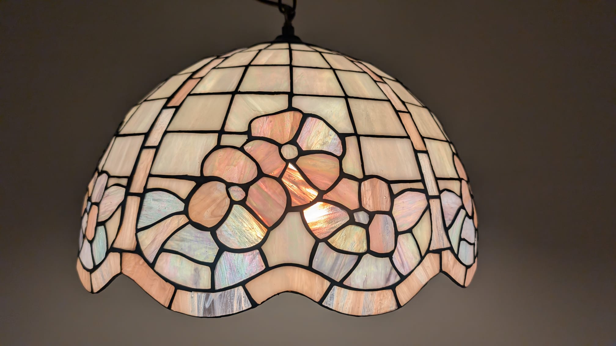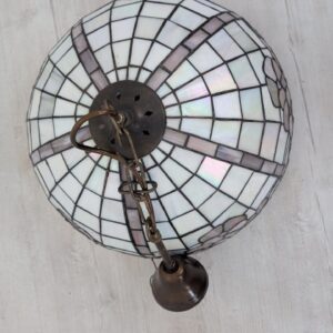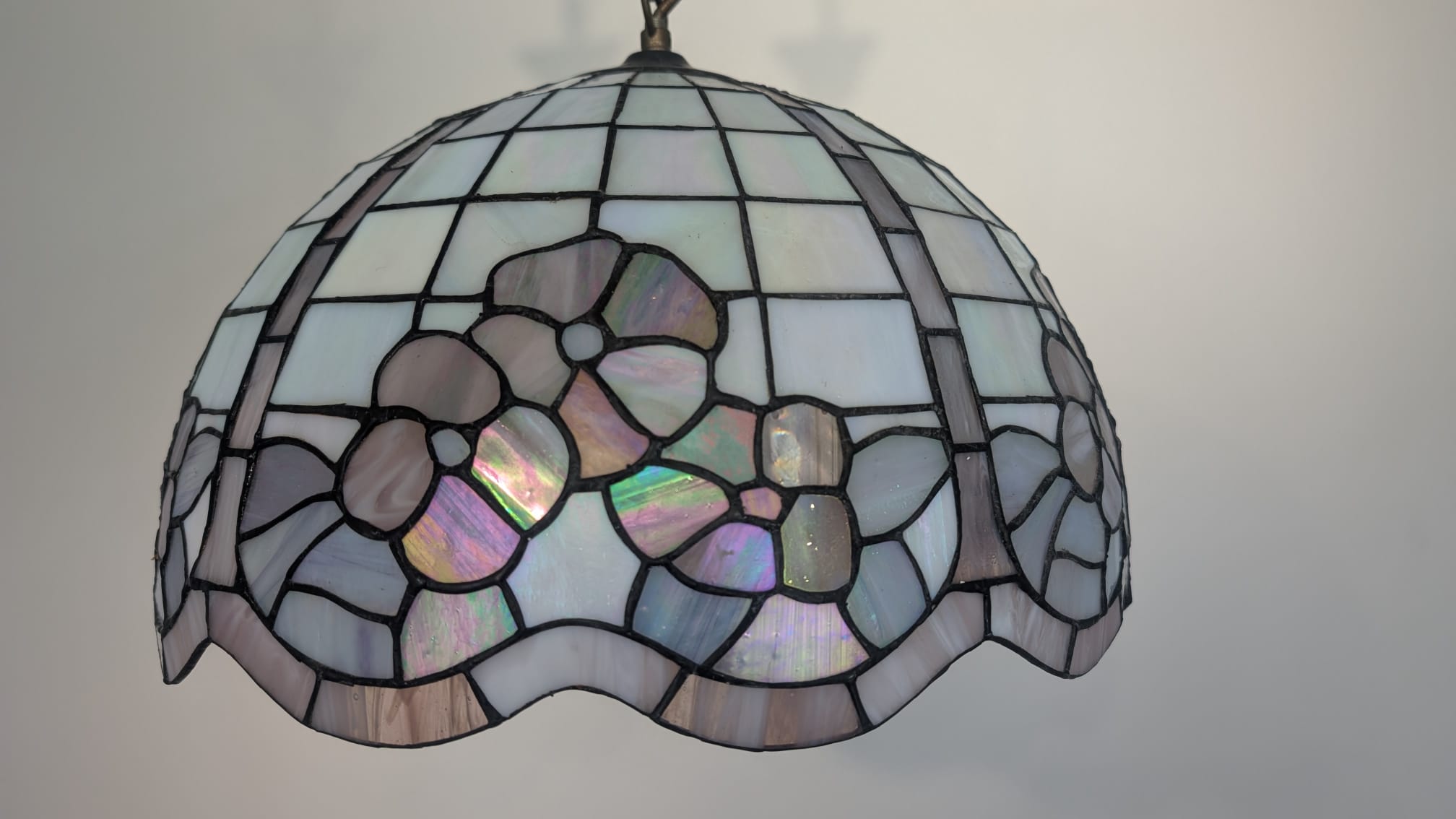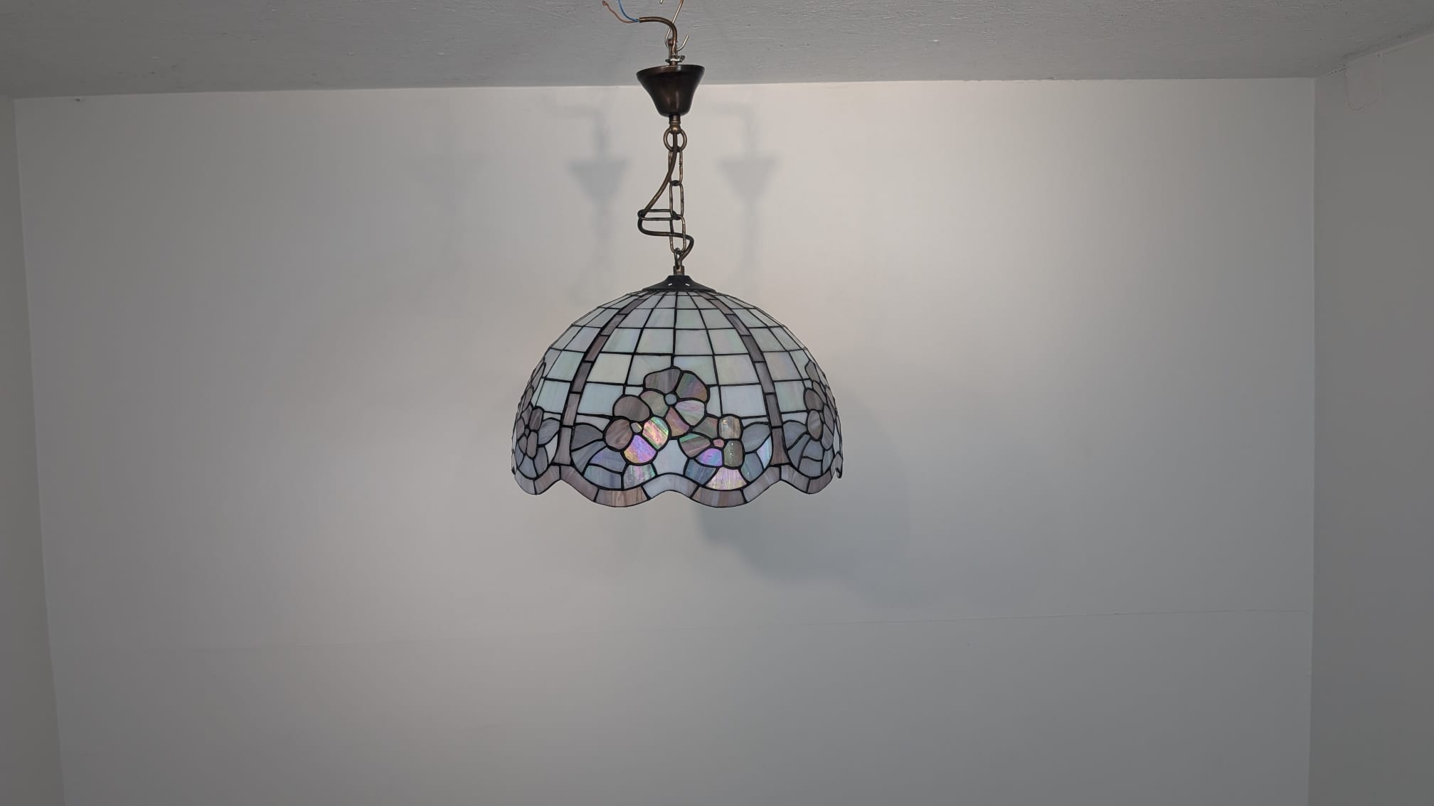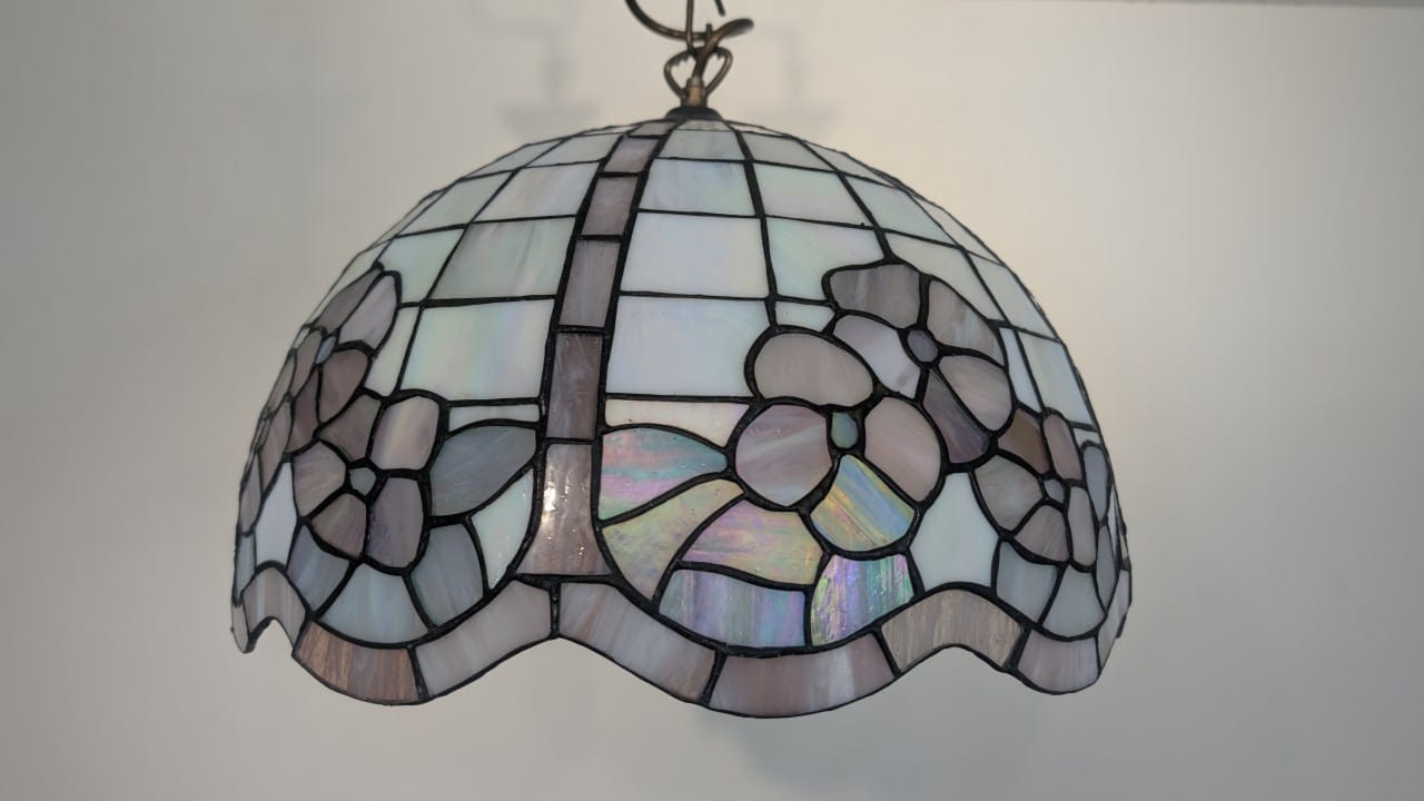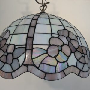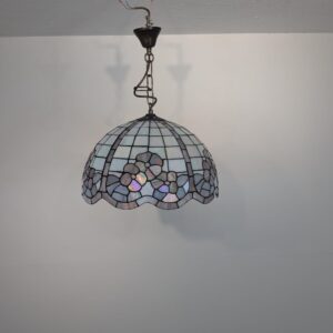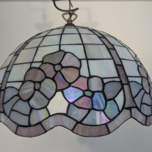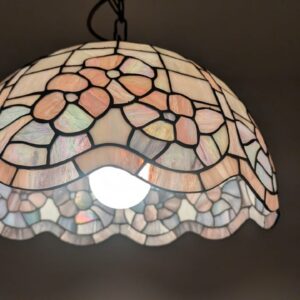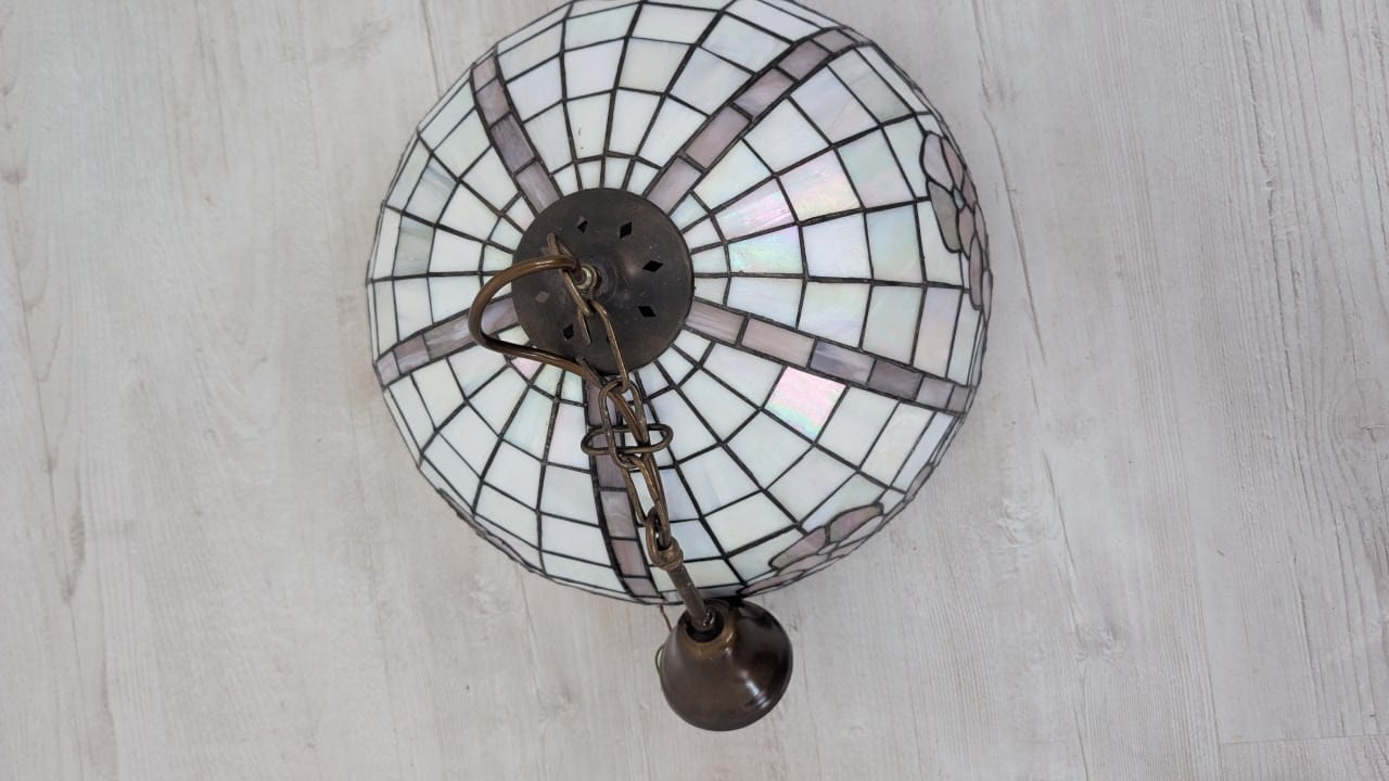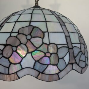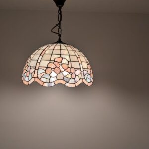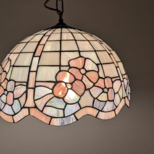 Stylowa lampa wisząca w stylu Tiffany z perłową kopułą i kwiatowymi motywami. Elegancki i dekoracyjny element oświetlenia, który doda uroku każdemu wnętrzu.