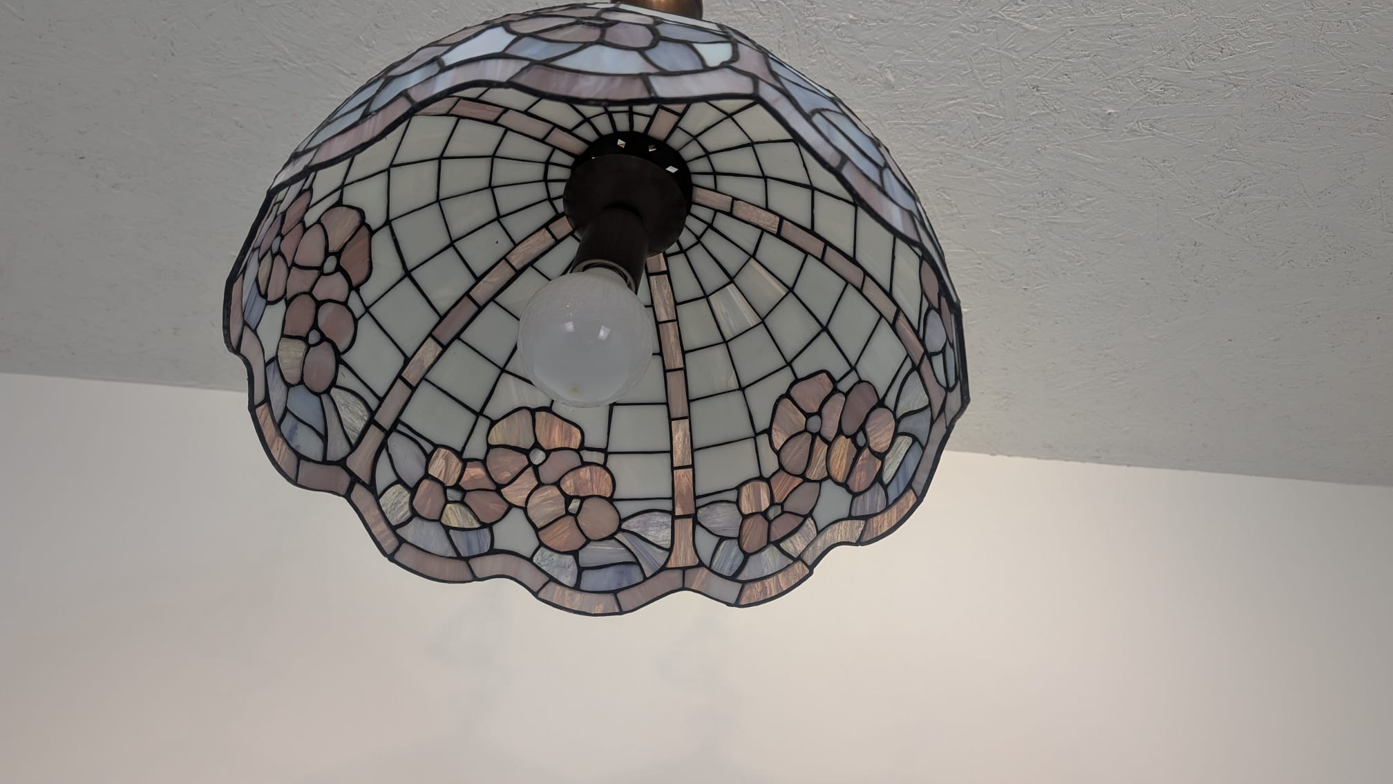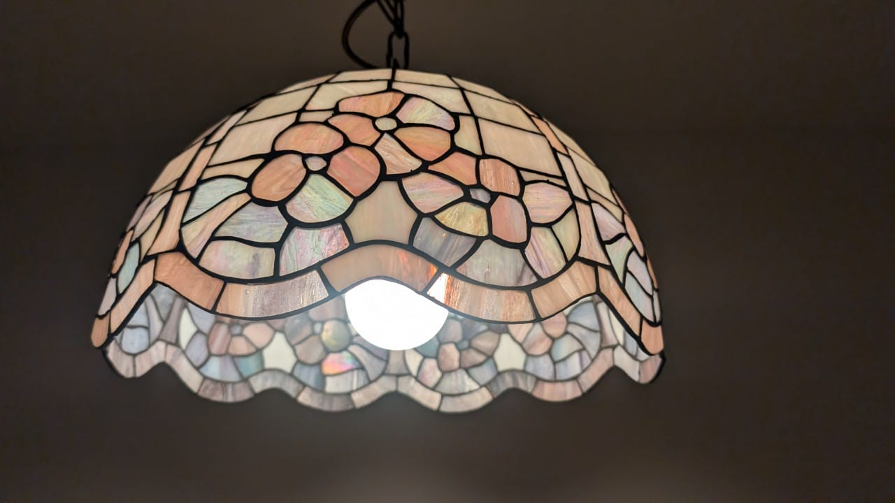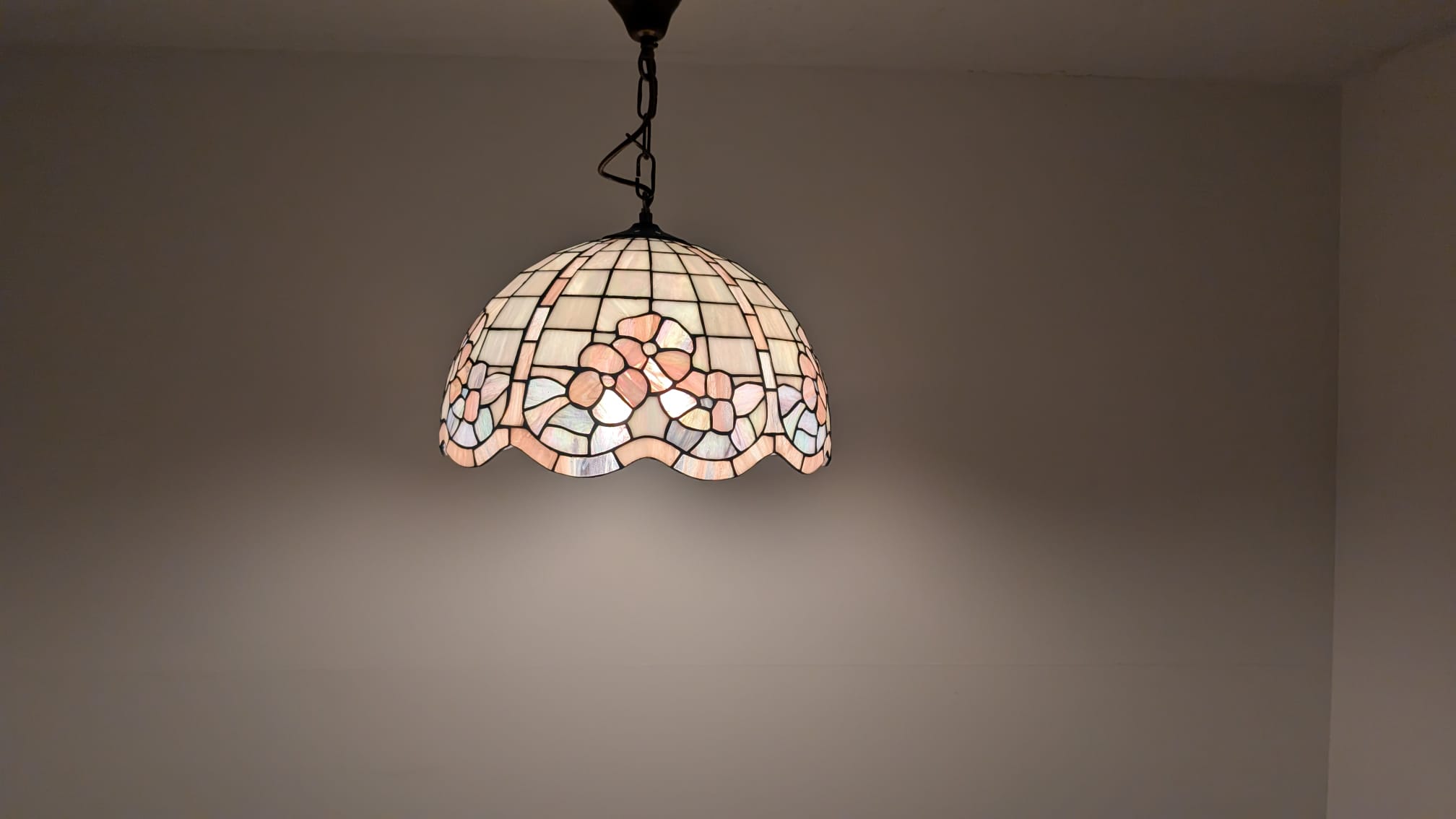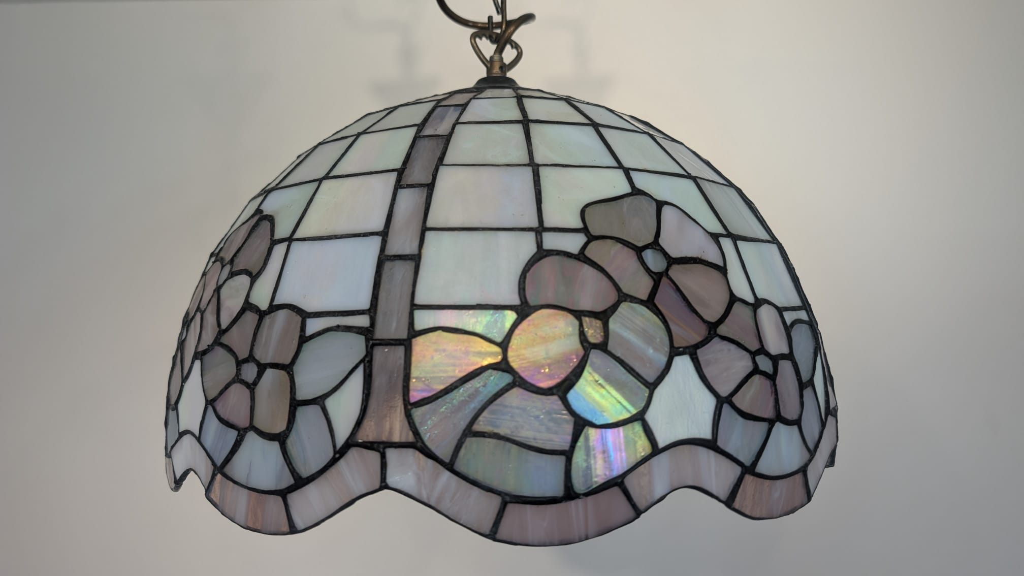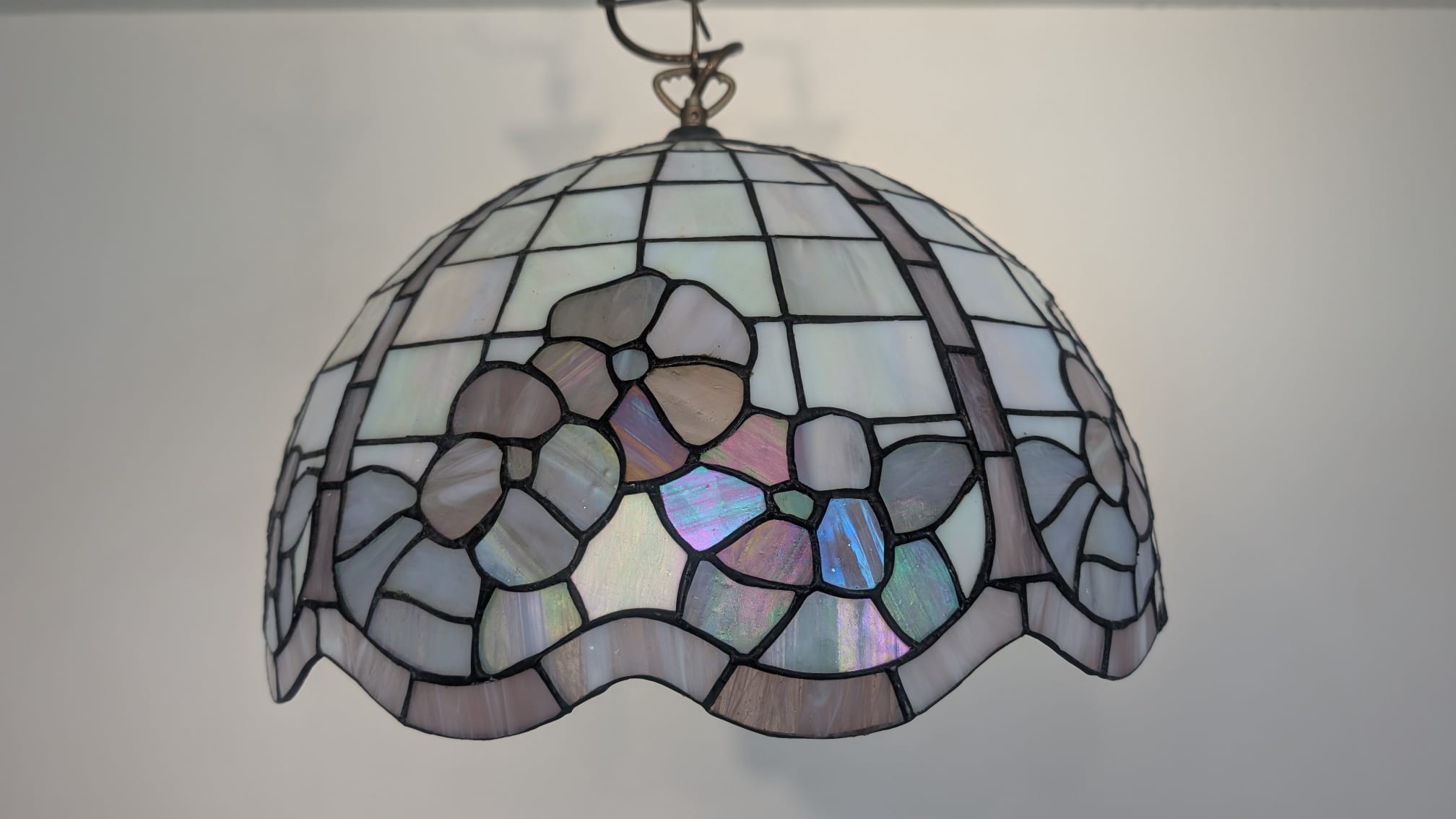 Stylowa lampa wisząca w stylu Tiffany z perłową kopułą i kwiatowymi motywami. Elegancki i dekoracyjny element oświetlenia, który doda uroku każdemu wnętrzu.